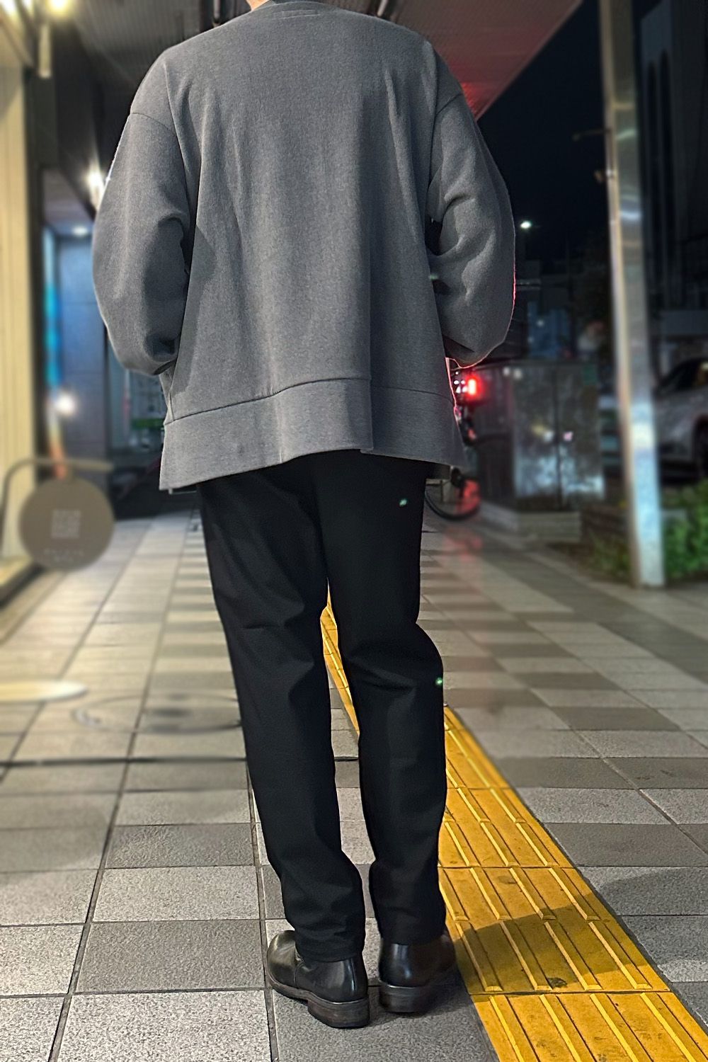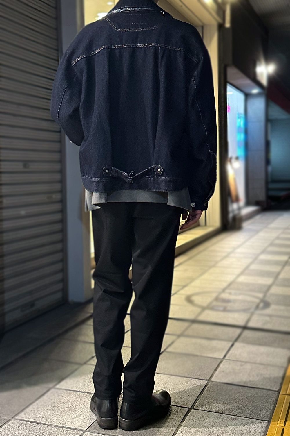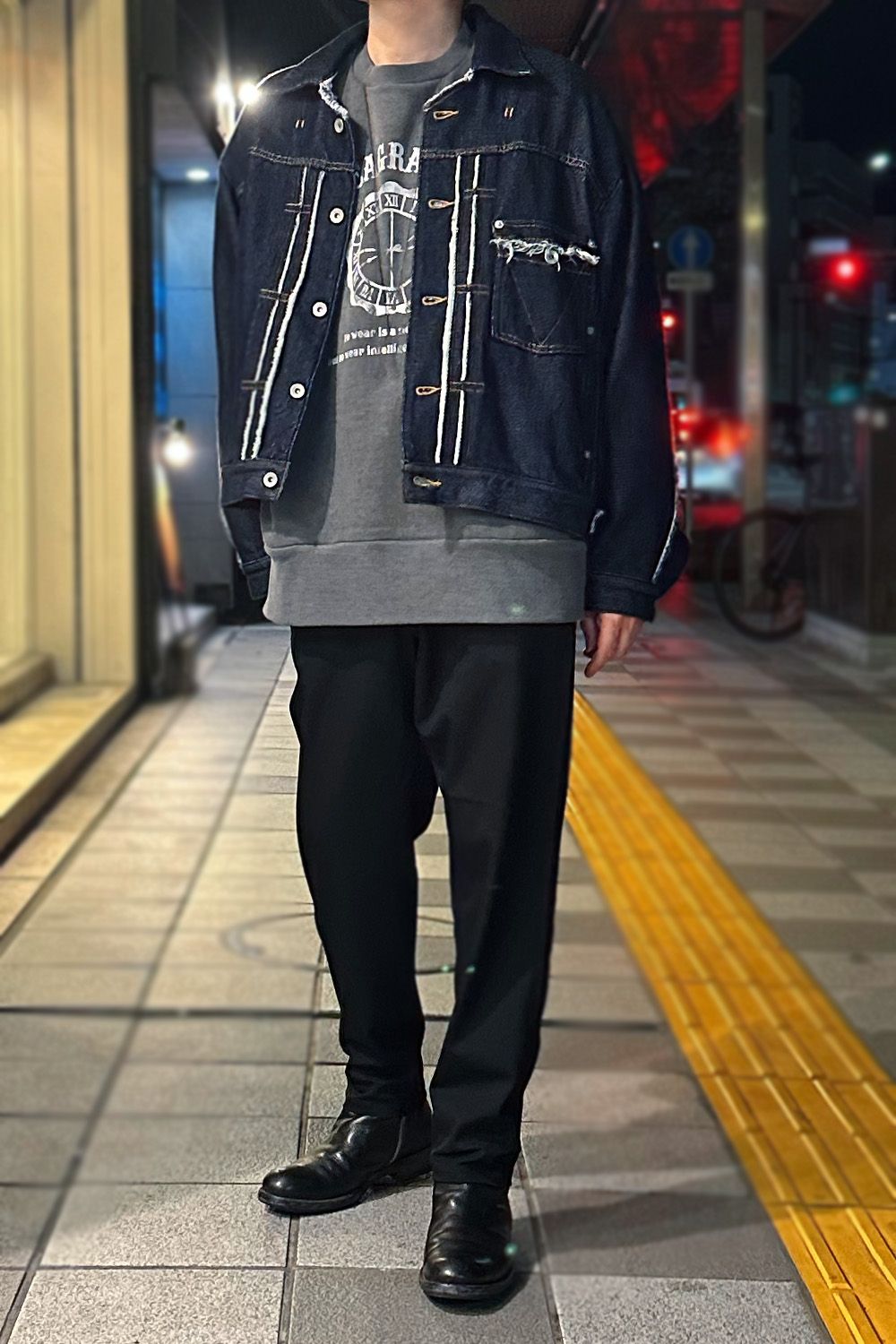 上記と同じパンツを着用していますが、オーバーサイズのトレーナーにすることでサイズ感や雰囲気の違うイメージのコーディネート、ブラックではなくグレーのトレーナーとインディゴのデニムジャケット、最初のコーディネートと比べますとトップスはオーバーに、ボトムは細くなっていますがただ細いパンツではなく、ウエスト、足回りなどはルーズに作られていますのでオーバーのトップスから急に細くならず、オーバーサイズのトップスの流れから足先に向けてテーパードすることで上下の違和感を緩和することもできるので、極太パンツは無理だけど、太いパンツを穿きたい方にもおすすめさせていただいています!!