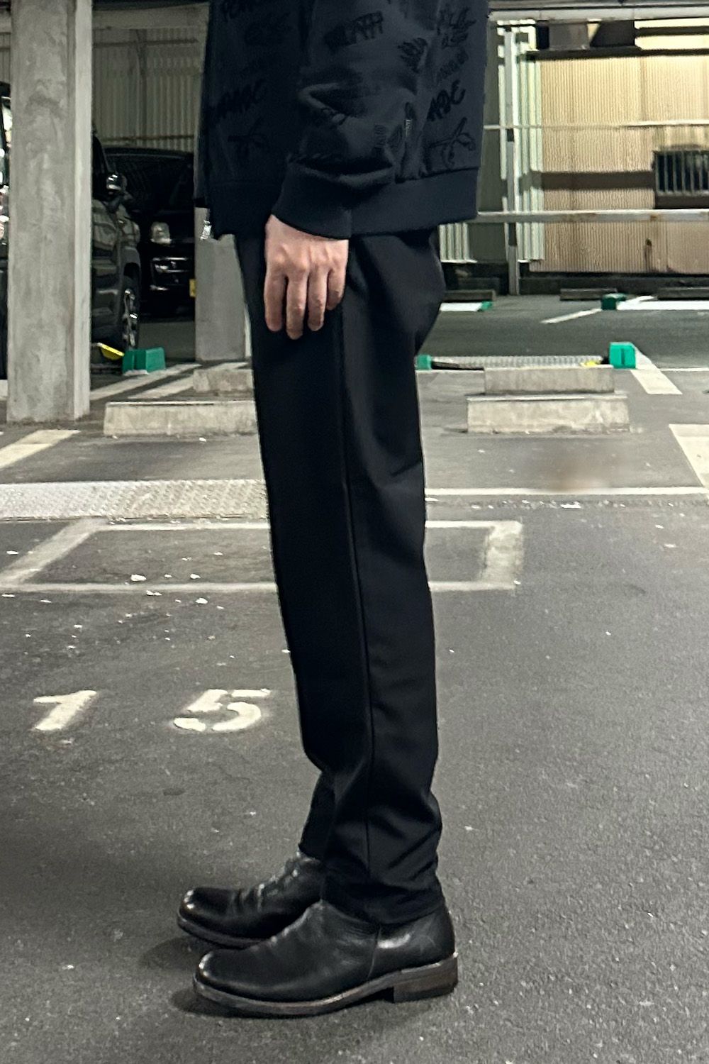 シワになりにくい高機能ジャージ素材が使用されていて、品のある見た目から綺麗めからカジュアルなスタイルに幅広く対応するワイドパンツ、テーパードシルエットで様々なシューズと馴染みも良い便利なアイテムです。