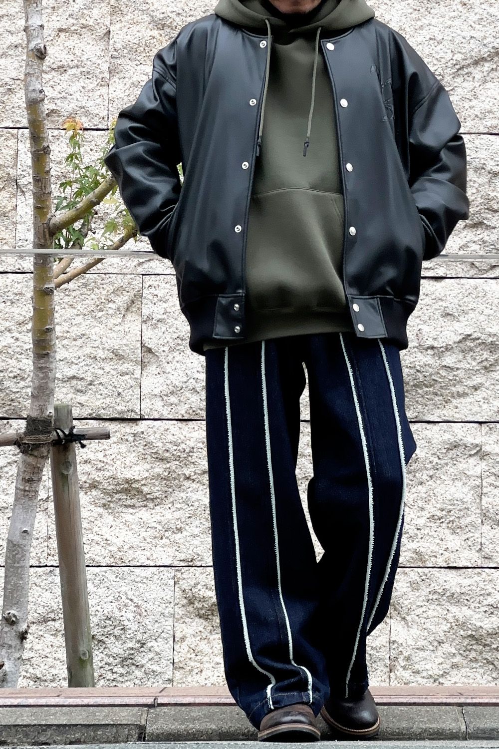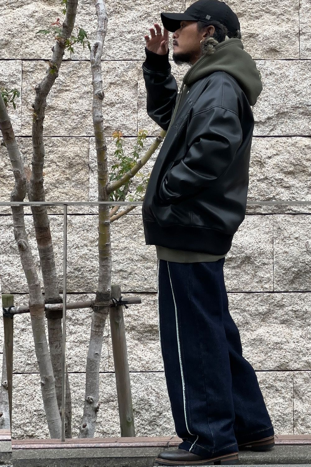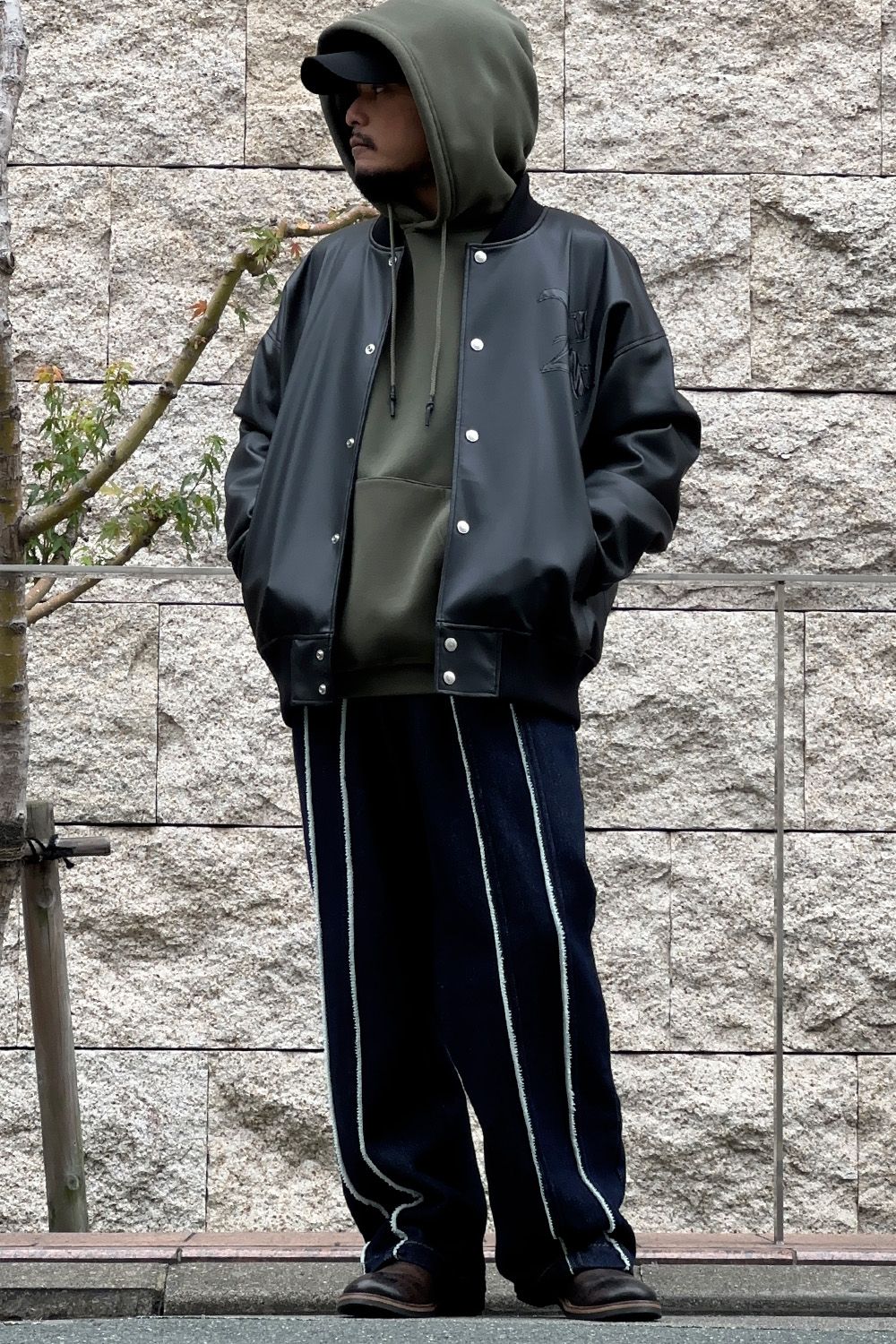 スタジャンとスウェットのパーカ、ワイドデニムとエンジニアブーツ、元々好きなワイルド系のスタイル。秋冬と言えばレザーやスタジャンを着たくなります。そこまで気温が下がらなかったりする最近の冬、本革と違い軽く、手入れも必要なく、オーバーサイズ、あると結構便利でおすすめのスタジャンです。
