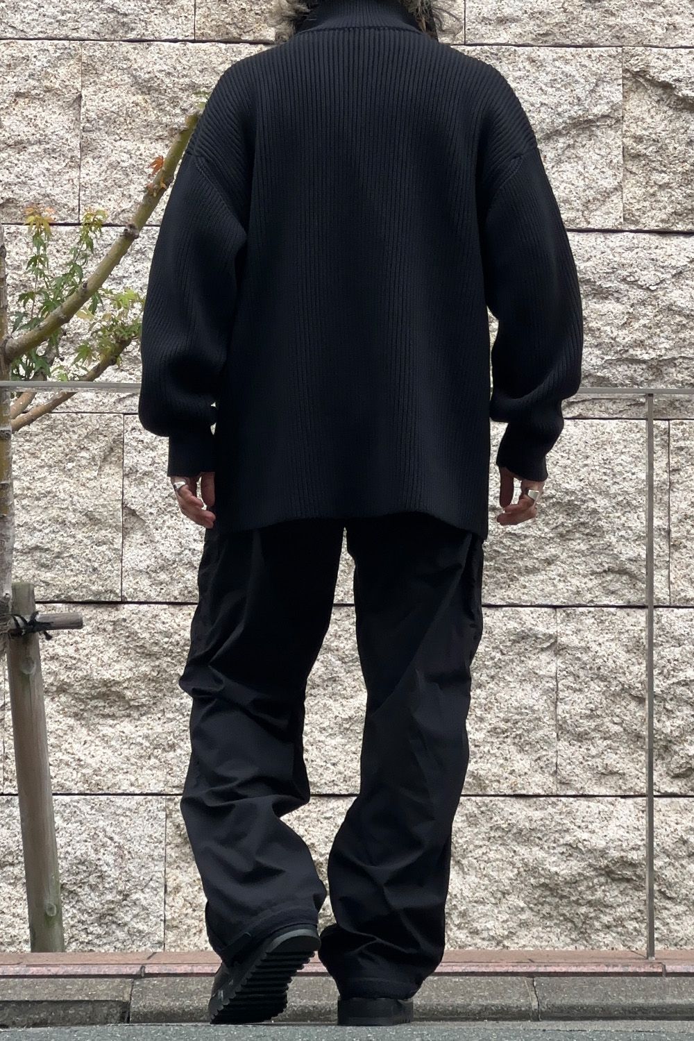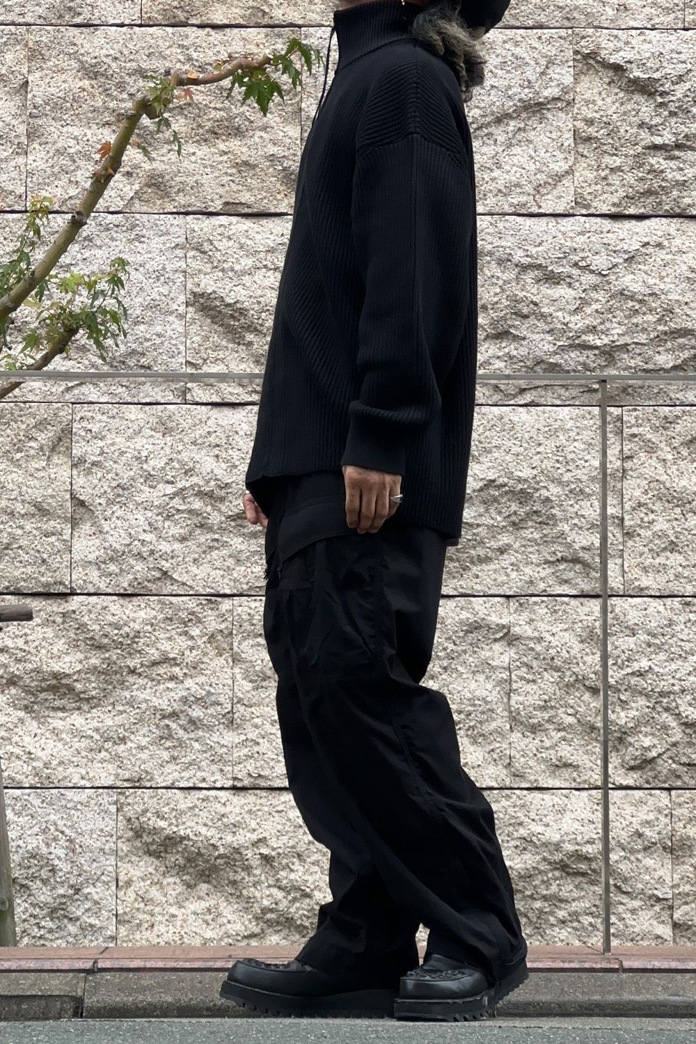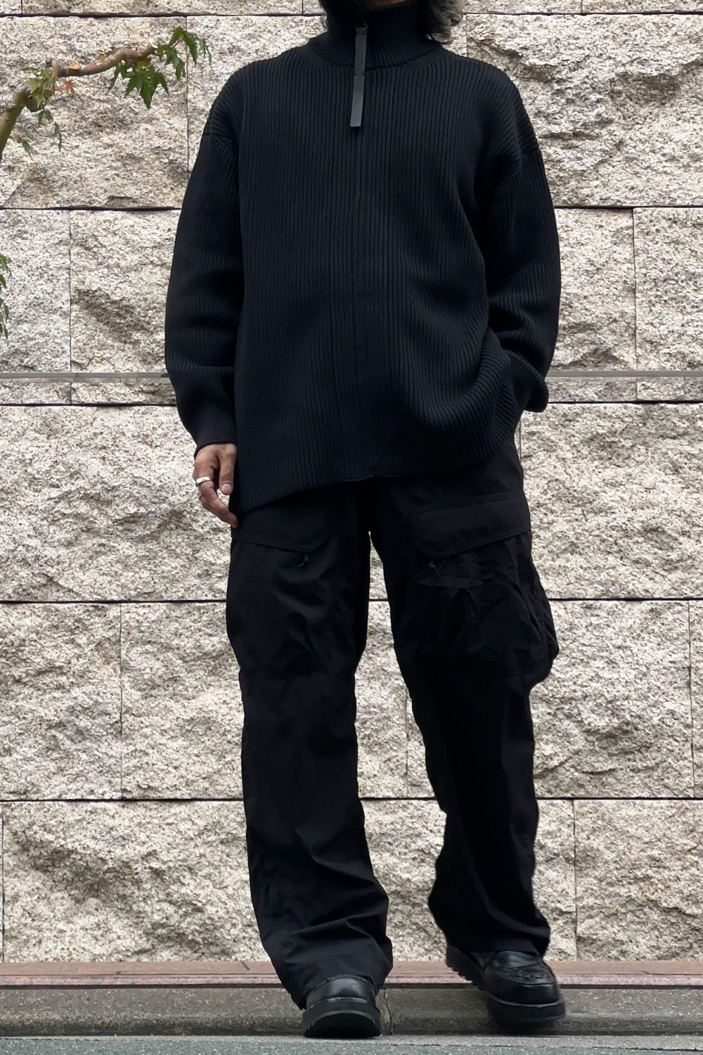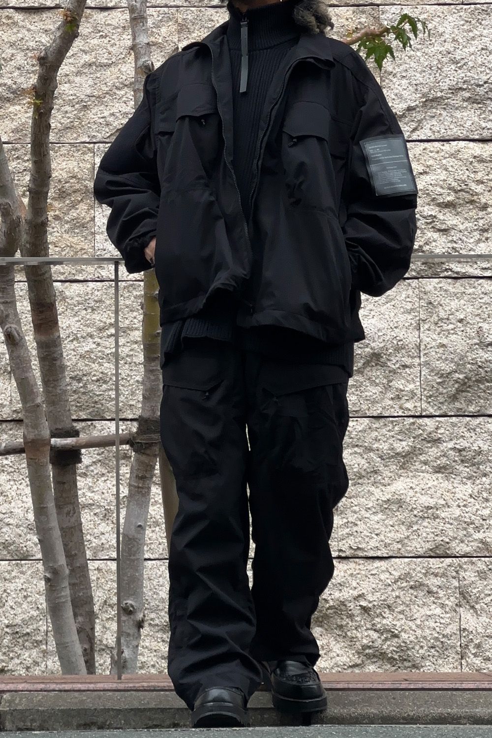 ブラックのニットをミリタリーブルゾンとカーゴパンツのセットアップのインナーに、軽量アウターのインナーにすることで保温性を確保したスタイルです。