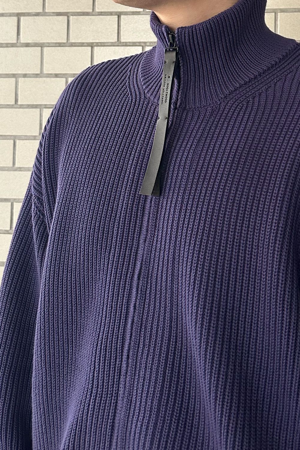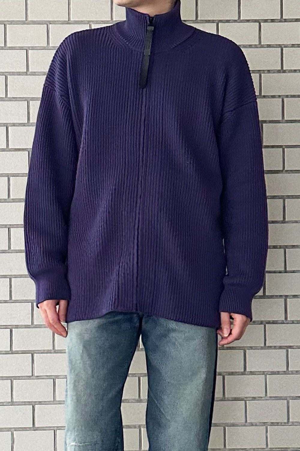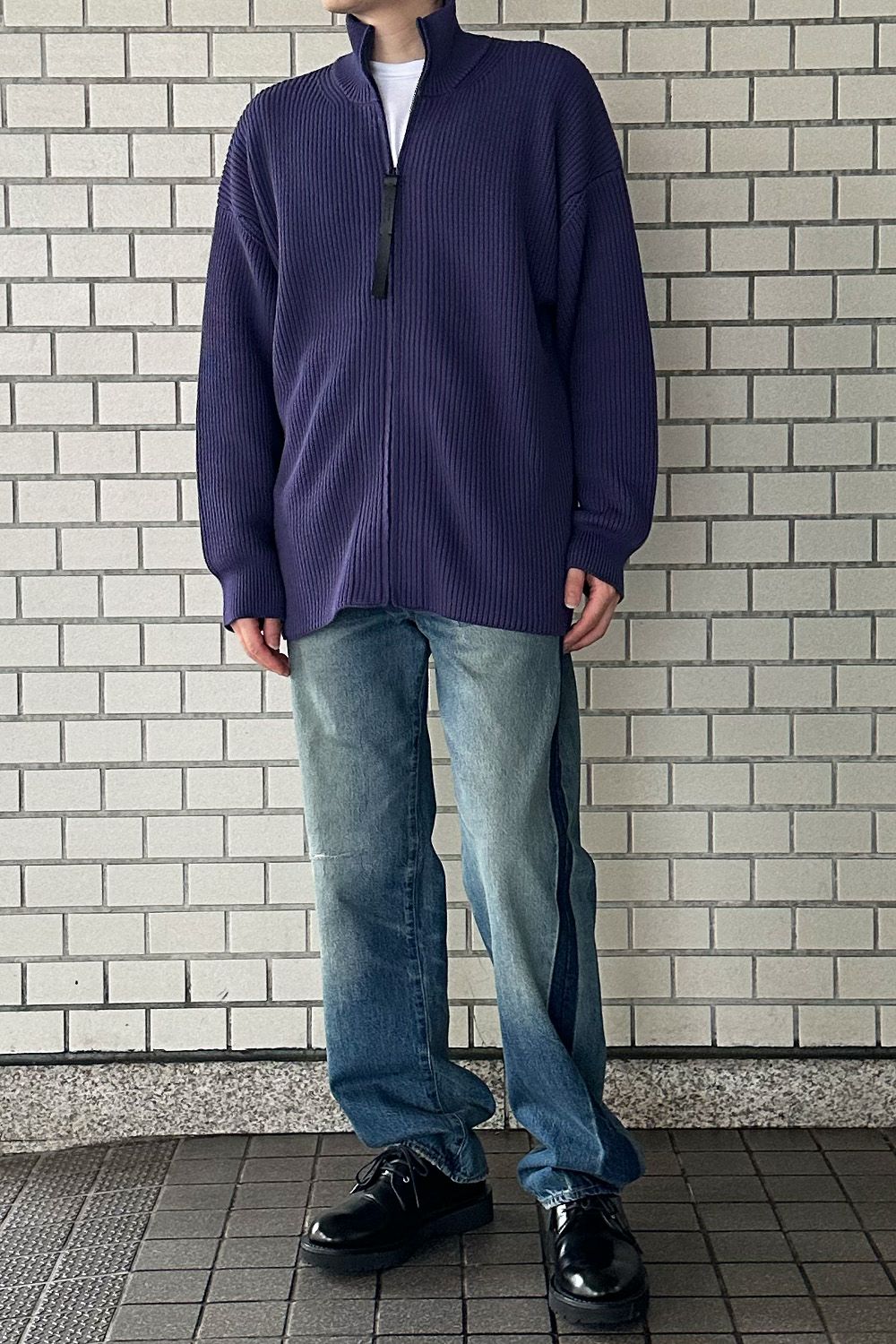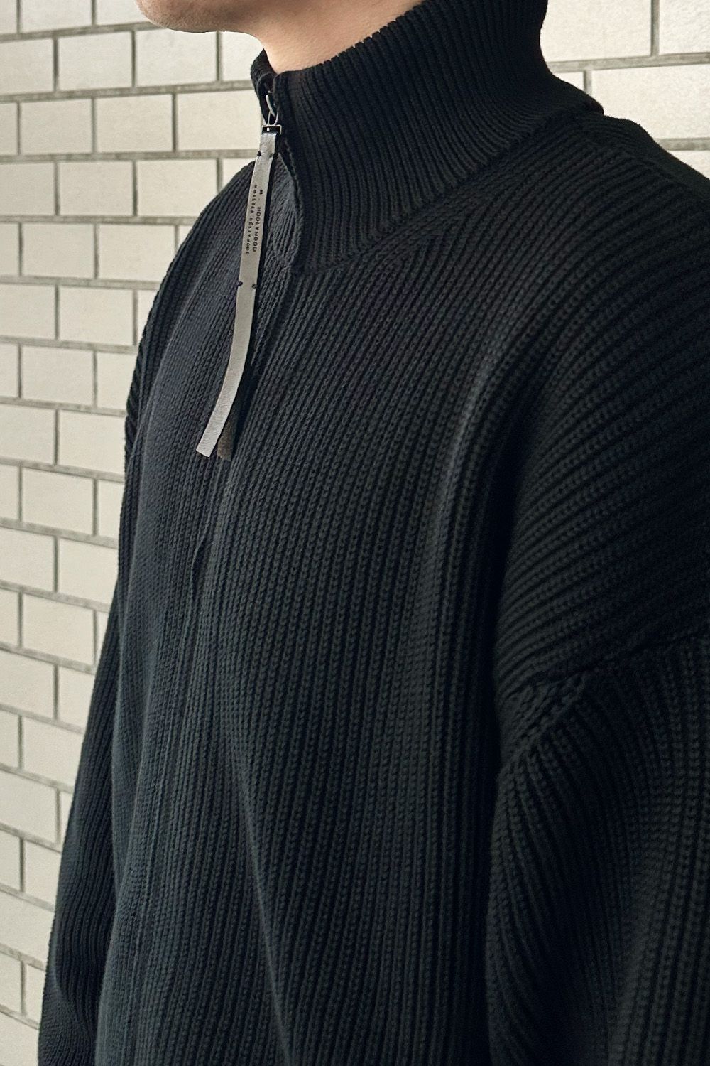全体的なシルエットはオーバーサイズ、程よい厚みのコットンニットのため秋冬リリースのアイテムですが夏以外は着用が可能です、首周り、袖口は細いリブとなっていますので重ね着もしやすく便利なアイテムです。フロントのレザーの引き手もワンポイント、コーディネートのアクセントとなります。