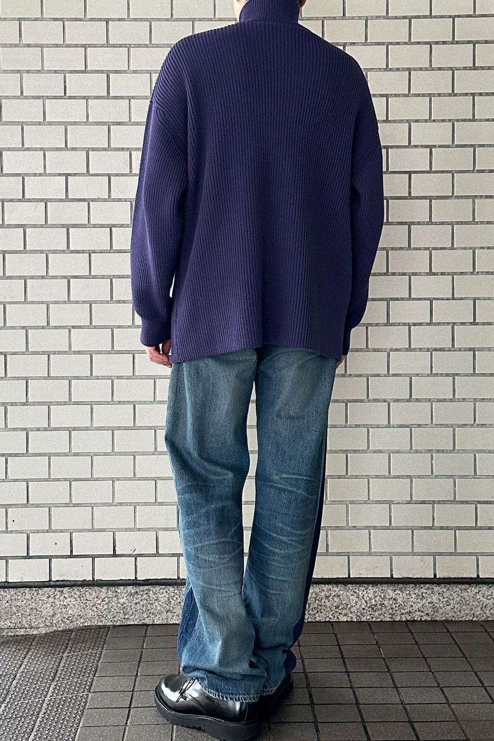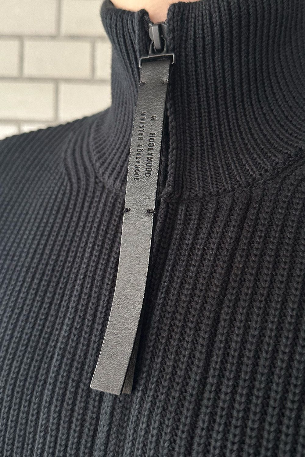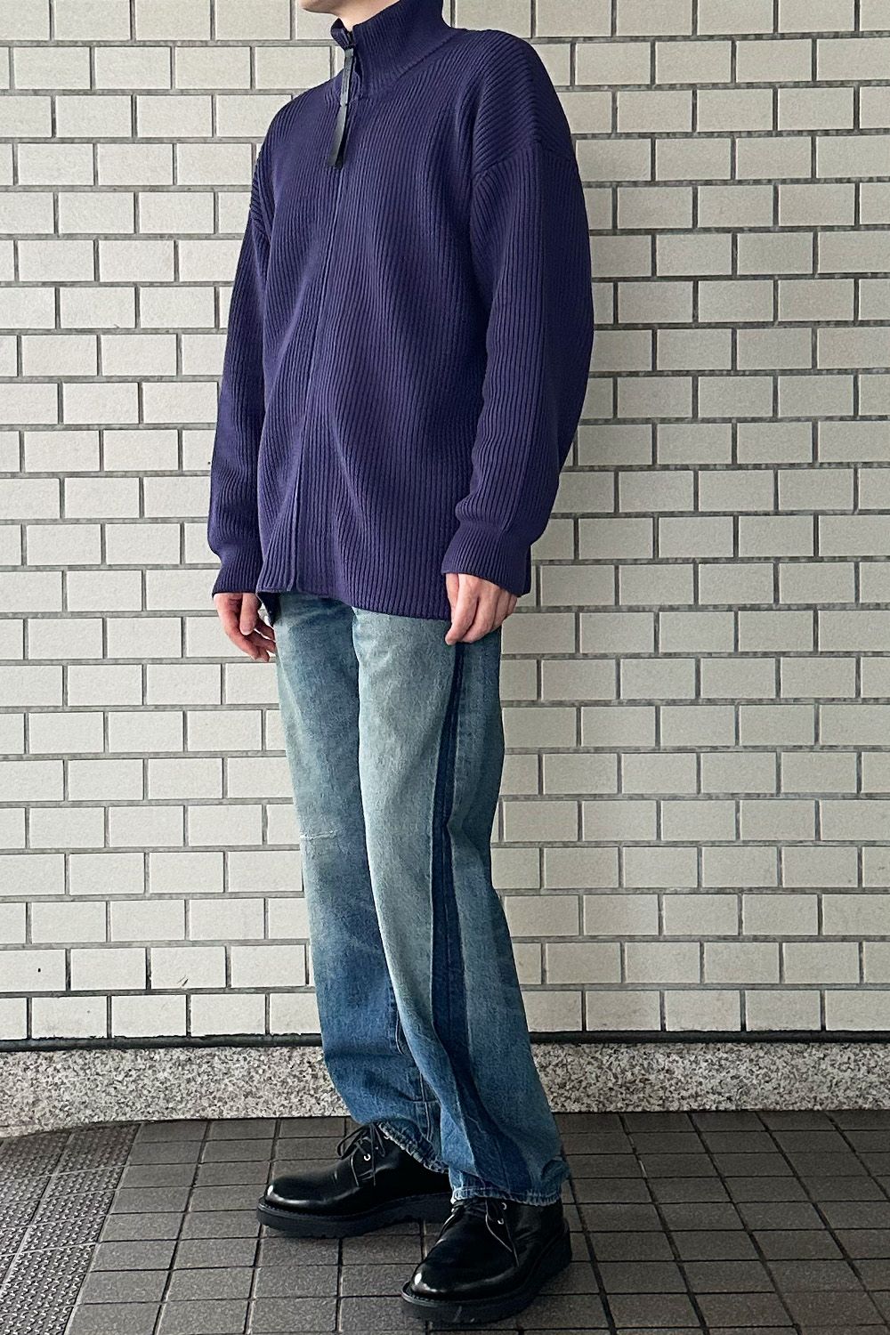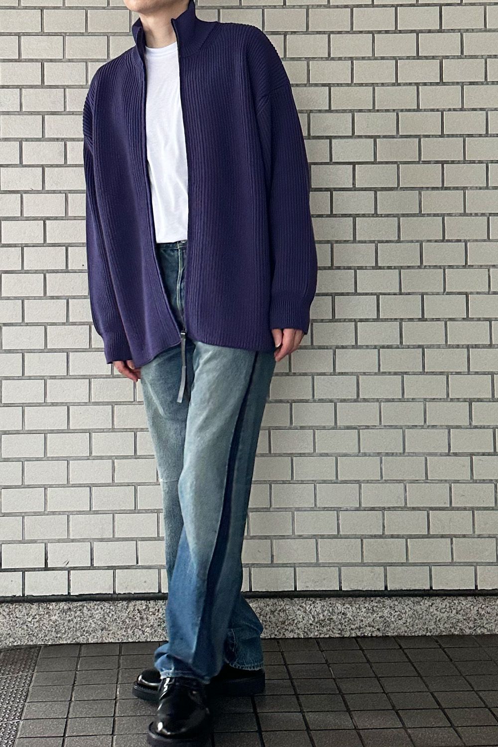 全体的なシルエットはオーバーサイズ、程よい厚みのコットンニットのため秋冬リリースのアイテムですが夏以外は着用が可能です、首周り、袖口は細いリブとなっていますので重ね着もしやすく便利なアイテムです。フロントのレザーの引き手もワンポイント、コーディネートのアクセントとなります。