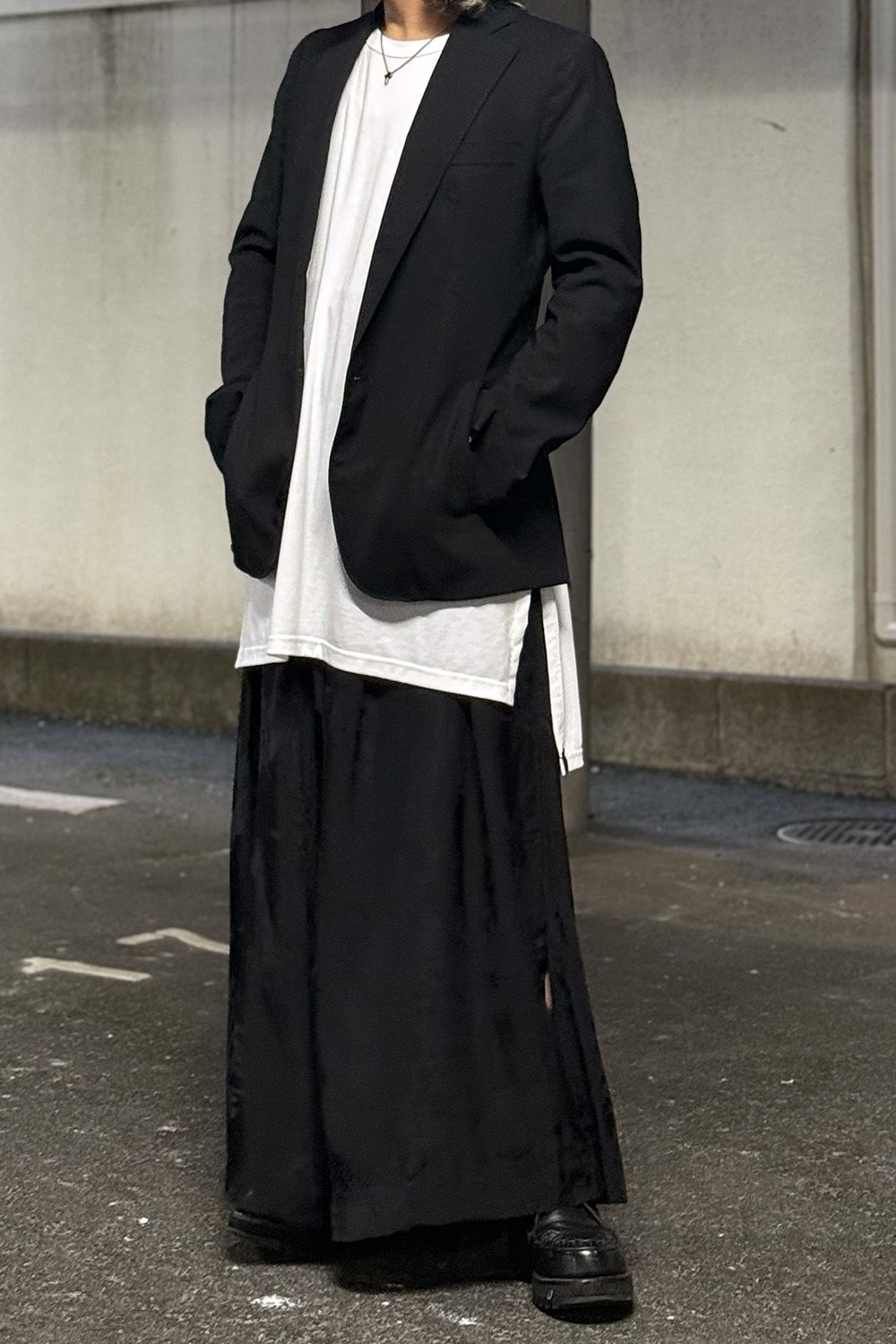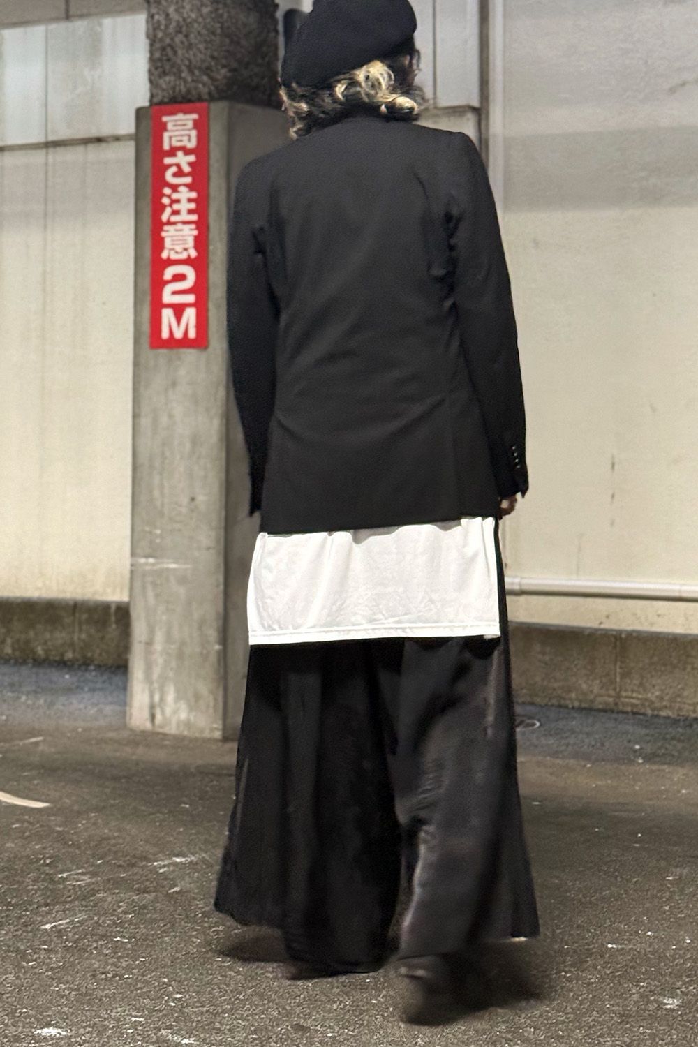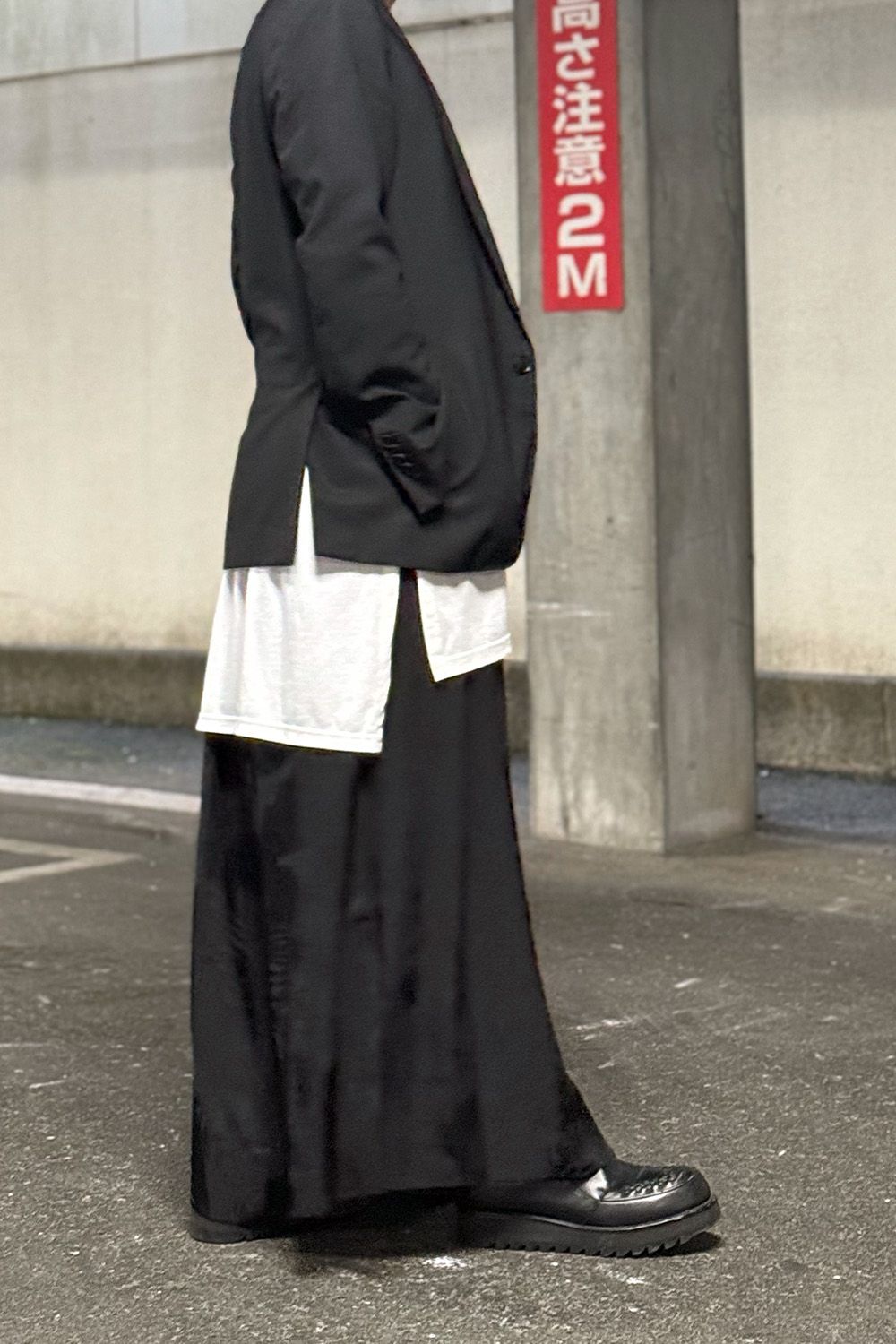今日は日頃から愛用している定番のコンパクトなシルエットのジャケット、ドルマンスリーブのロングTシャツ、アウターはコンパクトにパンツはワイドシルエットのAライン、モードテイスト、モノトーンのアイテムを取り入れたコーディネートです。