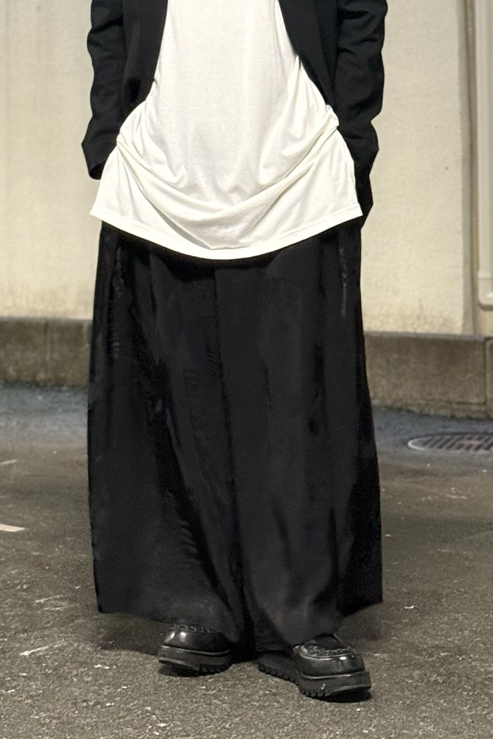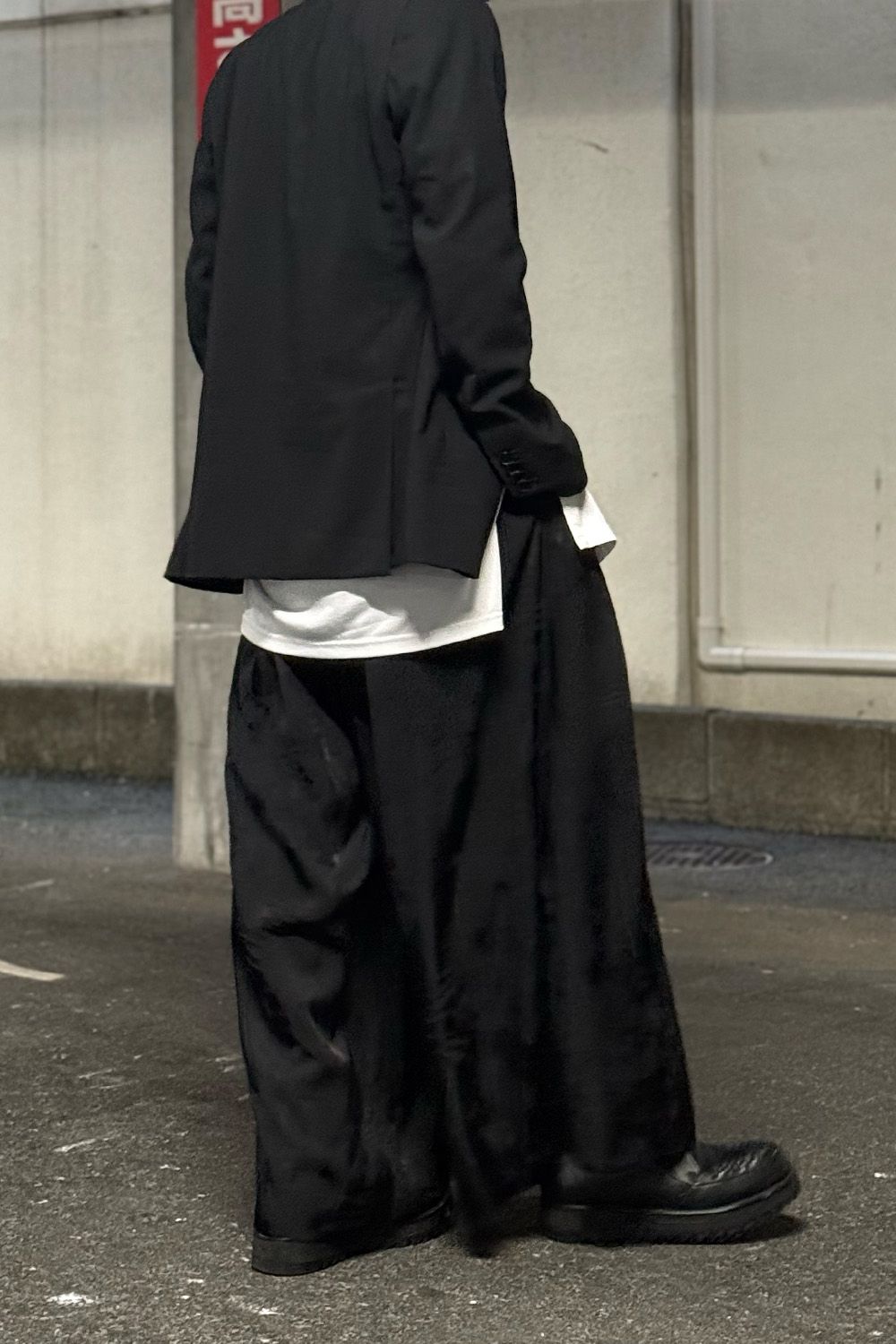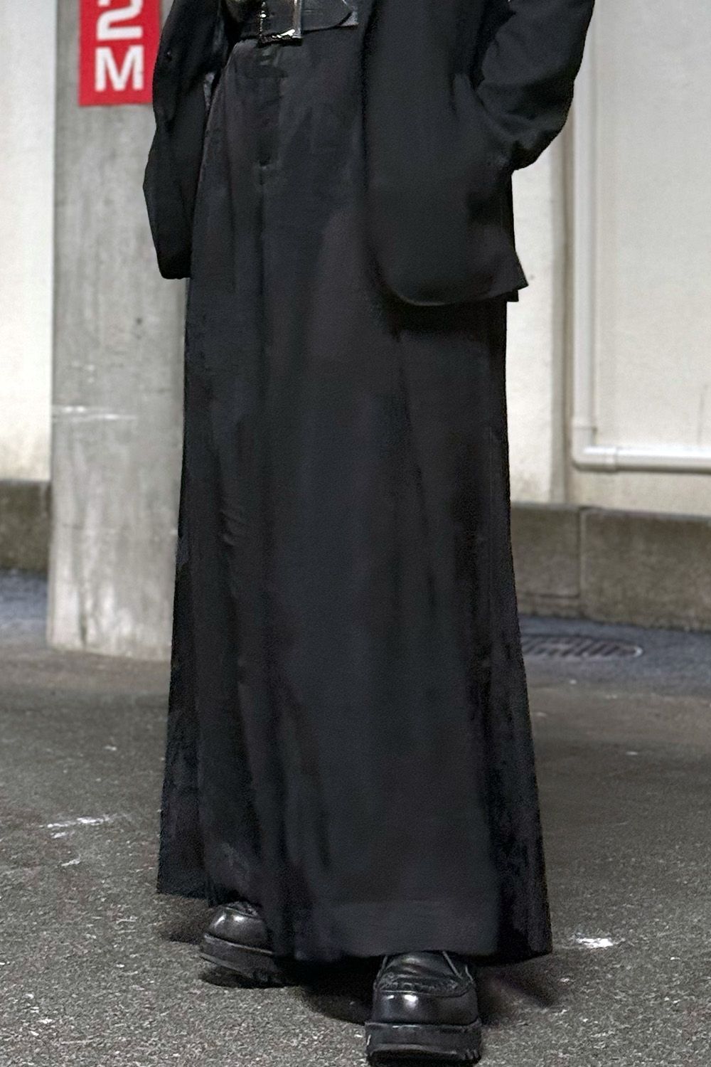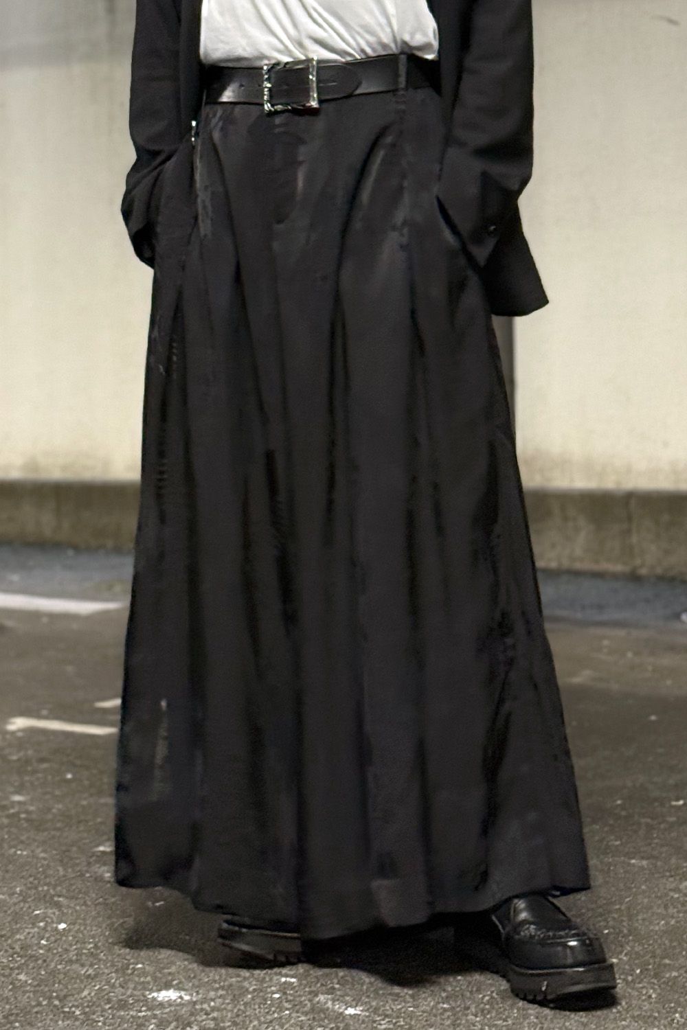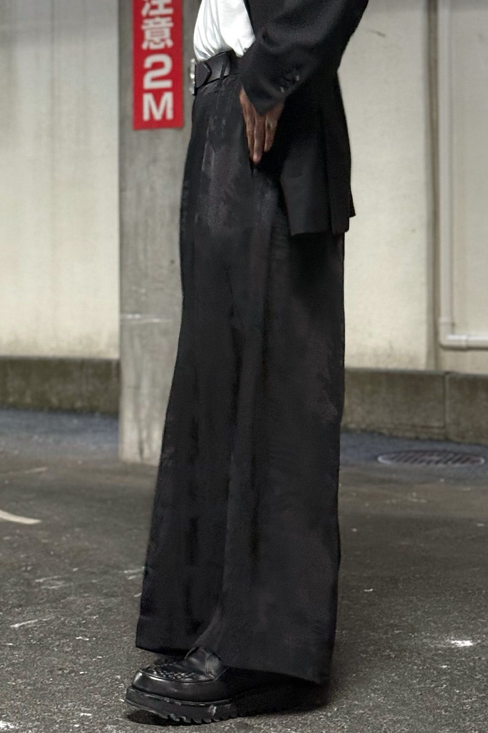 柄の部分だけオパール剤という薬剤で繊維を溶かし透かし柄を表現するオパール加工にて蝶などの柄が表現された最近の定番的な袴のような分量のあるワイドスラックスです。
