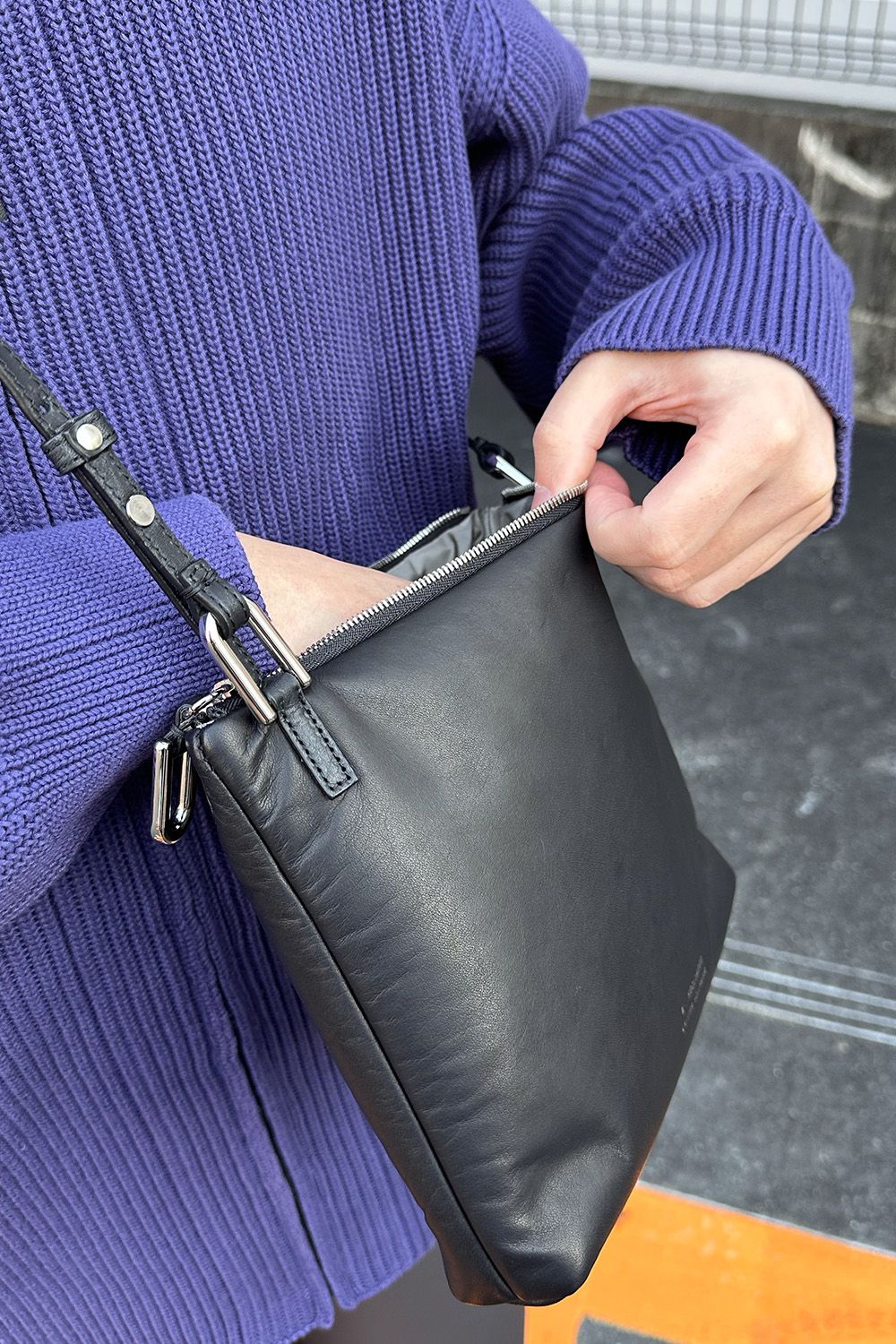 大きすぎず、小さすぎないシンプルに使い勝手のいいショルダーバッグ、クッション性のあるレザーで柔らかく荷物を入れた際に安心感もあります。ベルトやジップ部分の金属パーツにキーホルダーやウォレットコードなどを付け今風のアレンジもしやすいアイテムです。