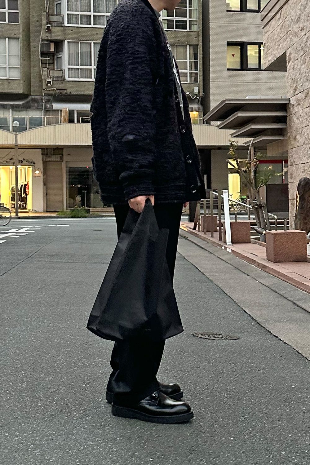 冬らしいコーディネートに、アウターらしく使える裏地付きのカーディガン、オーバーサイズのトレーナーとの組み合わせでアウター、トップスはカジュアルに、そのかわりにウールのスラックスとブーツでカジュアルすぎない落ち着いたスタイル、先日ご紹介したレザーショッピングバッグもアクセントになっています。