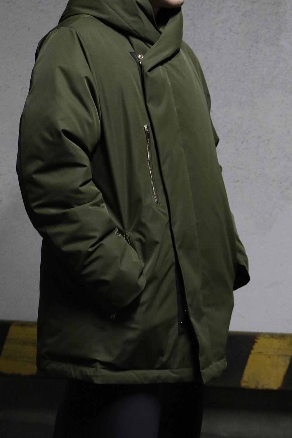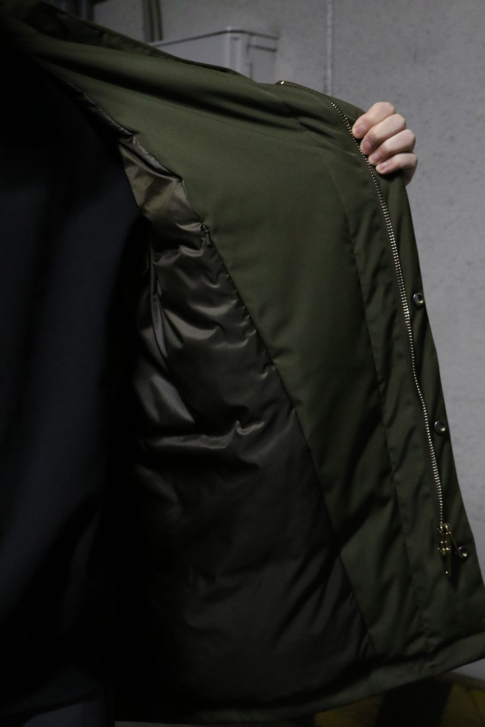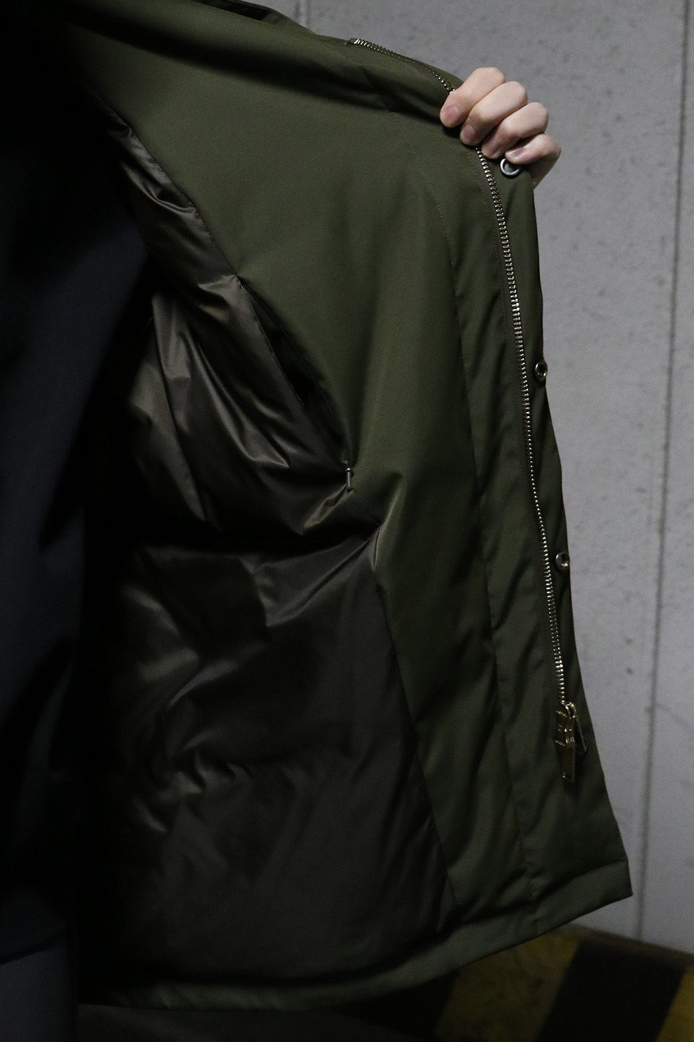 ナチュラルストレッチの効いた軽量ポリエステル素材、ラップコート型のダウン、ダウン分量も多く非常に暖かいダウンコートです。イタリアのラッカー二社製のファスナーもアクセントとなっています。