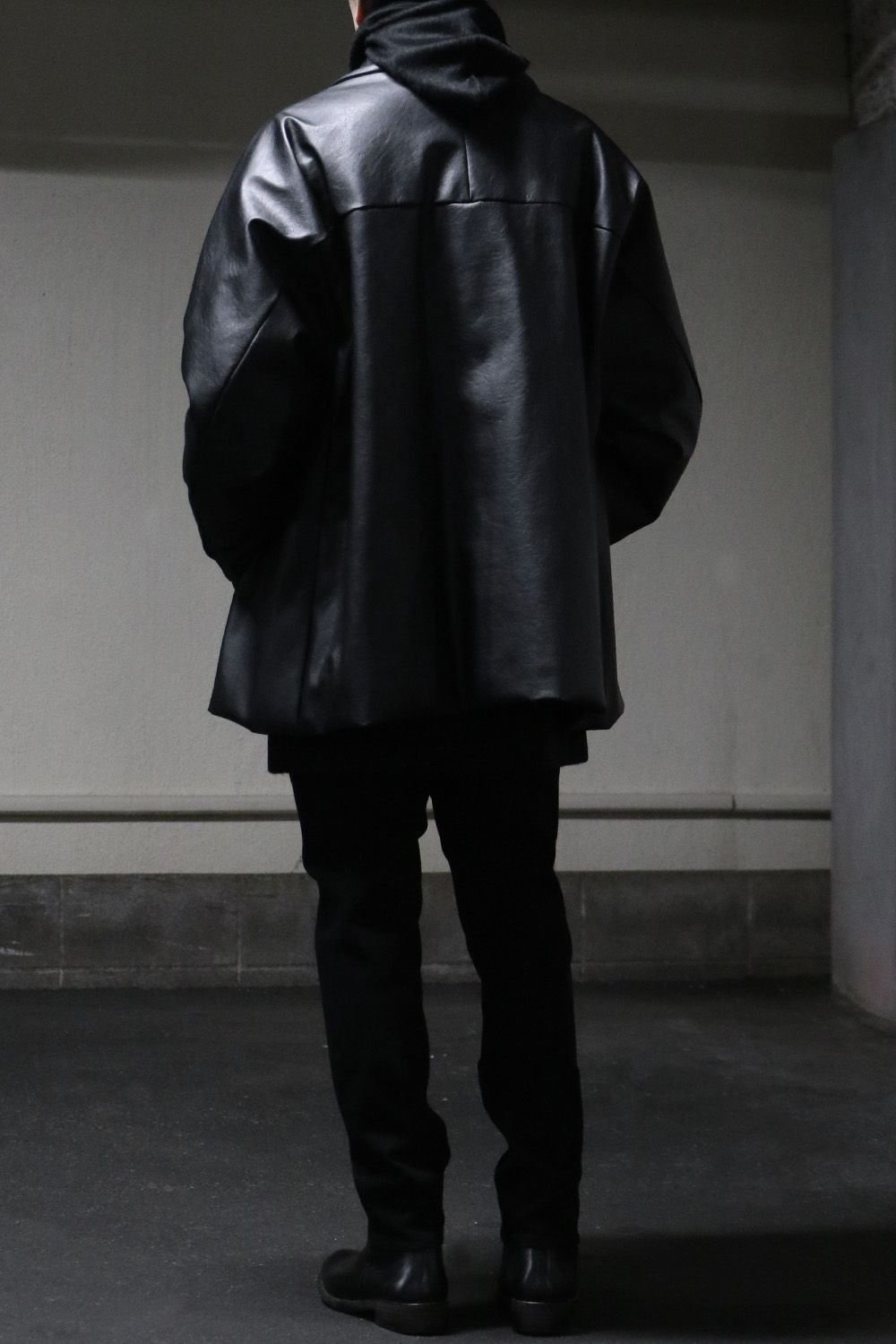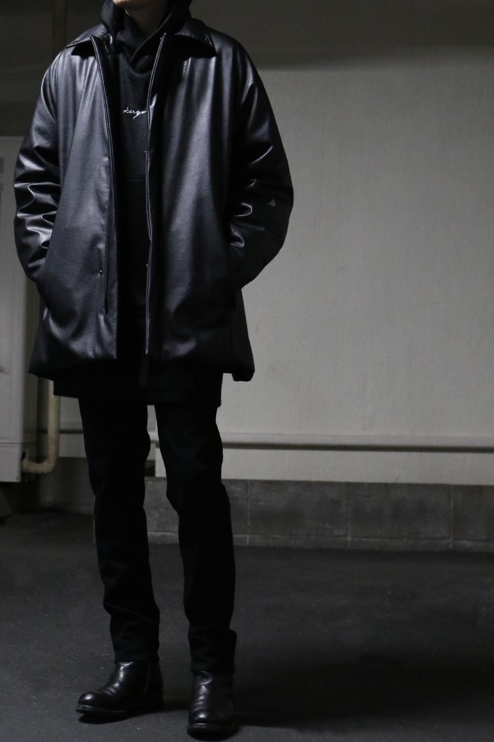オールブラックのモードテイストのイメージを残しつつ、軽く雰囲気のあるレザーのコートは中綿にプリマロフトを備え、冬の防寒性も確保、タイトなデニムとブーツで足元はシャープにボリュームのあるコートを使いやすく組み合わせたコーディネートです。