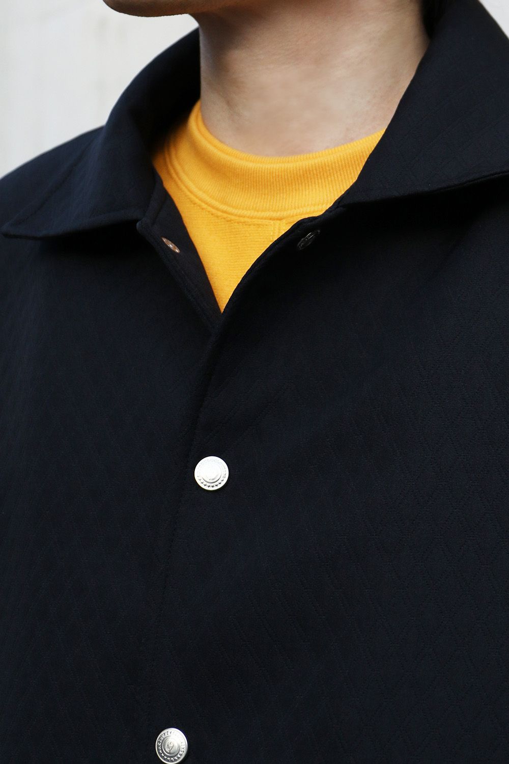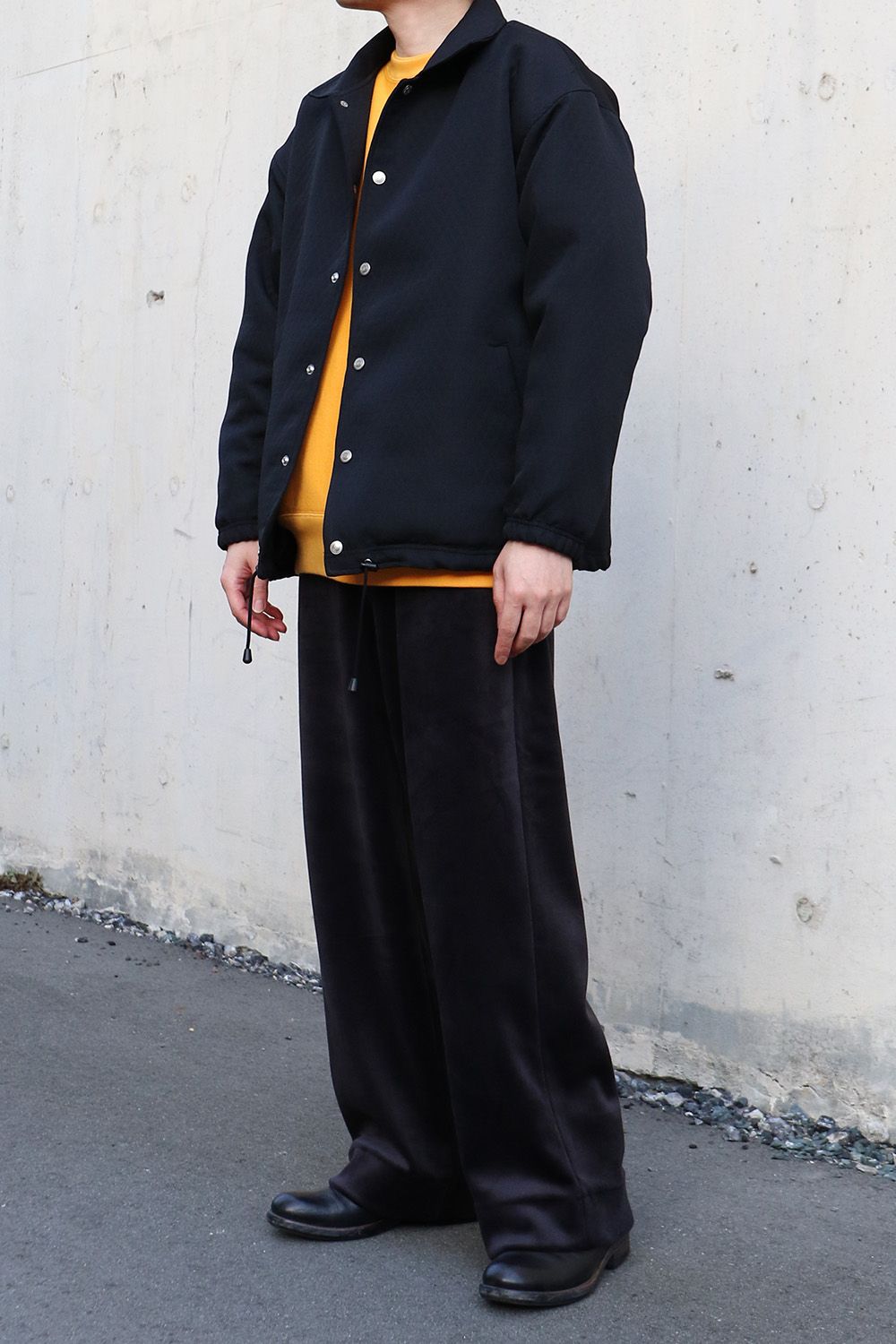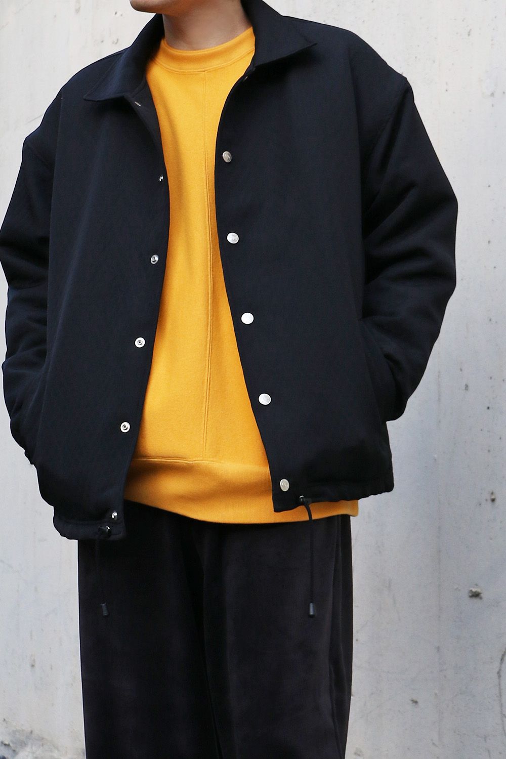 表面のさりげないキルティング、一般的なコーチジャケットとは違い、ナイロンのスポーティーな感じではなく、落ち着いた高級感のある見た目、裏のファーも高級感、防寒性もしっかり確保、カジュアルと上品さをアウターだけでなく、コーデュロイのワイドパンツ、ブーツで表現したコーディネートにしました。また、普段はブラックでまとめる事が多いので、トレーナーのマスタードをワンポイントにしています。