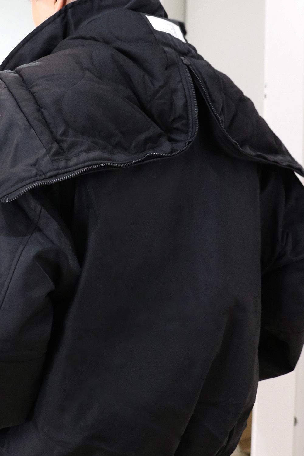 スピンドルにはナイロンコードを採用しモダンな印象に。裏地には中綿のキルティングを施し、袖口にはベルクロを備えることで高い防寒性を確保。