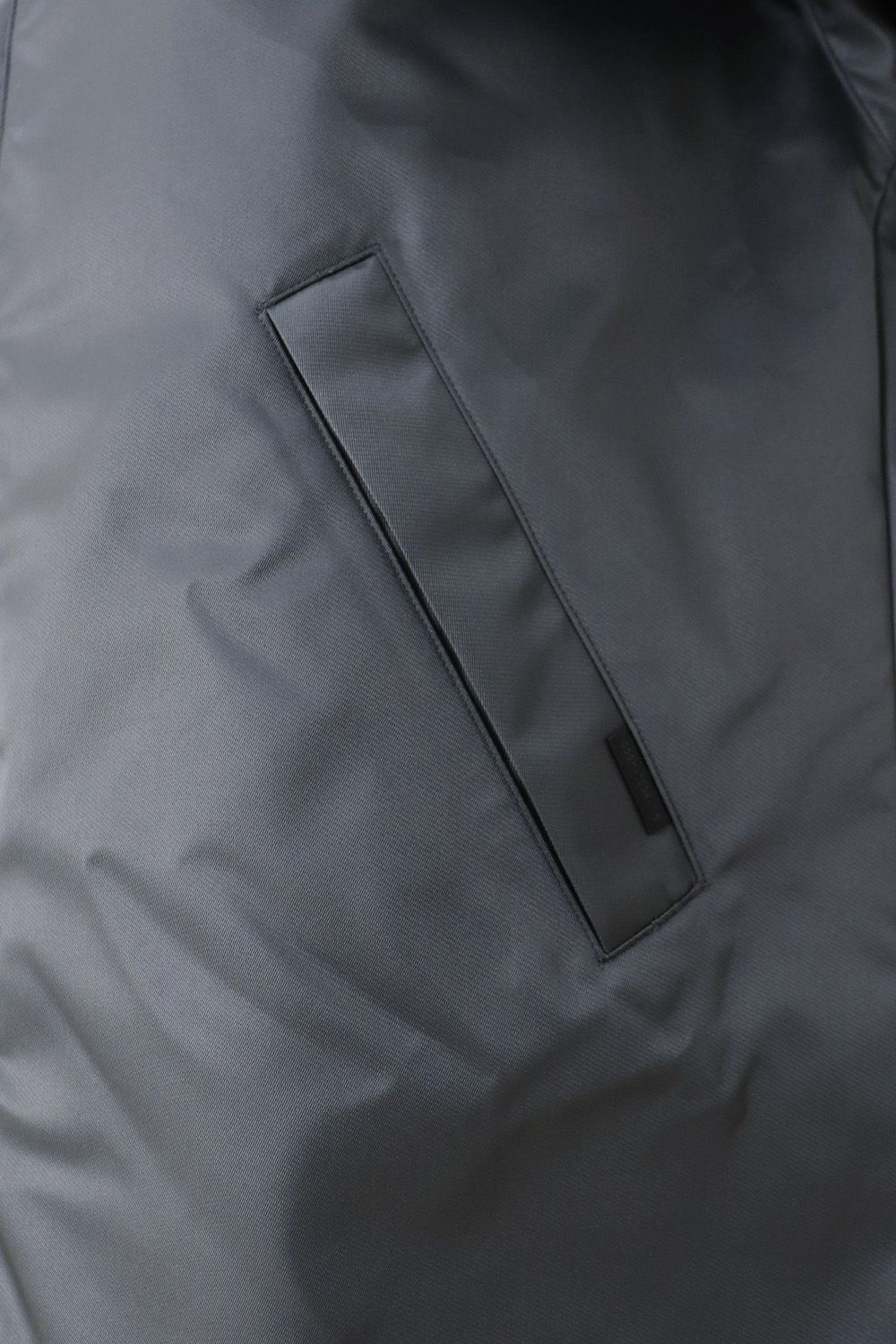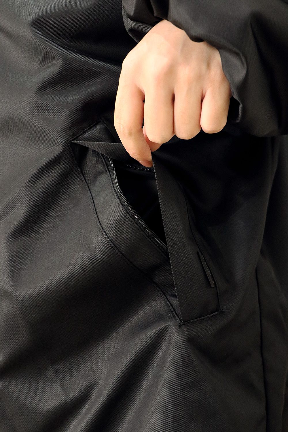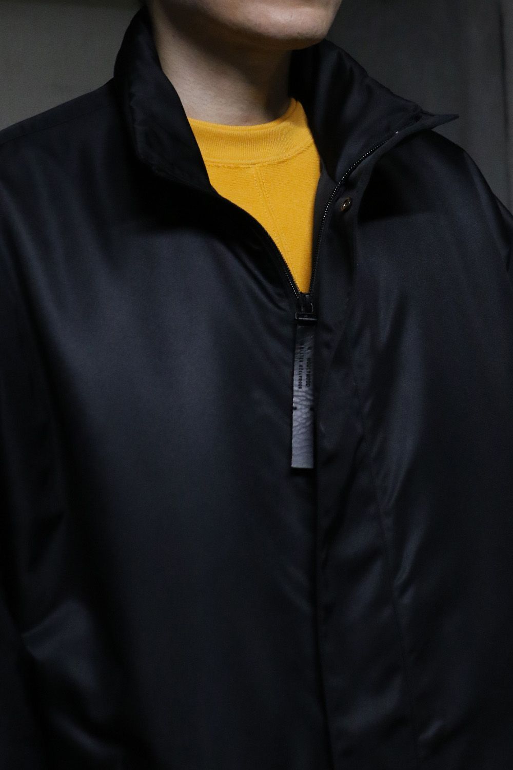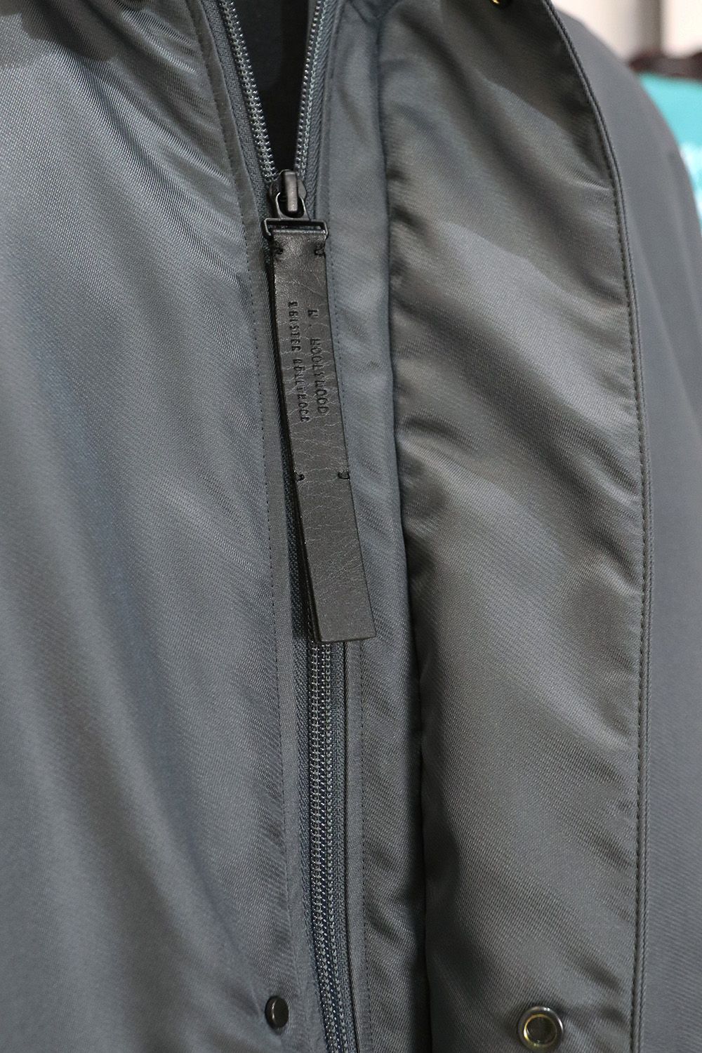 フロントのファスナーはブランドロゴを刻印したオリジナルのレザー引き手を採用。
