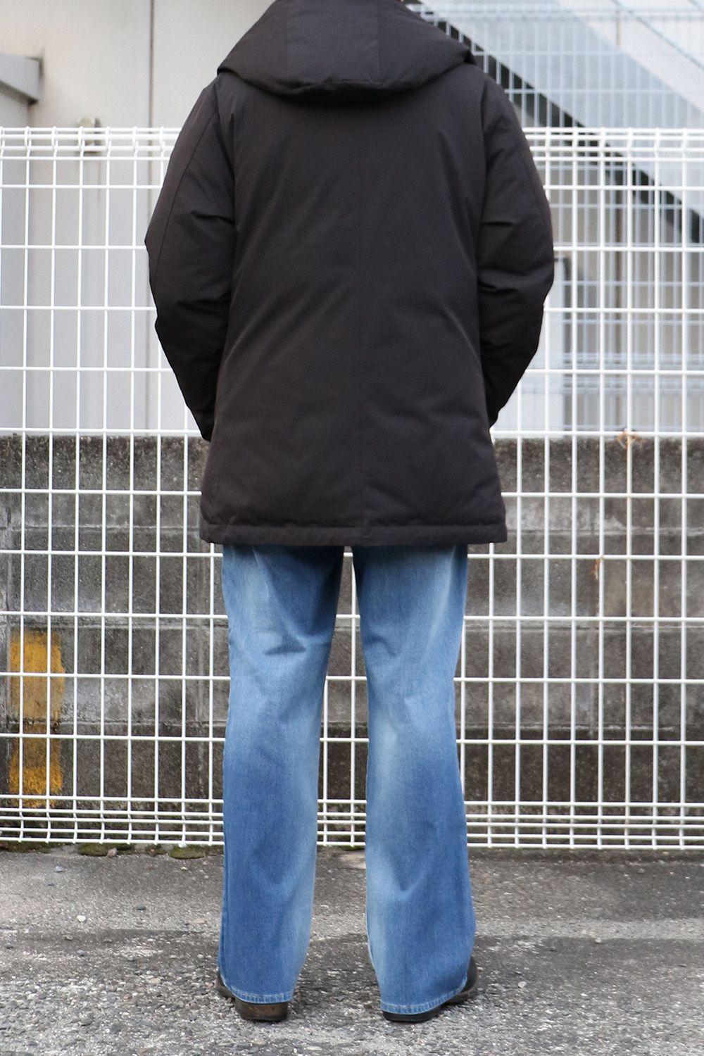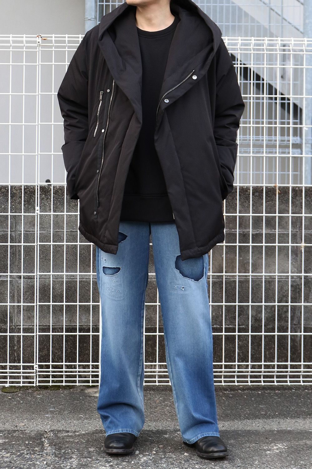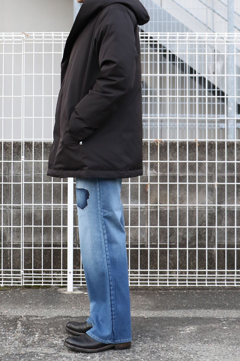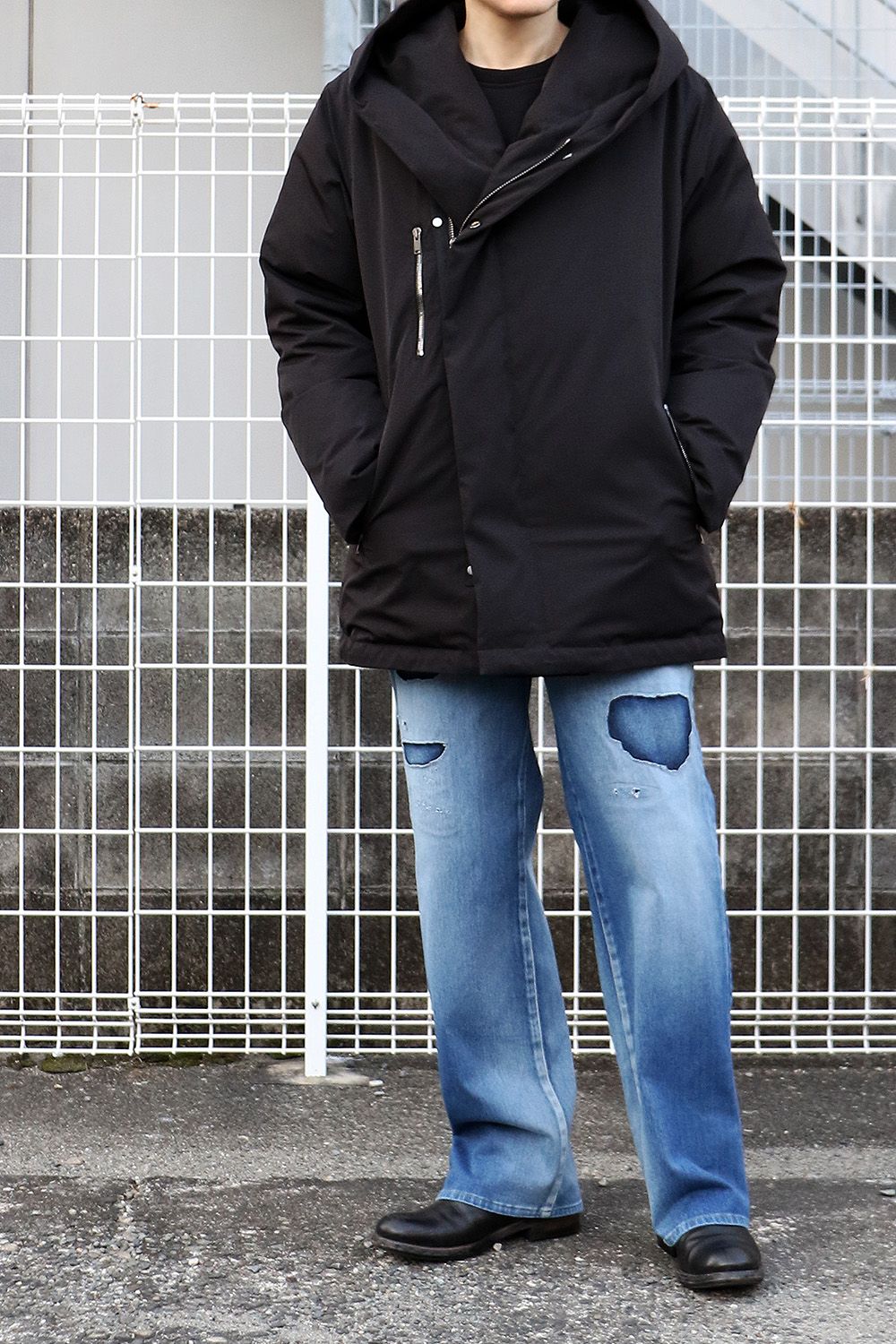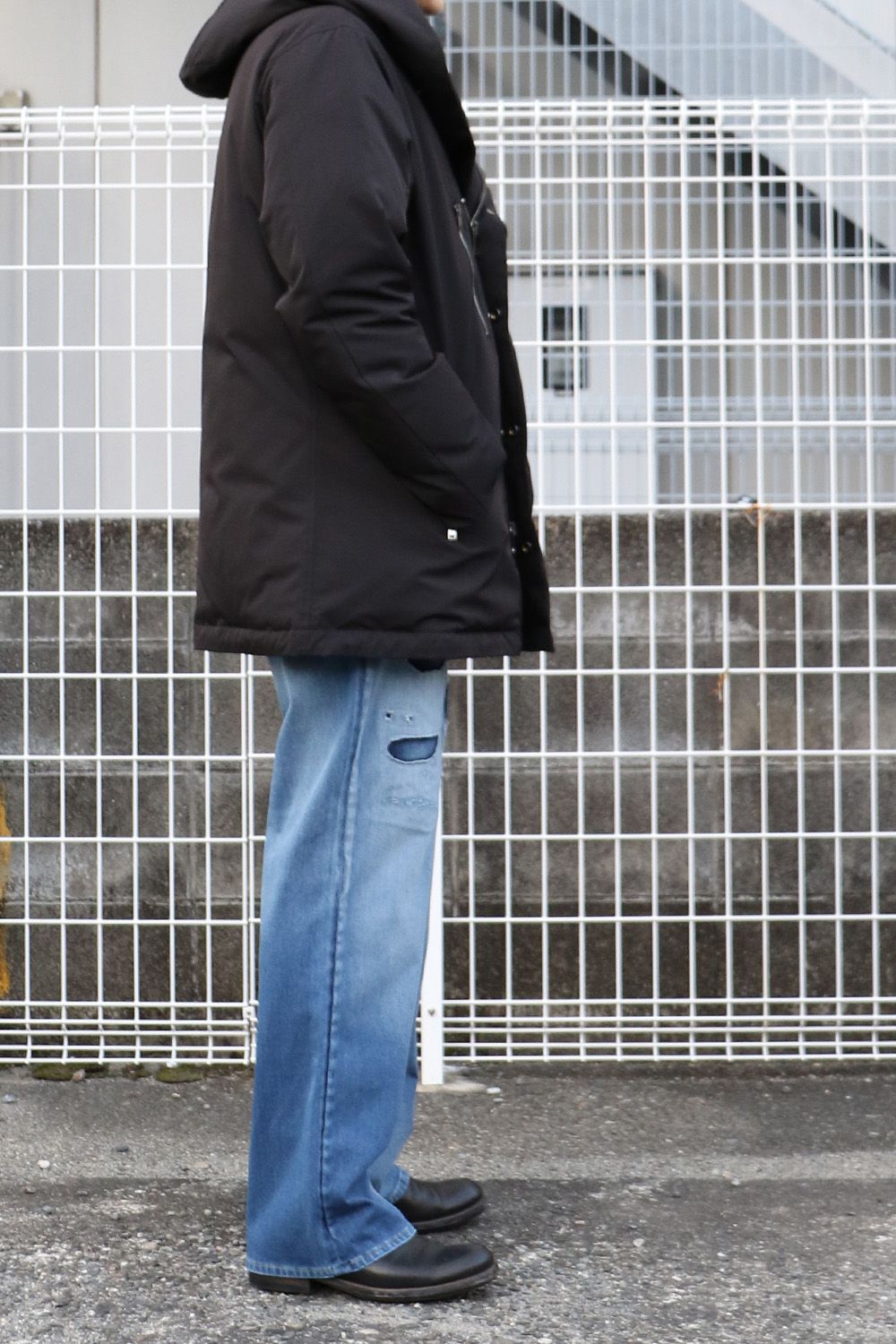 RESOUND CLOTHINGのKING DENIM JERSEY、シンプルにクラッシュデニムの存在感を引き立て、ミドル丈のダウンと合わせた落ち着きのあるスタイル。