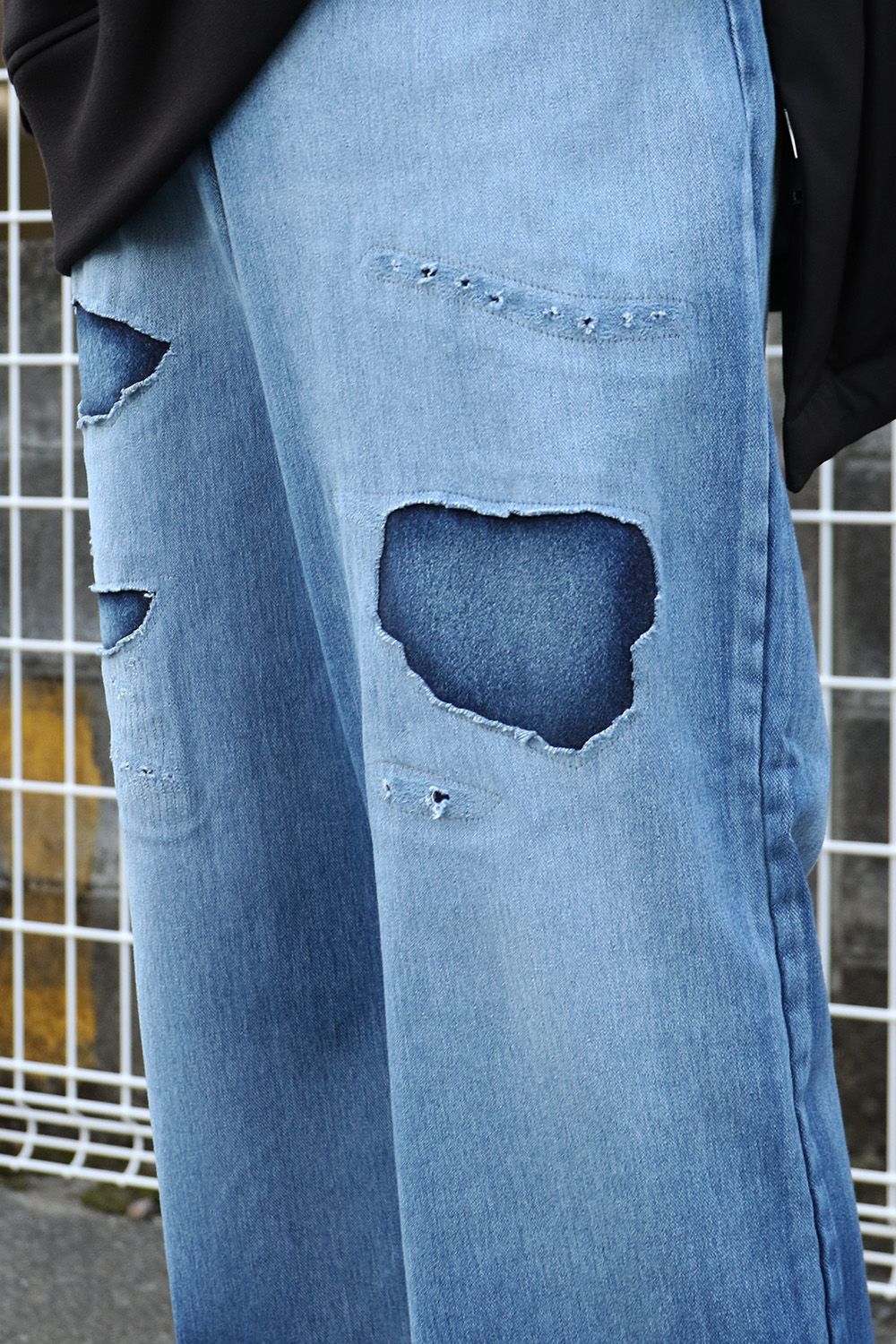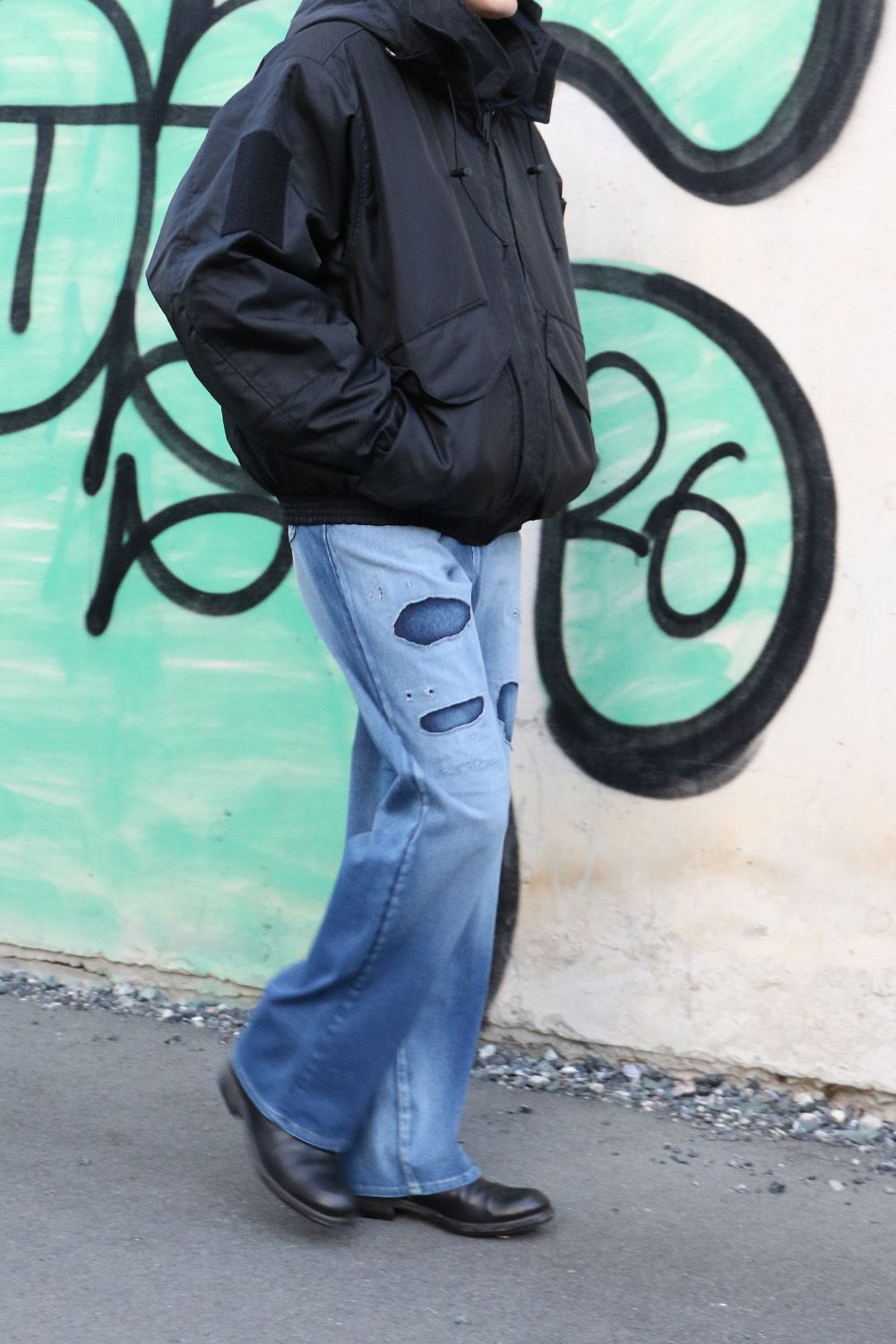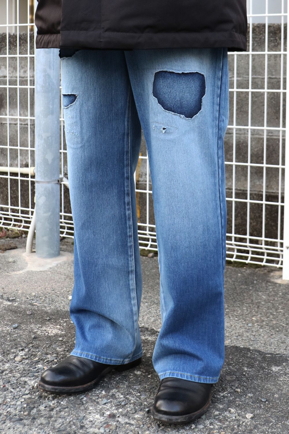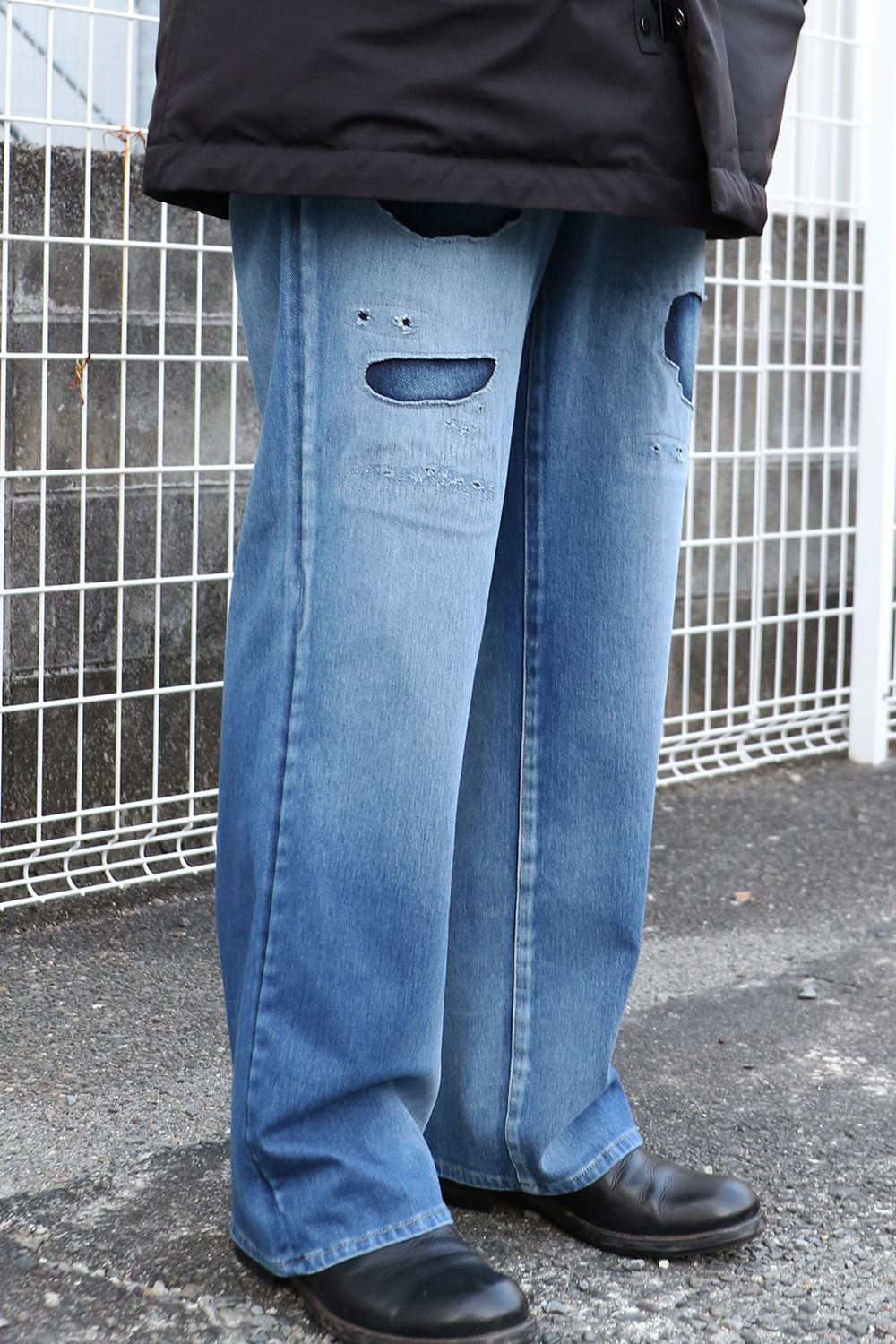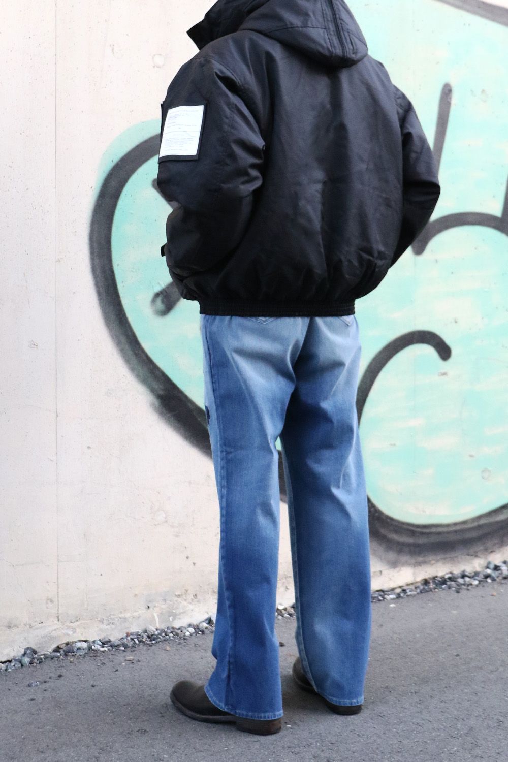 RESOUND CLOTHINGのKING DENIM JERSEY、シンプルにクラッシュデニムの存在感を引き立て、ミドル丈のダウンと合わせた落ち着きのあるスタイル。