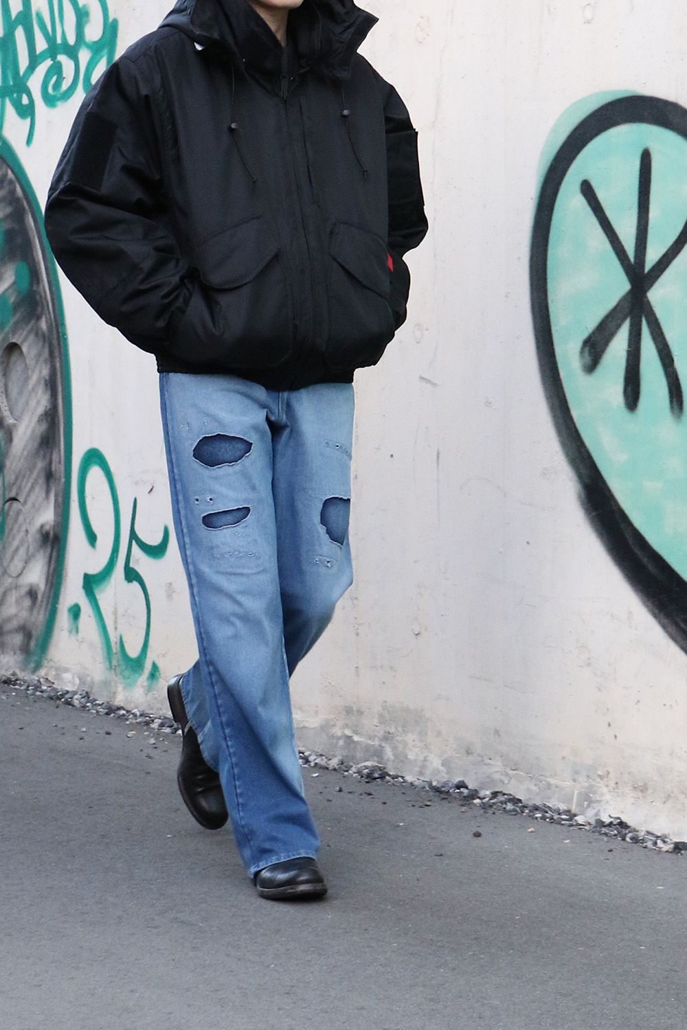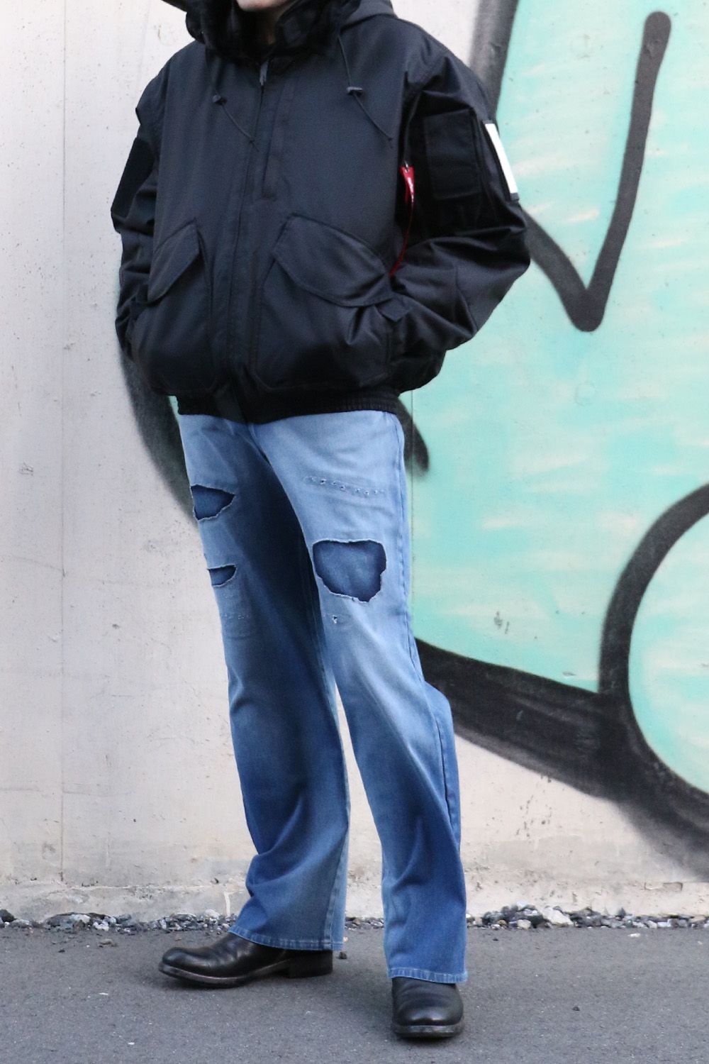 そして、足元をスタイリッシュに、縦長の設定のパンツはショート丈のアウターと組み合わせていただければシルエットをより良く見せることも可能です、もちろん、中綿入りのしっかりとした生地感のN.HOOLYWOOD×ALPHAコラボのブルゾンは抜群の保温性があり、見た目もインパクトがありミリタリーとヴィンテージのトレンド感のあるスタイルです。