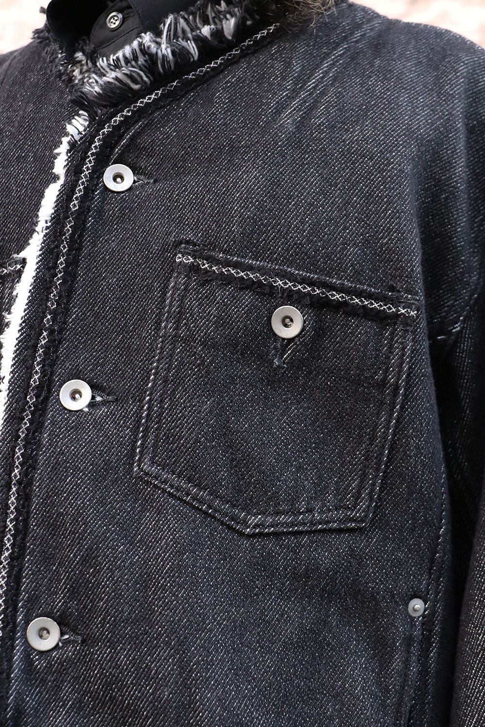 岡山県井原市で織り上げられた、独特な厚みと柔らかな風合いのある独自のデニムです。経糸に8番手インディゴ染めのムラ糸、緯糸に通常のデニムより太い5番手の甘撚りのスラブ糸を使用したふっくらとしたやわらかい手触りが特徴。 緯糸は甘く撚糸することで全体的に絶妙な膨らみが出て非常にソフトな風合いに仕上がります。クラシカルなジャケットを彷彿とさせるデザインです。
