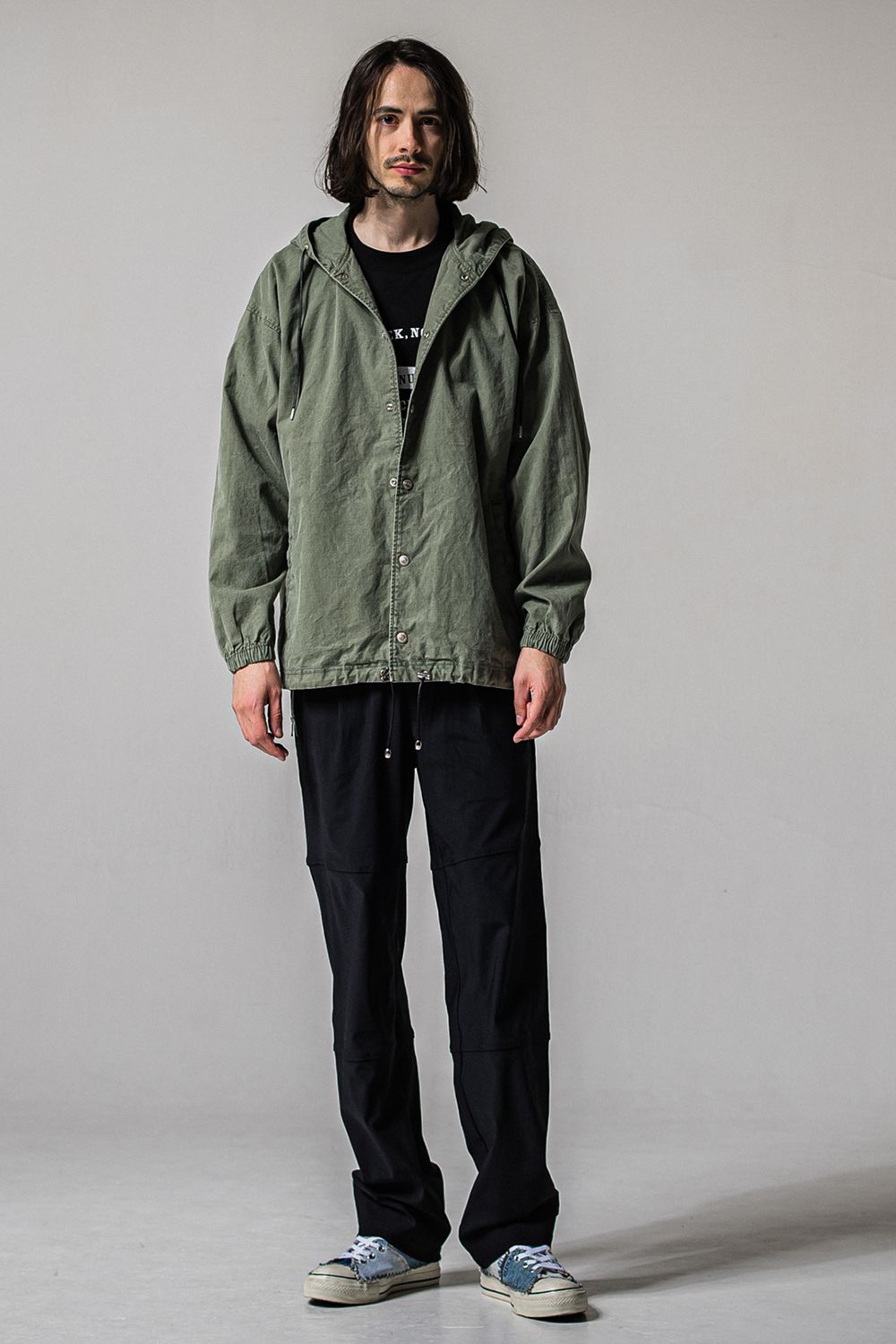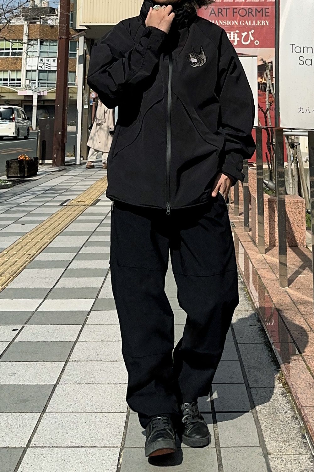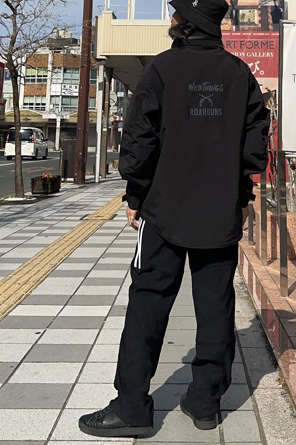 roargunsとWILD THINGSとのコラボアウターとナイロンのワイドパンツ、今日は珍しくシューズはレザースニーカー、アクティブなイメージのコーディネートです。
