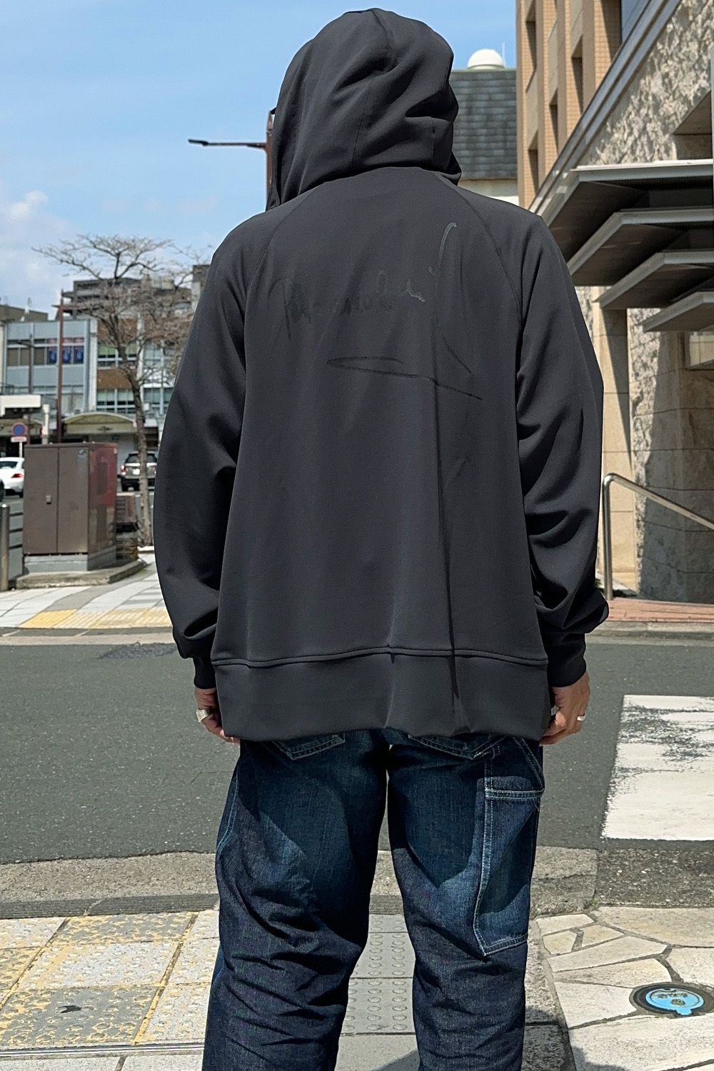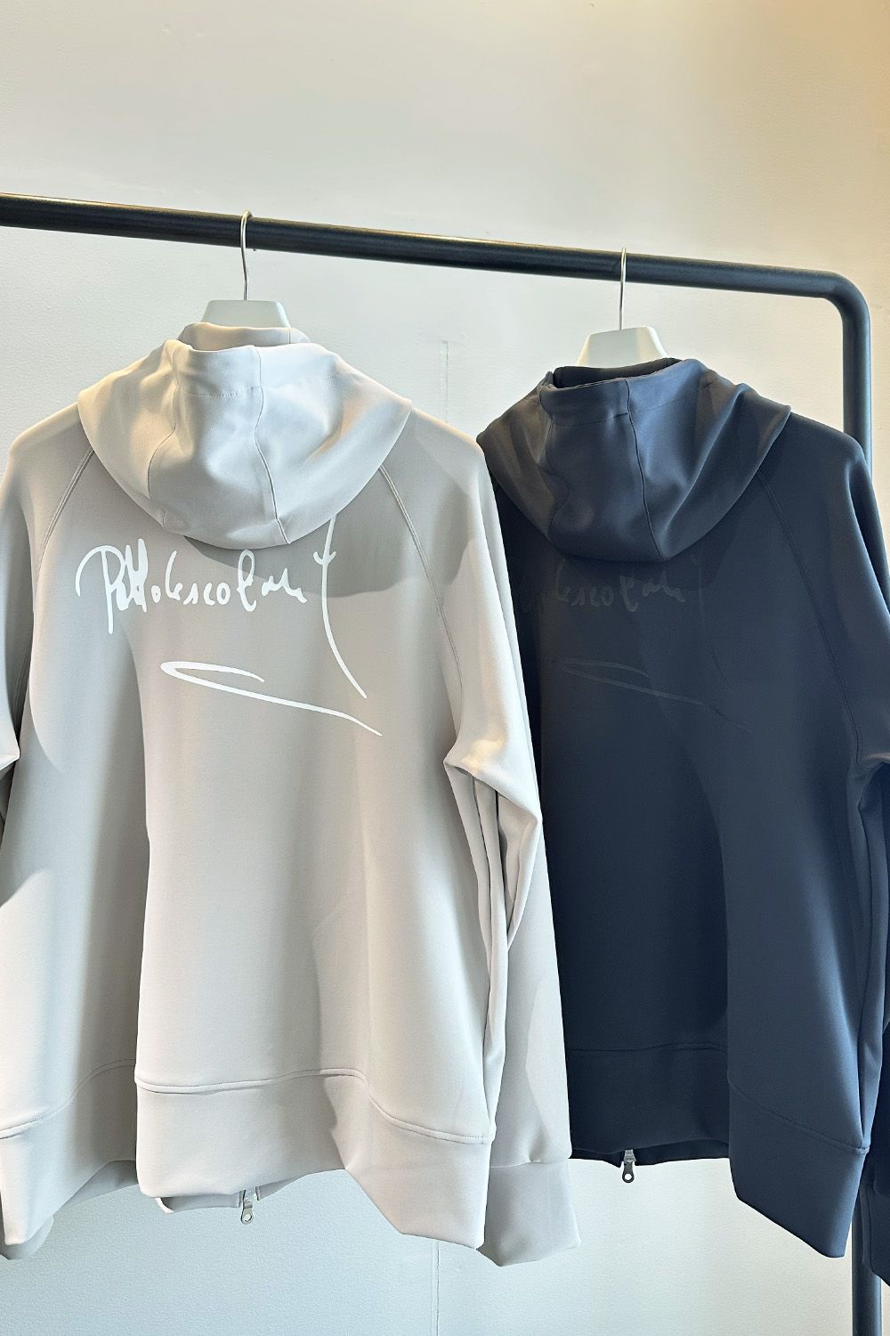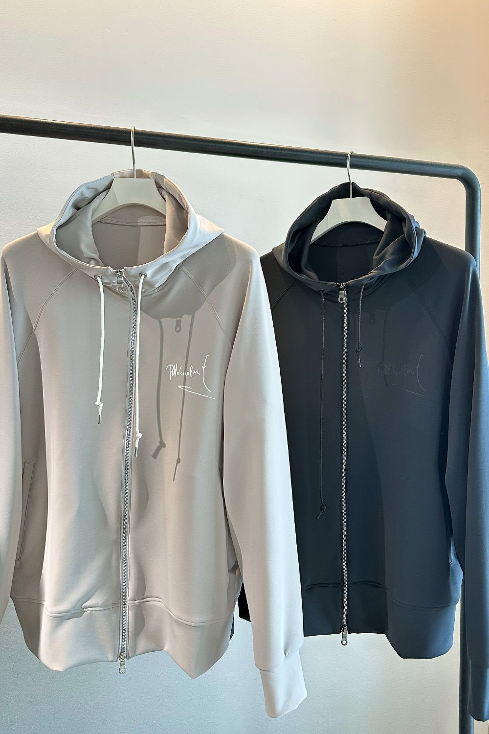 パブロエスコバルのサインを転写した、シンプルながらシルエットと素材に拘ったジップアップパーカ。