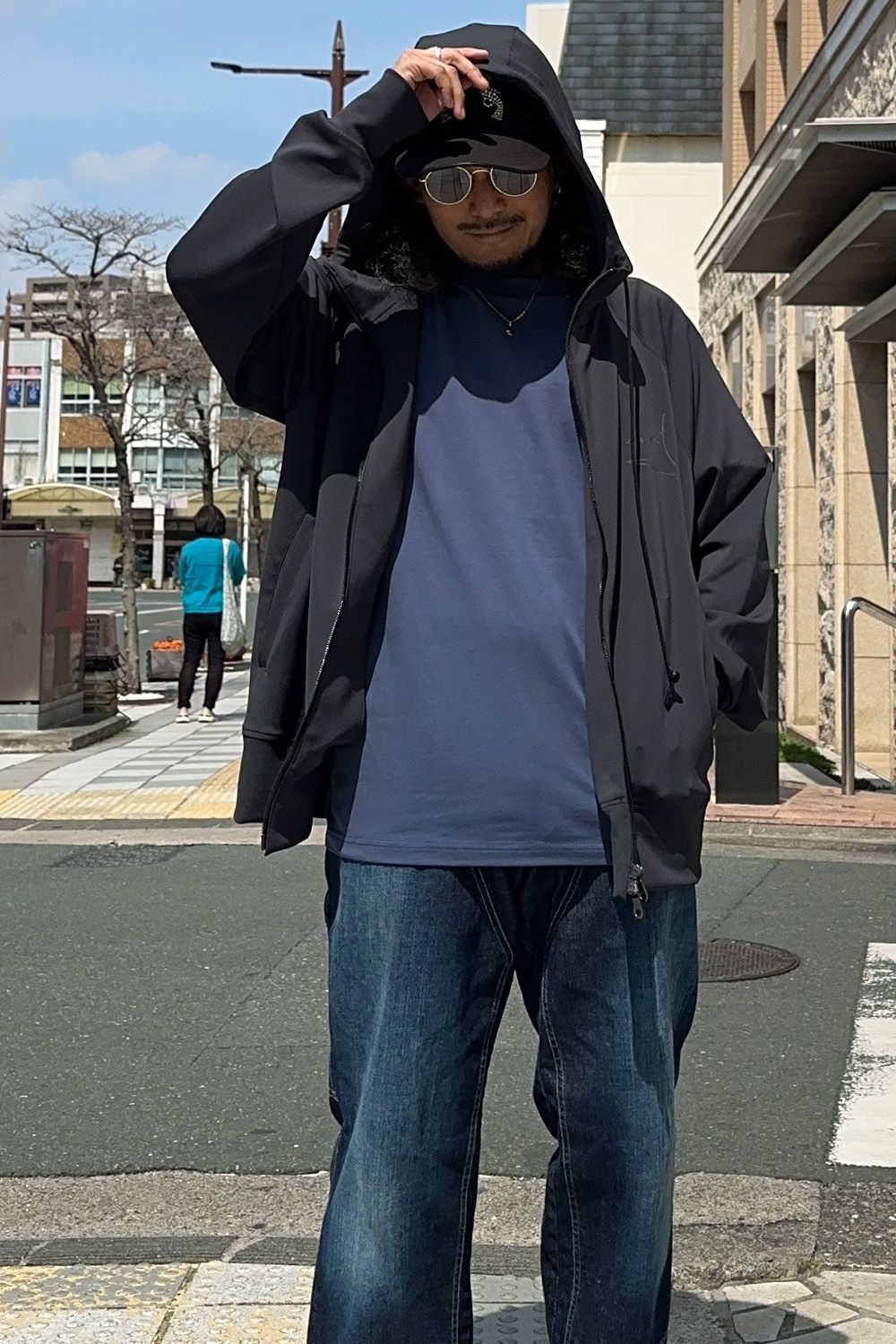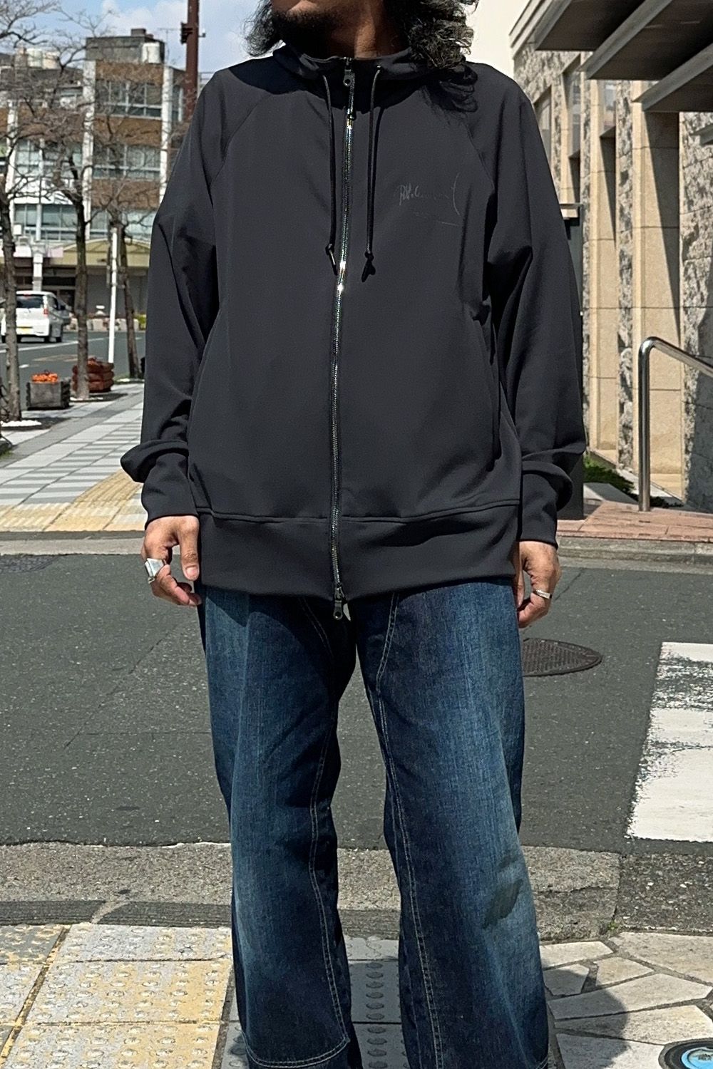 パーカは程よい厚みがあり、柔らかくずっと着ていられる、手触りもサラッとした気持ちの良い素材、フロントのバックのさりげないプリント、インナー&アウターとしても使いやすい、サイズ感も大きすぎないバランスも良いアイテムです!またブラックの表記ですが、やや淡い色味が渋いですね!
