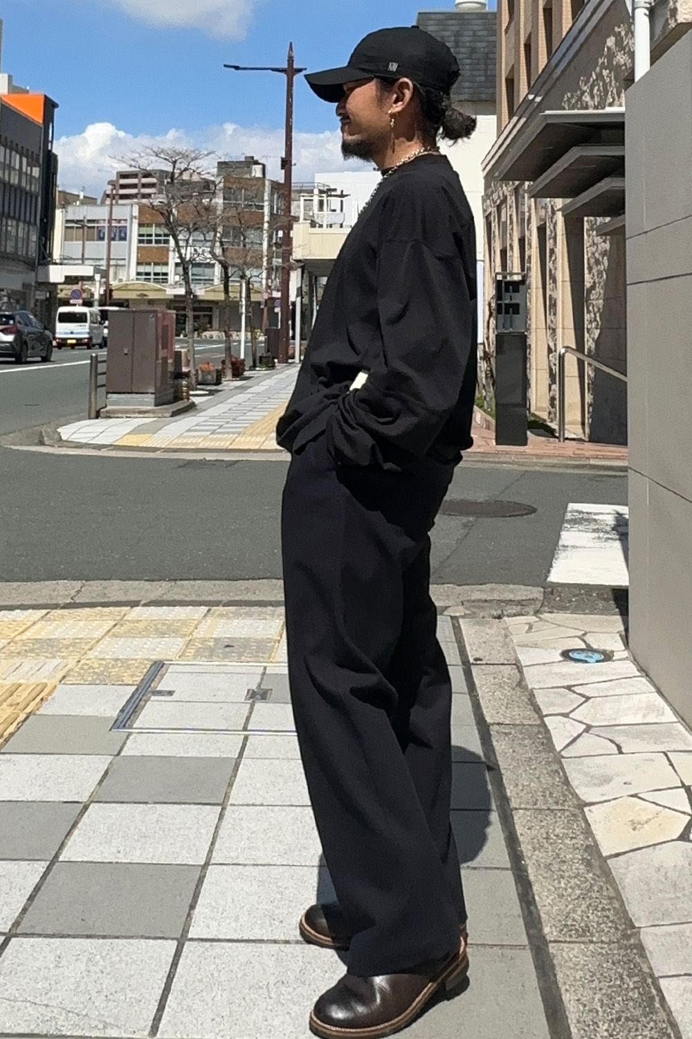 パンツはN.HOOLYWOOD COMPILEのグルカパンツ、サイドのベルトで簡単にウエストのアジャストが可能、しっかりと太さがあるパンツのためコーディネートの主役になるパンツです!シャリ感のあるコットンのためこちらもこれから暑い時期にも着用しやすく、家庭洗濯も気にせず着用できるところも嬉しいポイントです!