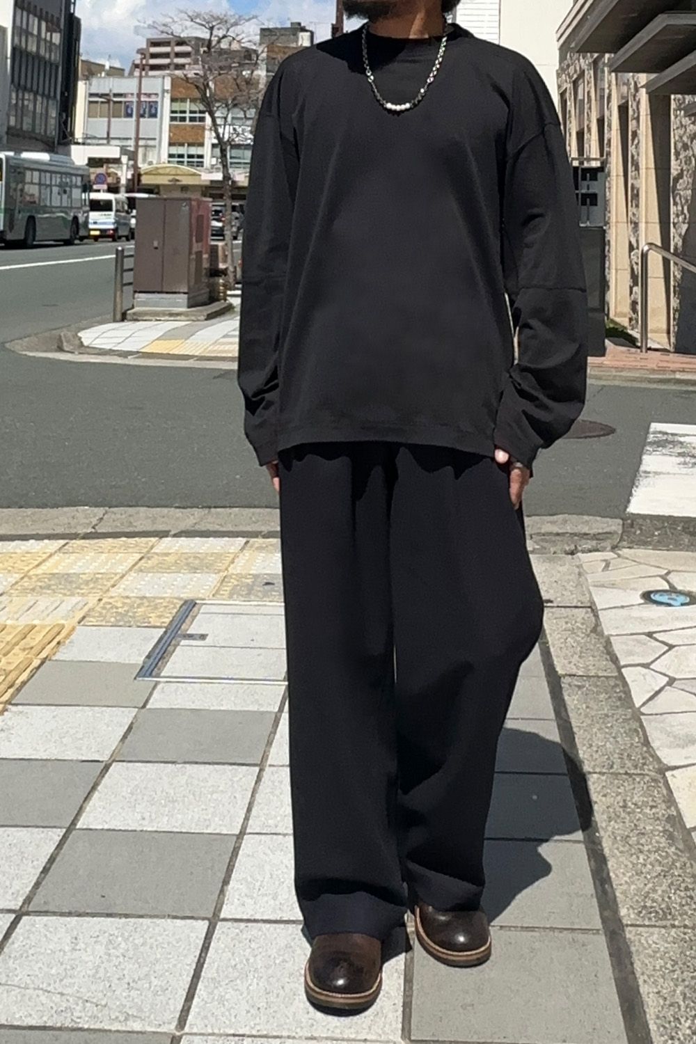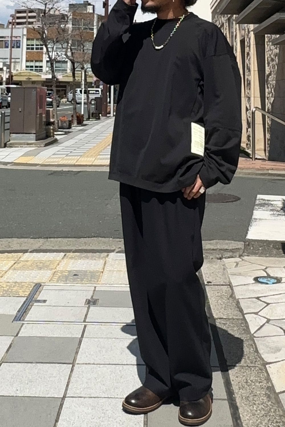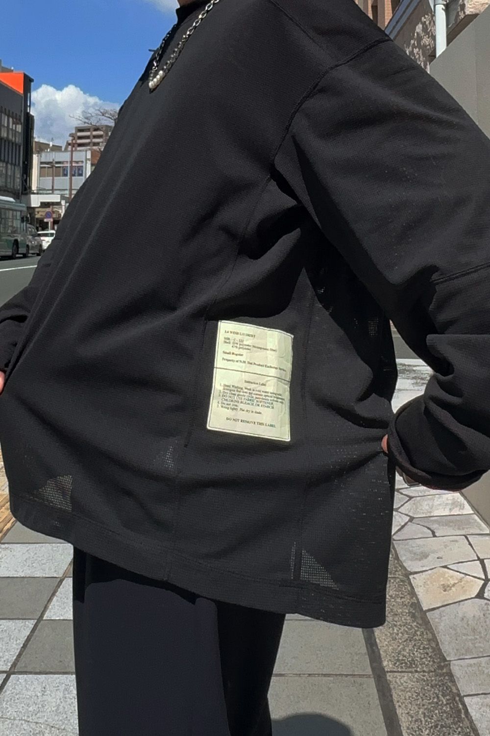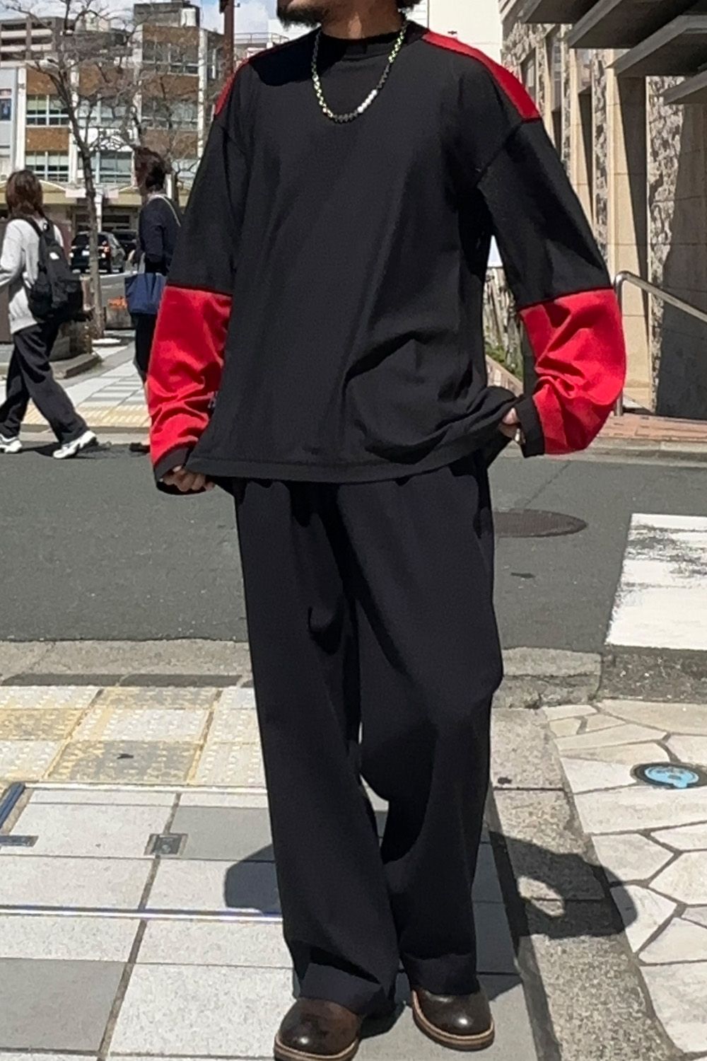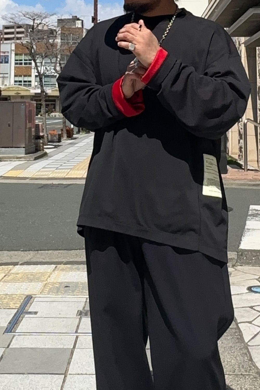メインのトップスはN.HOOLYWOOD TPESのリバーシブル仕様のメッシュロングスリーブT、全体的にルーズなサイジングのため暑い時期でも着用しやすい着心地、表は脇下の見るスペックがアクセント、裏面はブラックは部分的にレッドのパーツがアクセントに、袖を少しだけ捲って色を出したり、遊びのきくアイテムです。