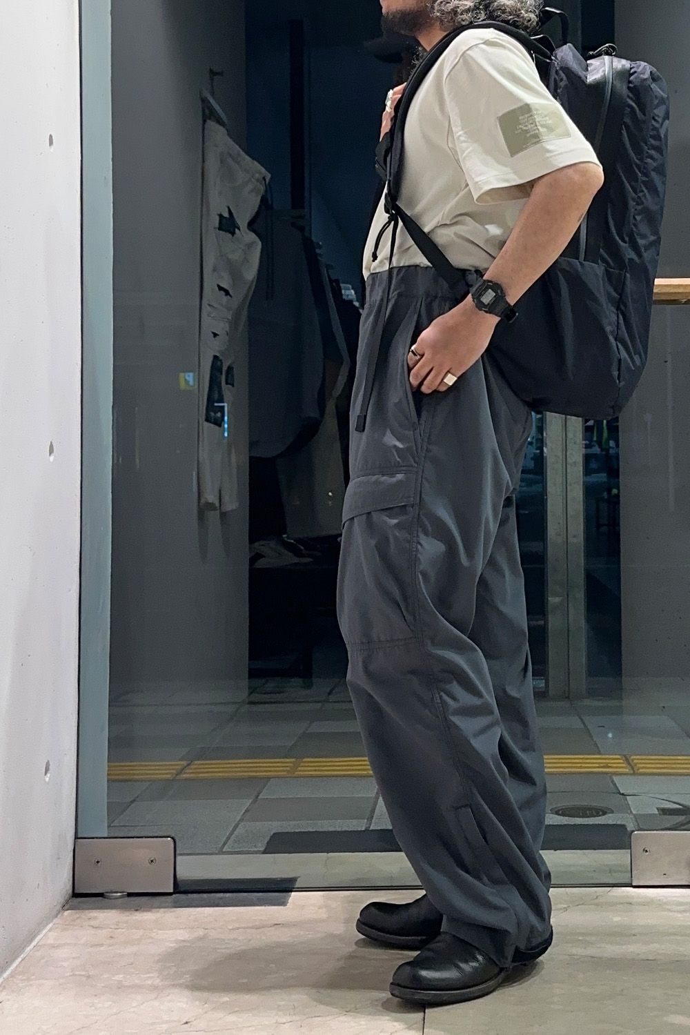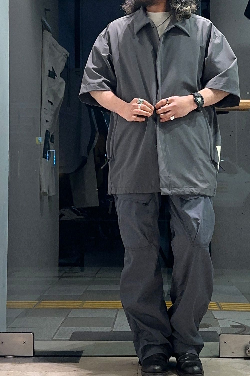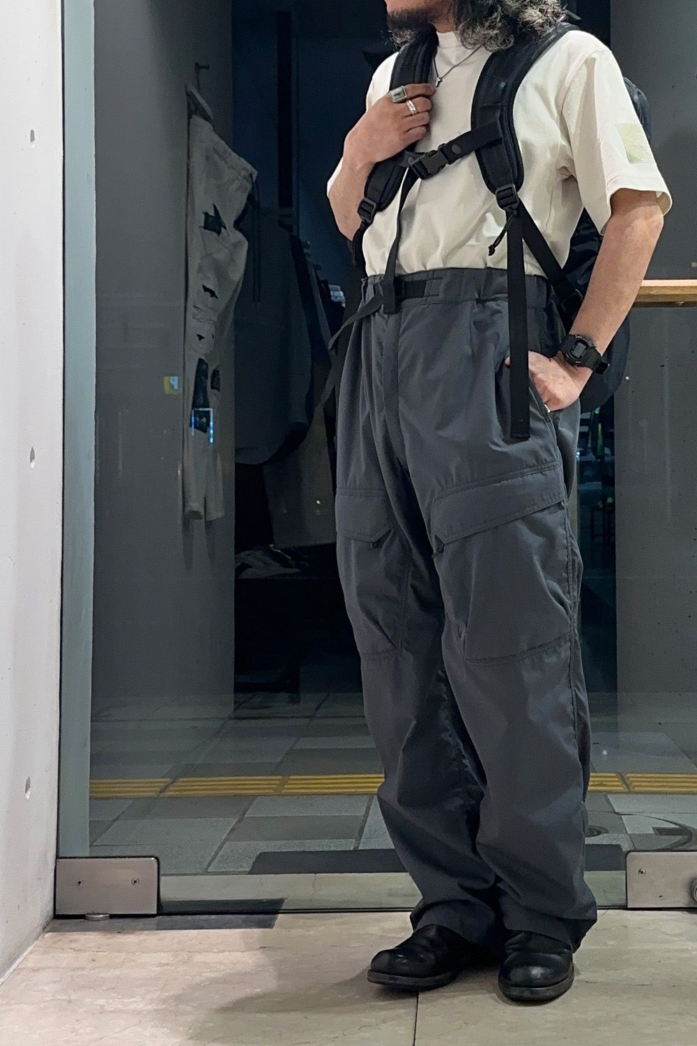 カーゴパンツは細いタイプを、生地も軽量でサラッとした着用感のため、春夏に使いやすくミリタリーカラーのチャコール、N.HOOLYWOODのオリジナルカラーで他には無く今回のコーディネートのアクセントにしています。