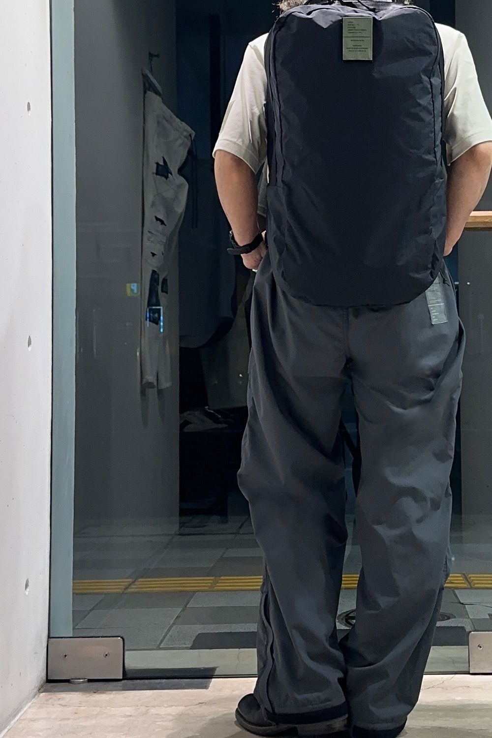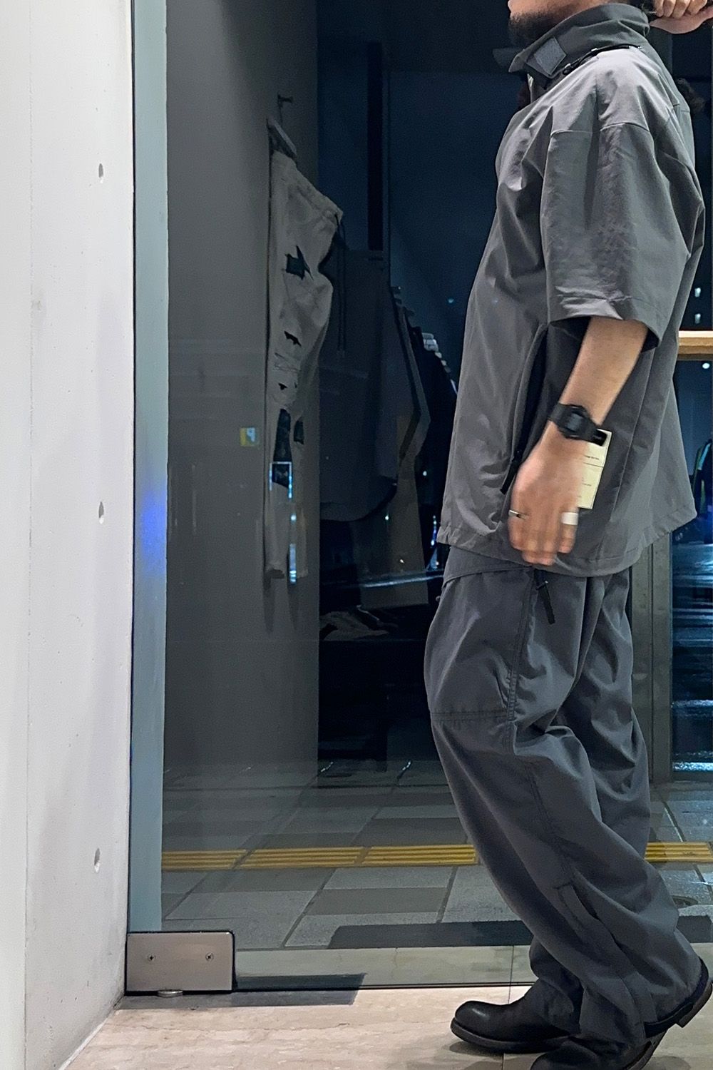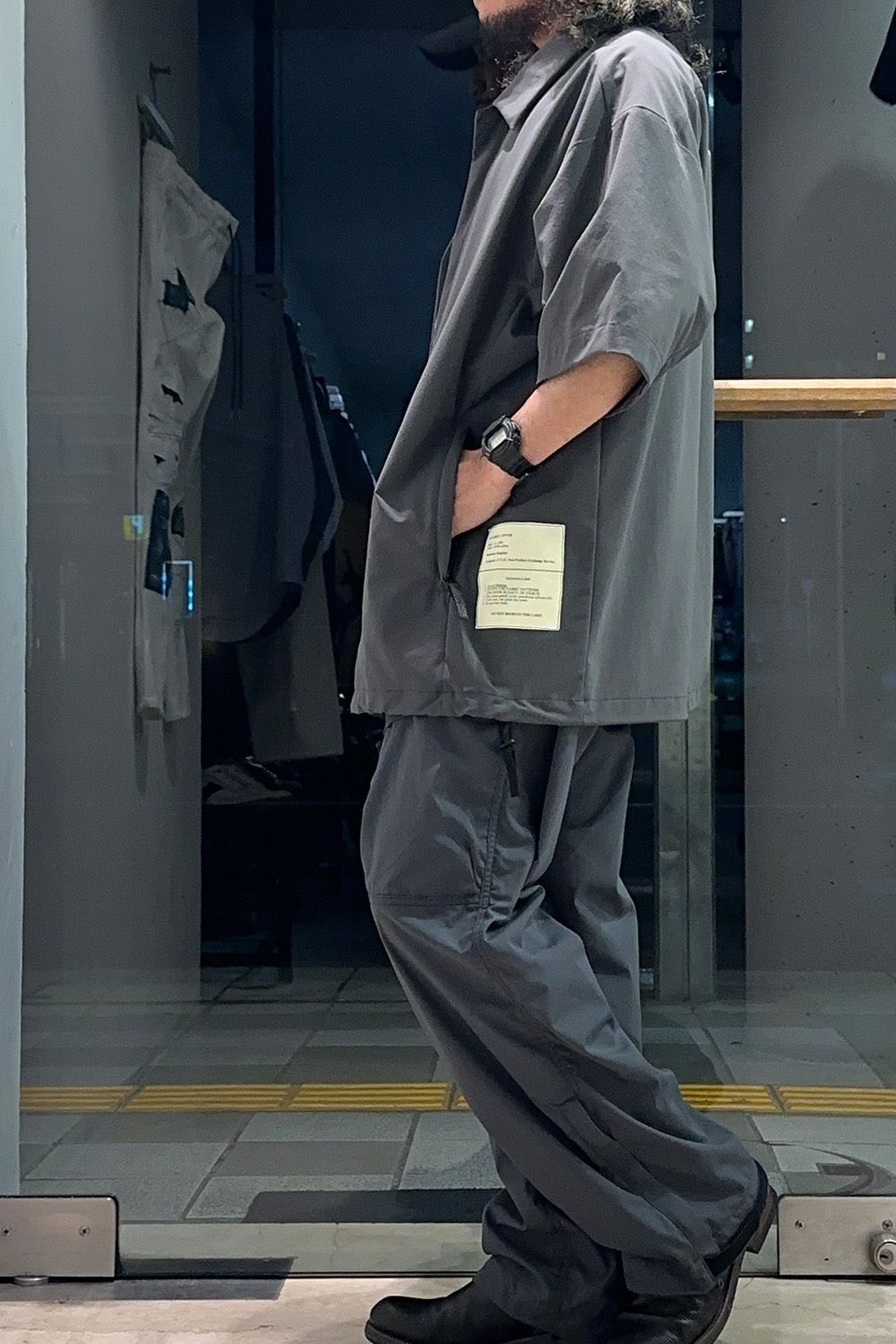 カーゴパンツは細いタイプを、生地も軽量でサラッとした着用感のため、春夏に使いやすくミリタリーカラーのチャコール、N.HOOLYWOODのオリジナルカラーで他には無く今回のコーディネートのアクセントにしています。