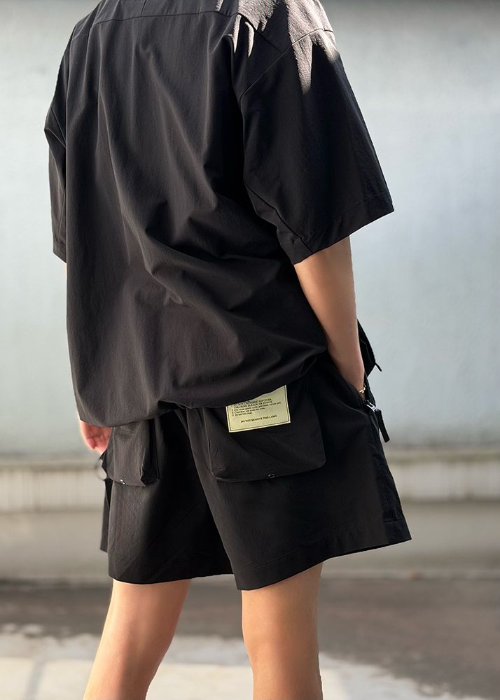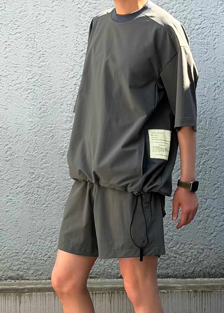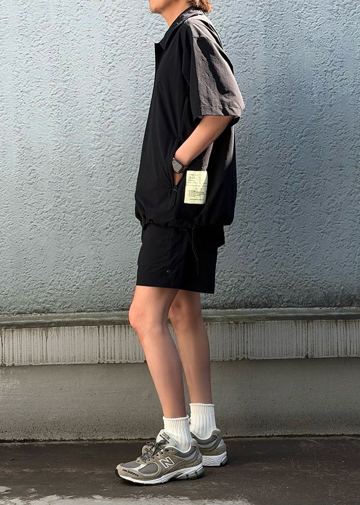 まず、裾の左右にスピンドルがあります。裾を絞り広がりを抑え、フィット感を良くすることでハーフパンツとのバランス、全体のシルエットを綺麗にまとめることが可能です。
