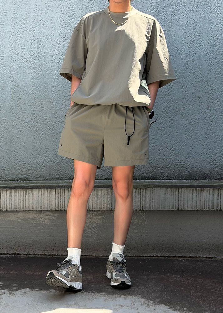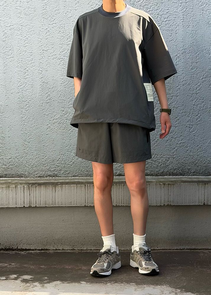 ハーフパンツはリラックスしたシルエットですが、丈を短く設定しスポーティーな印象、ルーズですが足のシルエットを綺麗に見せることができます。