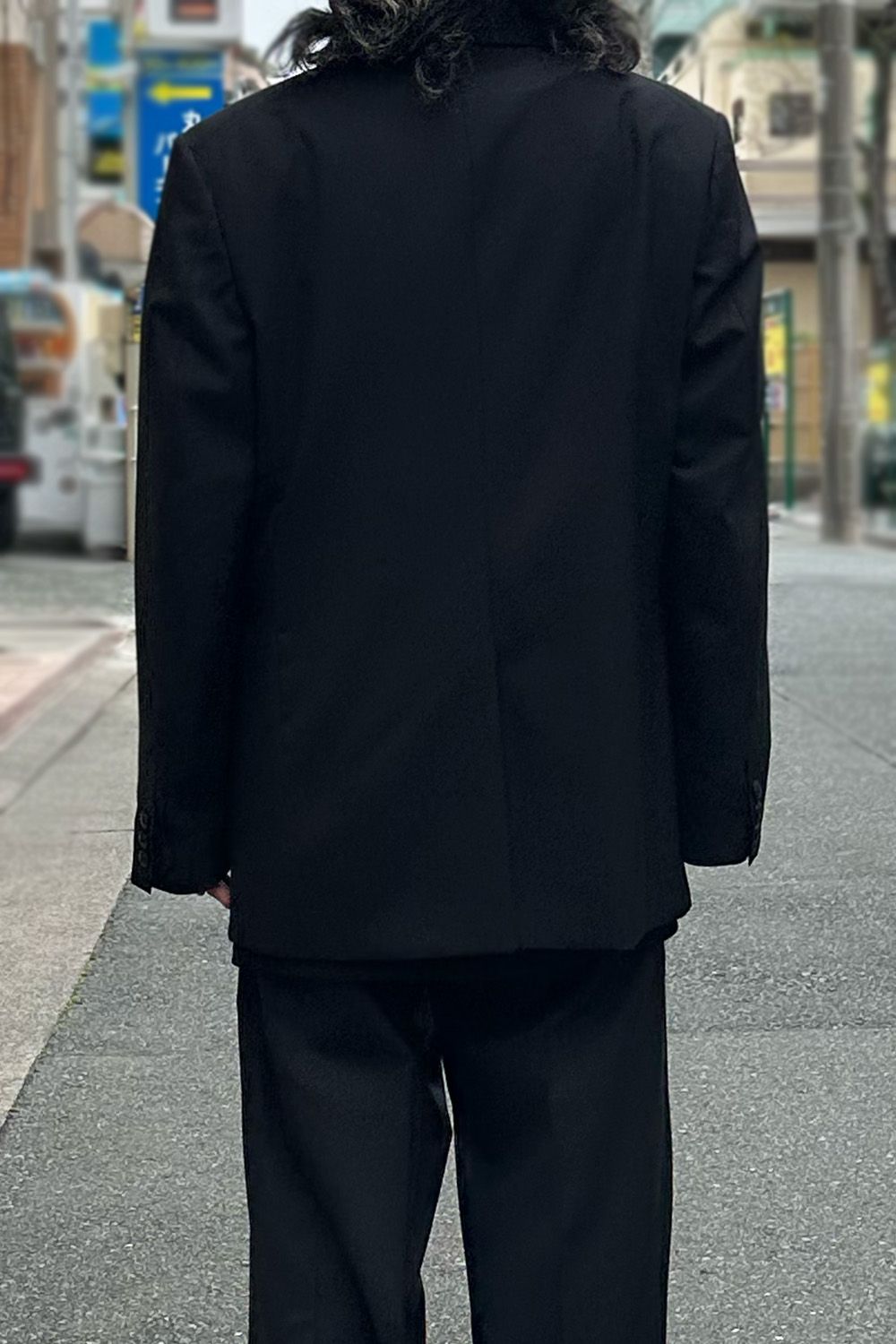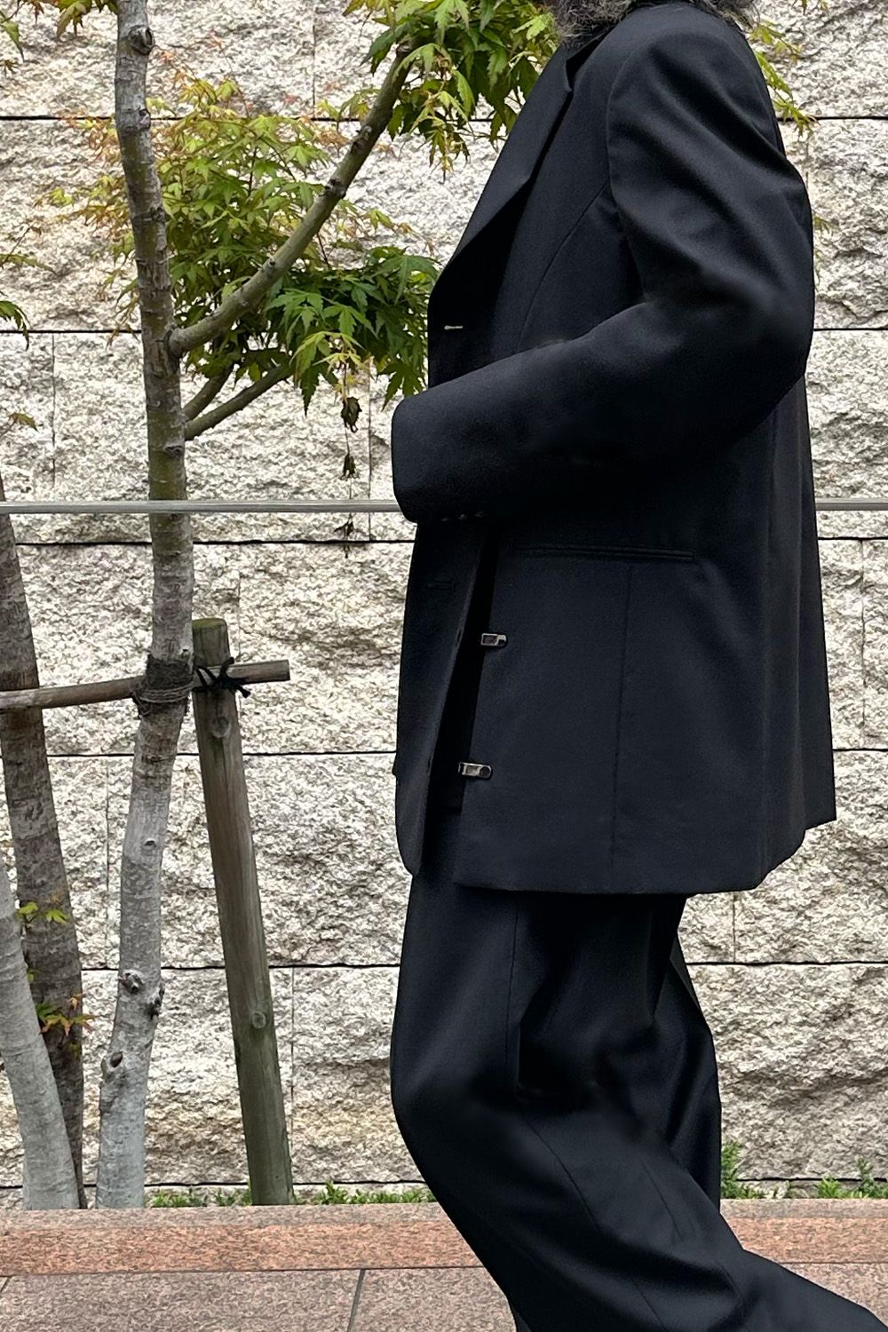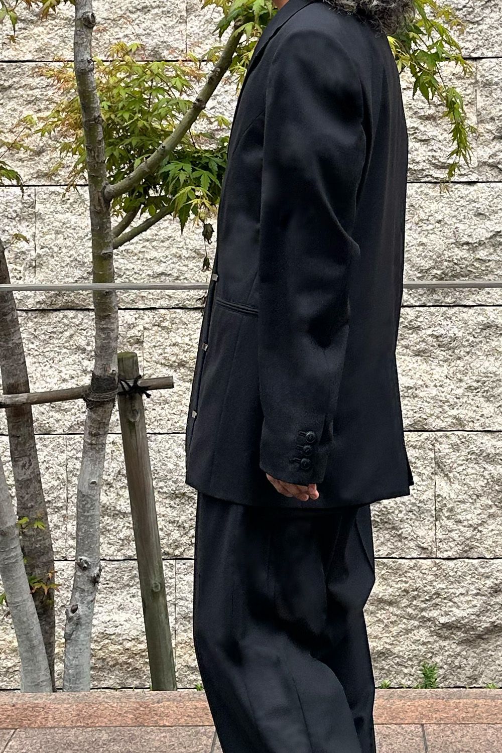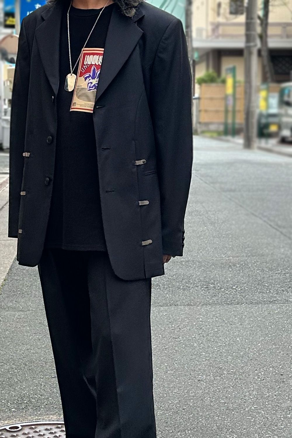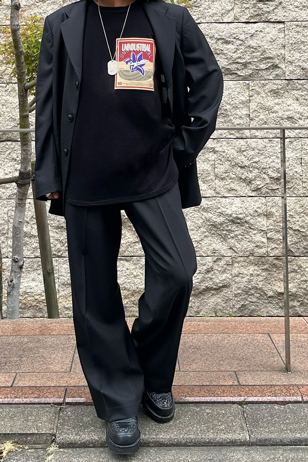 今朝のブルーのシャツとホワイトのワイドデニムとはガラッとイメージを変えまして、ブラックのジャケットとワイドスラックス、ウールのスーツのため暑く感じるかもしれませんが夏の着用も可能とした通気性の良いウールトロピカル素材、肩パッド入りの綺麗なシルエットのジャケットに裾の金属パーツがアクセント、クラシカルとmeagratiaらしい他にない仕上がりのジャケット、カジュアルにお使いしやすいようにプリントのTシャツでコーディネート。同素材のスラックスとのセットアップスタイルをぜひお試しいただきたいです!