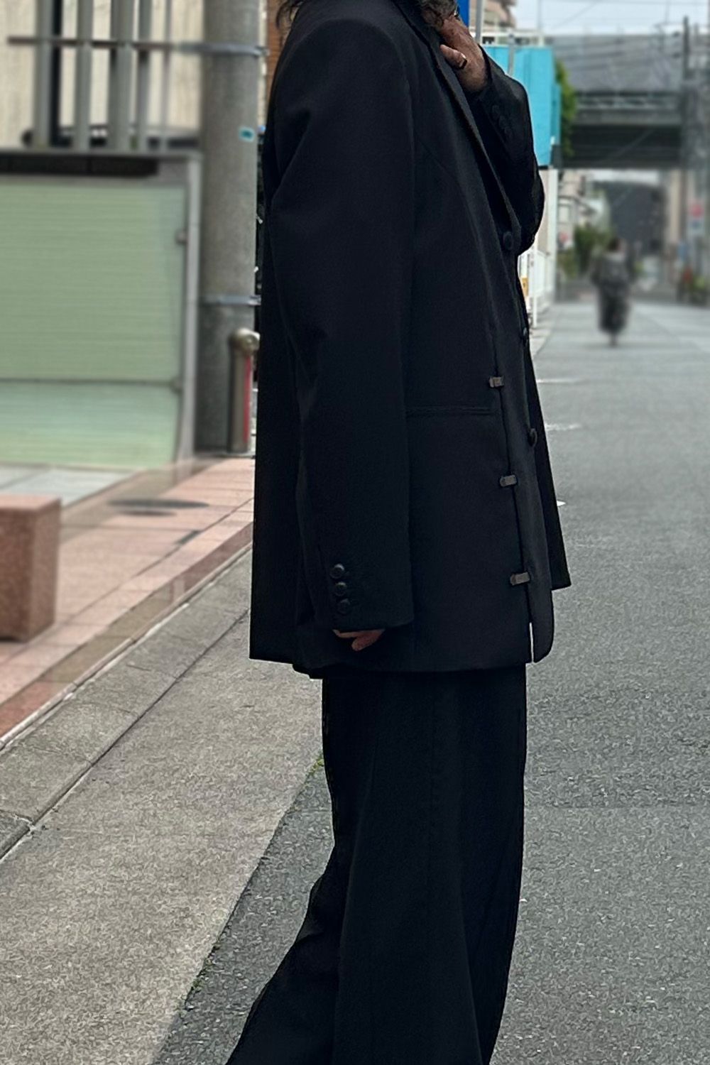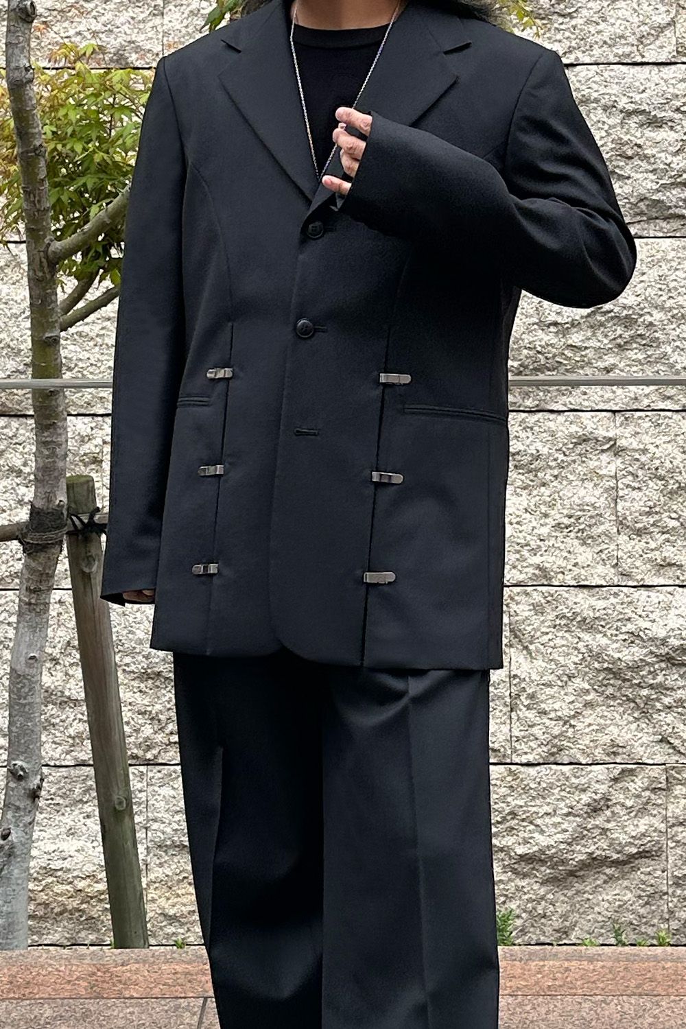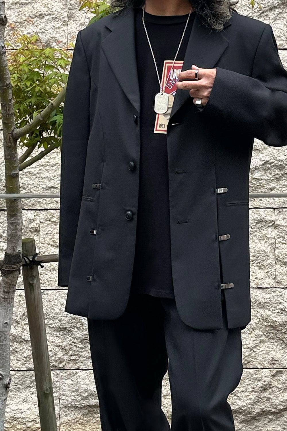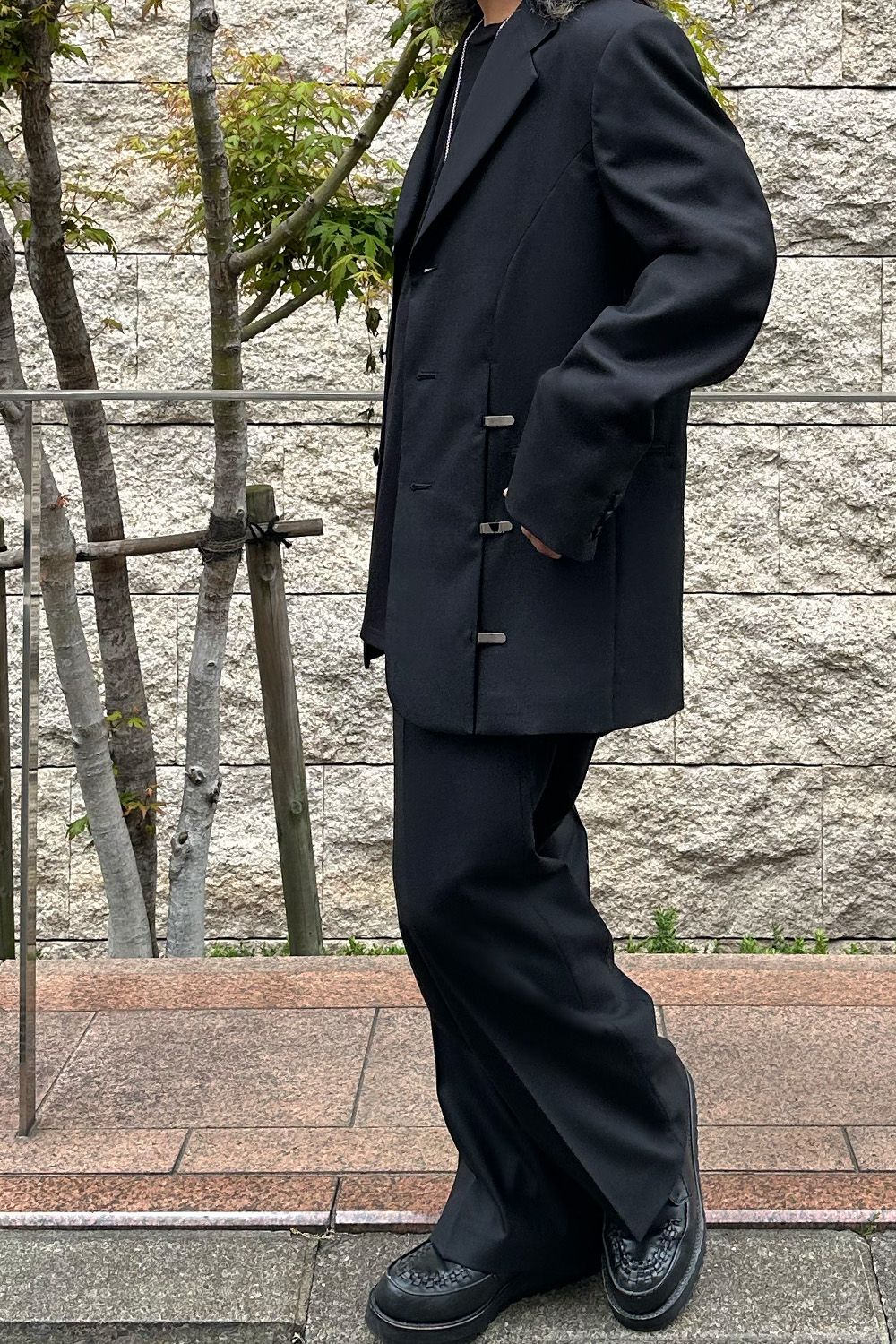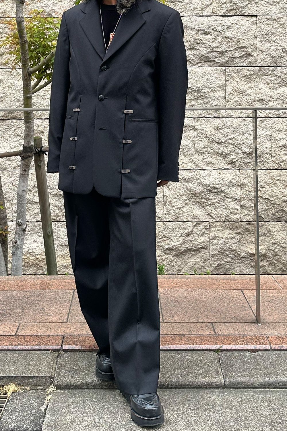今朝のブルーのシャツとホワイトのワイドデニムとはガラッとイメージを変えまして、ブラックのジャケットとワイドスラックス、ウールのスーツのため暑く感じるかもしれませんが夏の着用も可能とした通気性の良いウールトロピカル素材、肩パッド入りの綺麗なシルエットのジャケットに裾の金属パーツがアクセント、クラシカルとmeagratiaらしい他にない仕上がりのジャケット、カジュアルにお使いしやすいようにプリントのTシャツでコーディネート。同素材のスラックスとのセットアップスタイルをぜひお試しいただきたいです!
