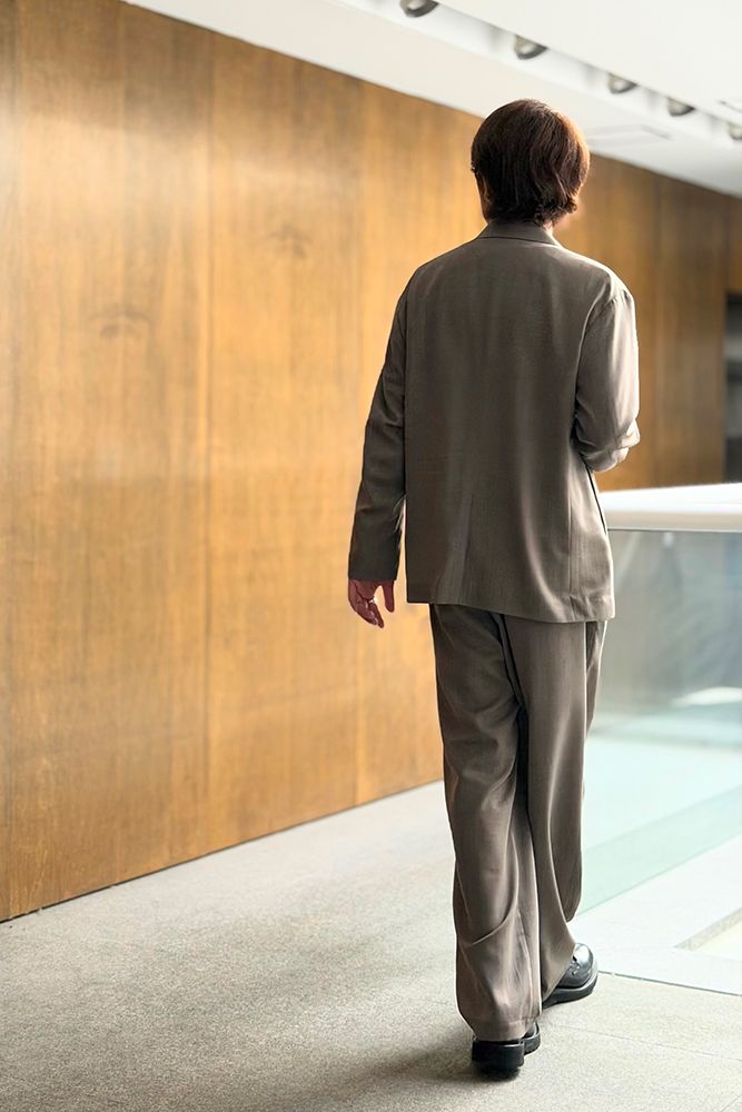 シングルのジャケットはダブルと比較してそこまでビッグサイズではないので落ち着きもあり、ホワイトのTシャツとベージュの上下がシンプルにおしゃれです。装飾はないですが生地の光沢感やシルエットから高級感、一般的なセットアップとの差別化をしっかり演出できます!