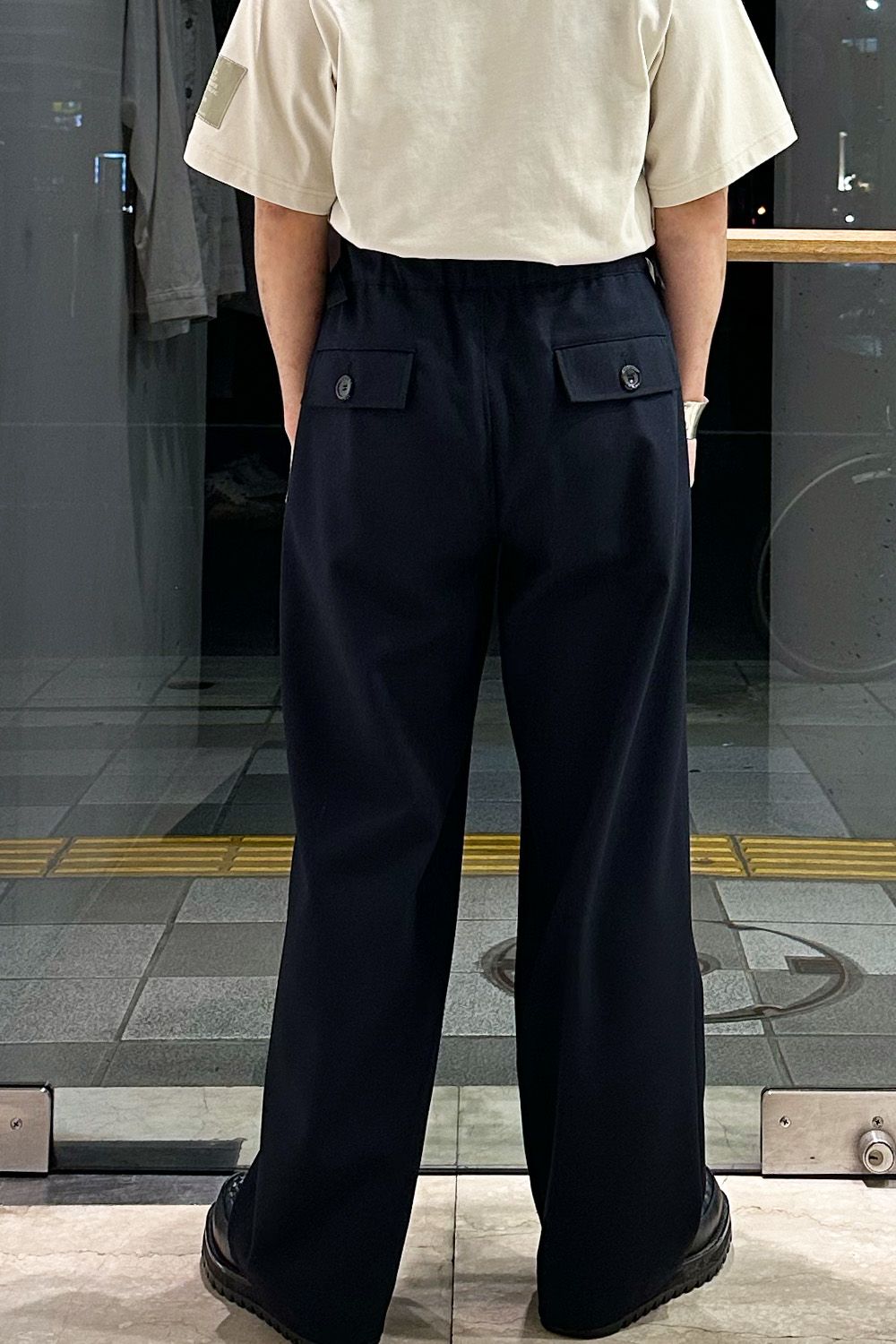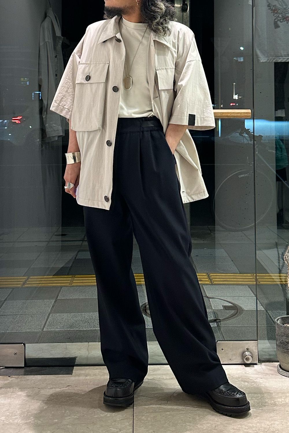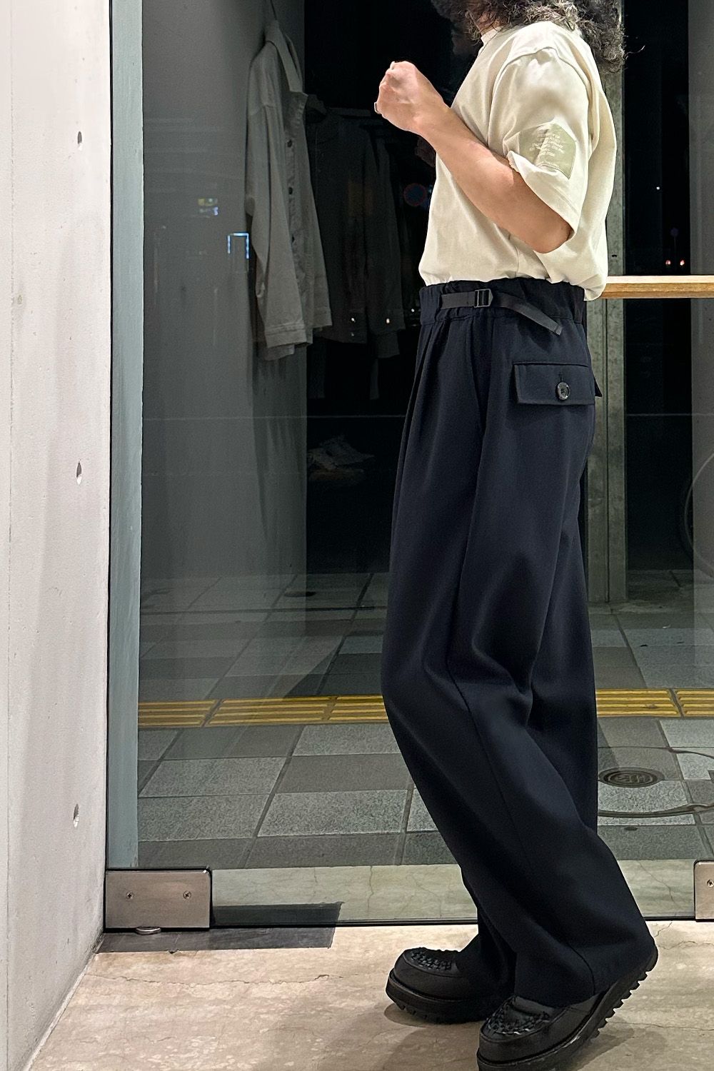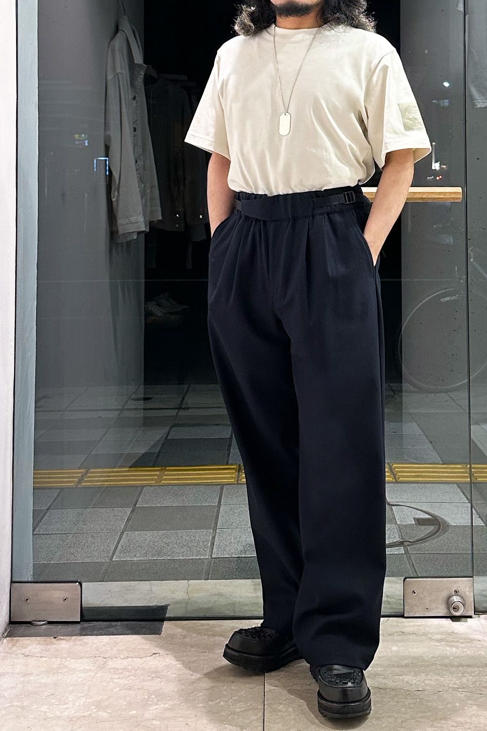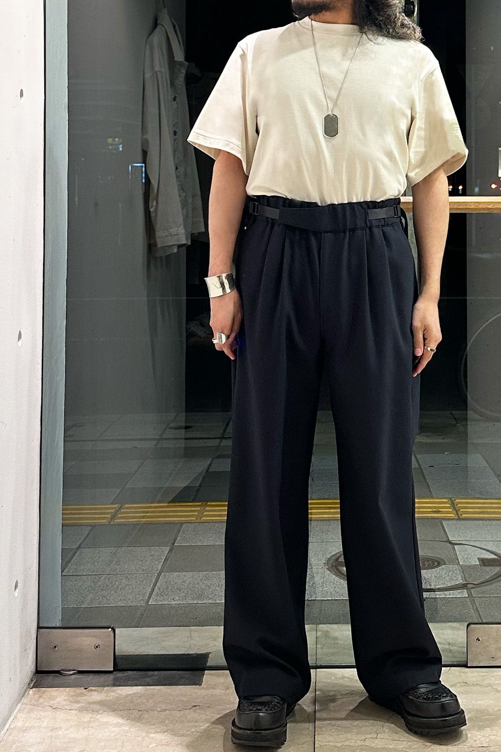 パンツはN.HOOLYWOODのおすすめワイドパンツ、ウエストのパーツがあることでベルトなしで着用可能、またサイドからアジャストができ、着用がとても楽です。コットン100%で通年着用することができるコーディネートの軸になる万能パンツです!