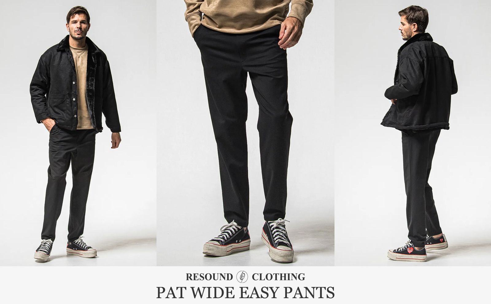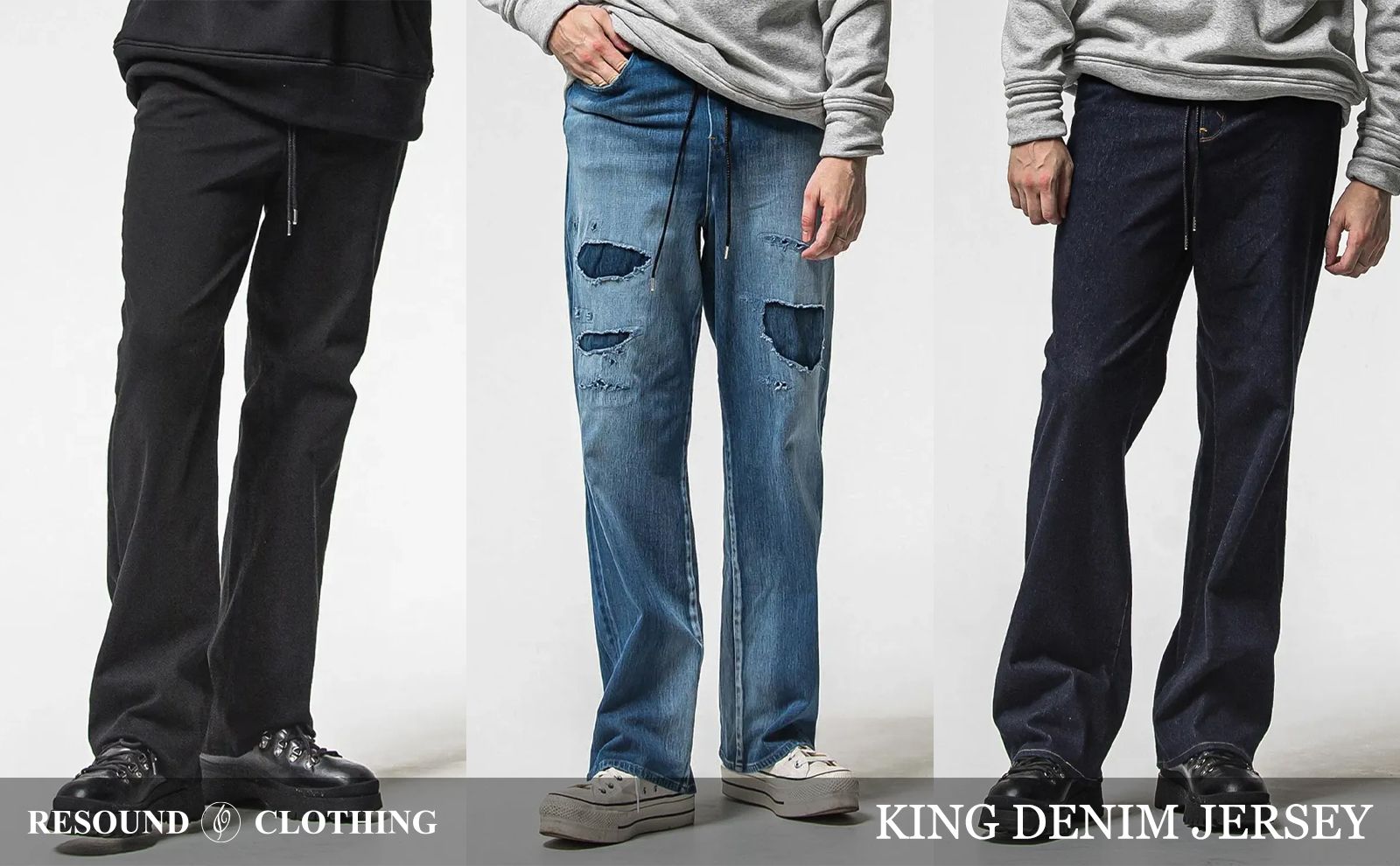 RESOUND CLOTHING、見た目はデニム、穿き心地は軽やかで抜群のストレッチ性からストレスフリー、綺麗めからカジュアルなど幅広いスタイルに対応できる縦長で綺麗なワイドシルエットのジャージーンズ