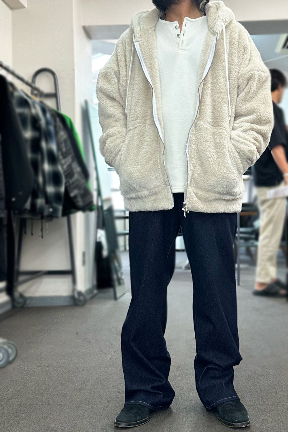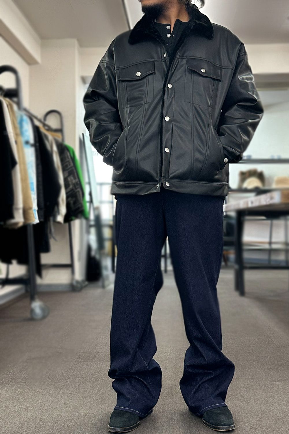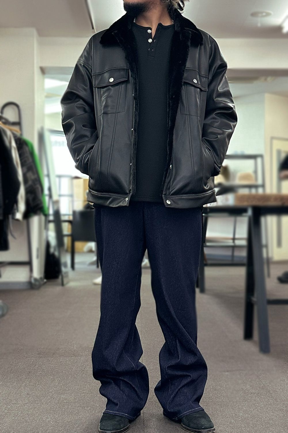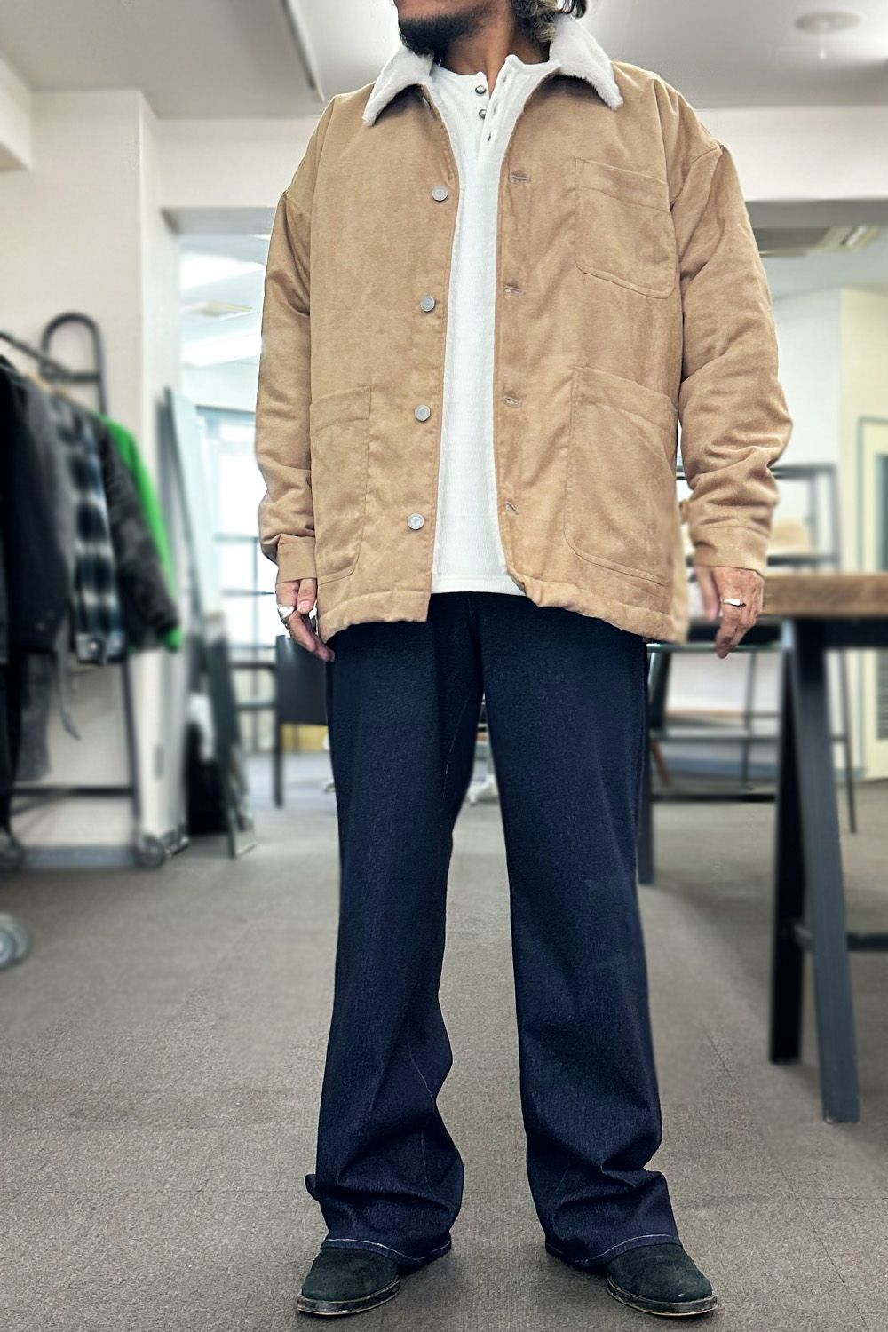 今年の冬におすすめのアウター!リアルレザーのような高品質エコレザー+裏地には保温性抜群のエコファーを備えたムートンジャケットのようなオーバーサイズ3RD G、見た目はしっかりレザーのため重量感がありそうですが、イメージの重さは全くなく、それ以上に軽さよりも着用していただいた時のエコファーのふんわり、あったか感です。手で撫でていたくなるような気持ちよさ、インナーに使用している裏起毛のヘンリーネックと合わせ、インナーとアウターだけで相当暖かいです!男らしく着用したい方にはダークトーンでまとめたり、柔らかいイメージで冬のコーディネートを作りたい方にはベージュやホワイトと。