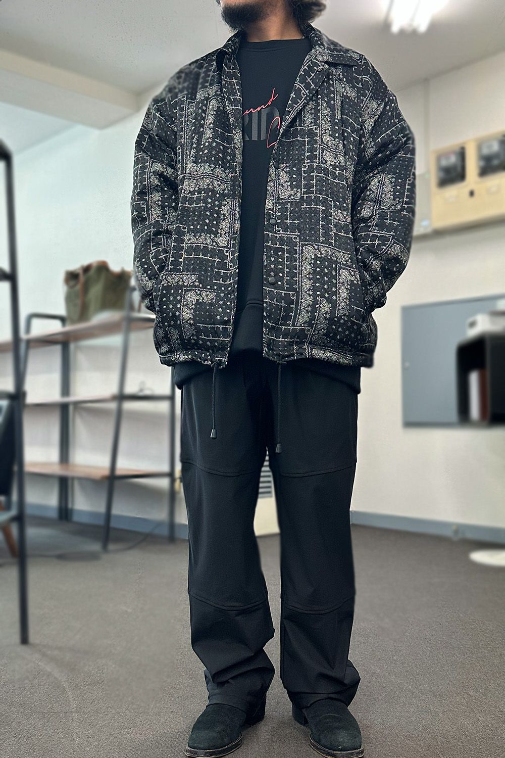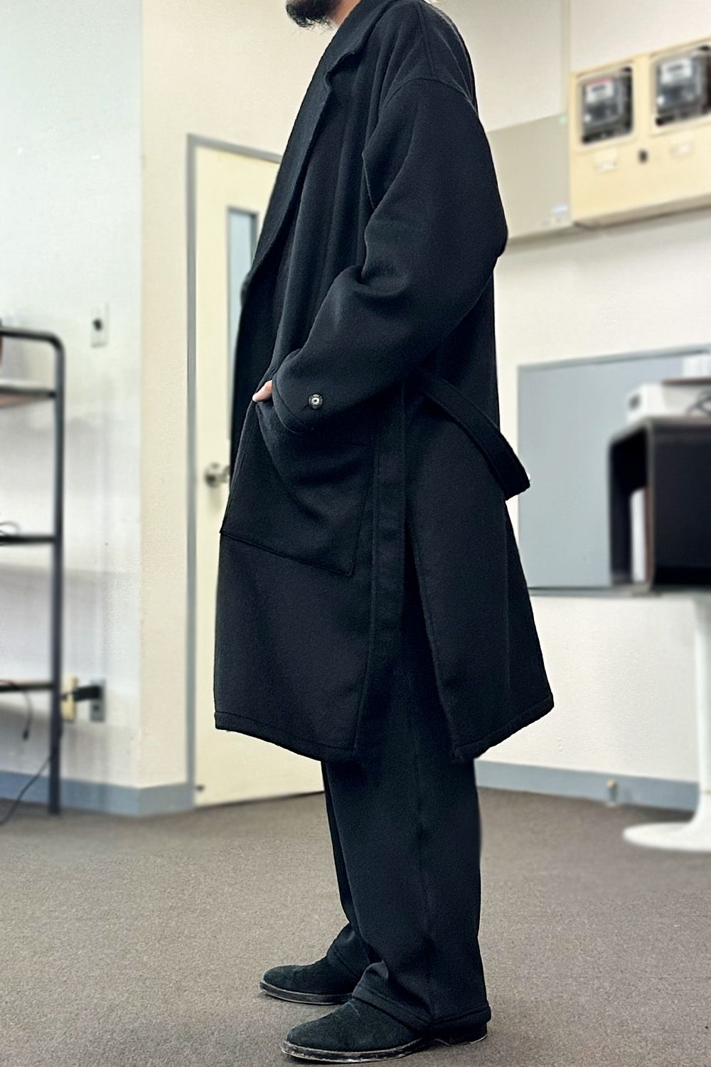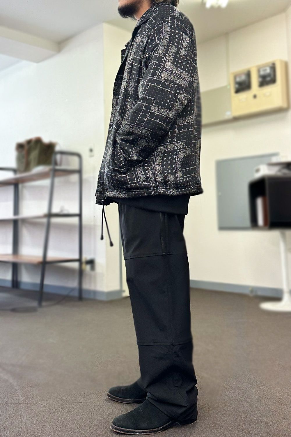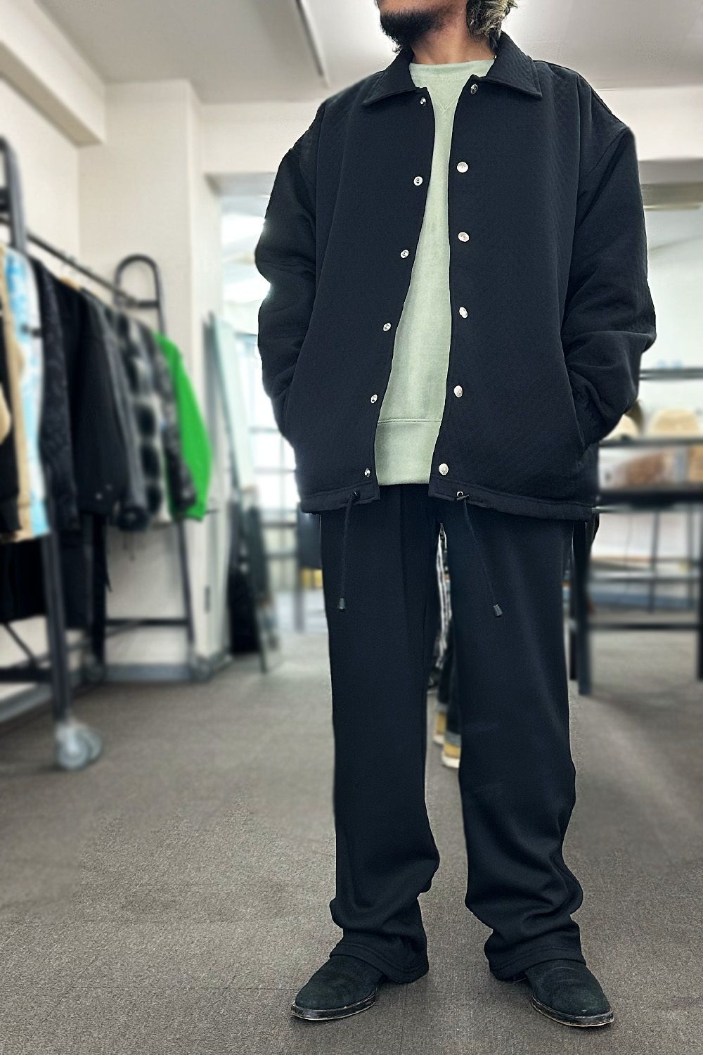 上記の3RD型のブルゾンと同様に、エコファーを裏地に備えたコーチジャケット、表面を光沢感のあるナイロンではなく、上品なキルティングジャガードに、本来はスポーティーなアイテムですが、とても高級感のある仕上がりです。パンツはVELOURS FLEECE WIDE TUCK PANTS、スウェット素材のタックパンツです。上下スウェットでもカジュアルにならない、コーディネートに馴染んでしまえば綺麗なパンツにしか見えません!裏に暖かいフリースを配した楽であったかいパンツ、コートと合わせてもイメージを崩さない、シューズはブーツがよりおすすめです。