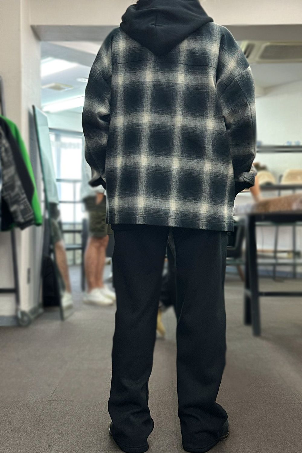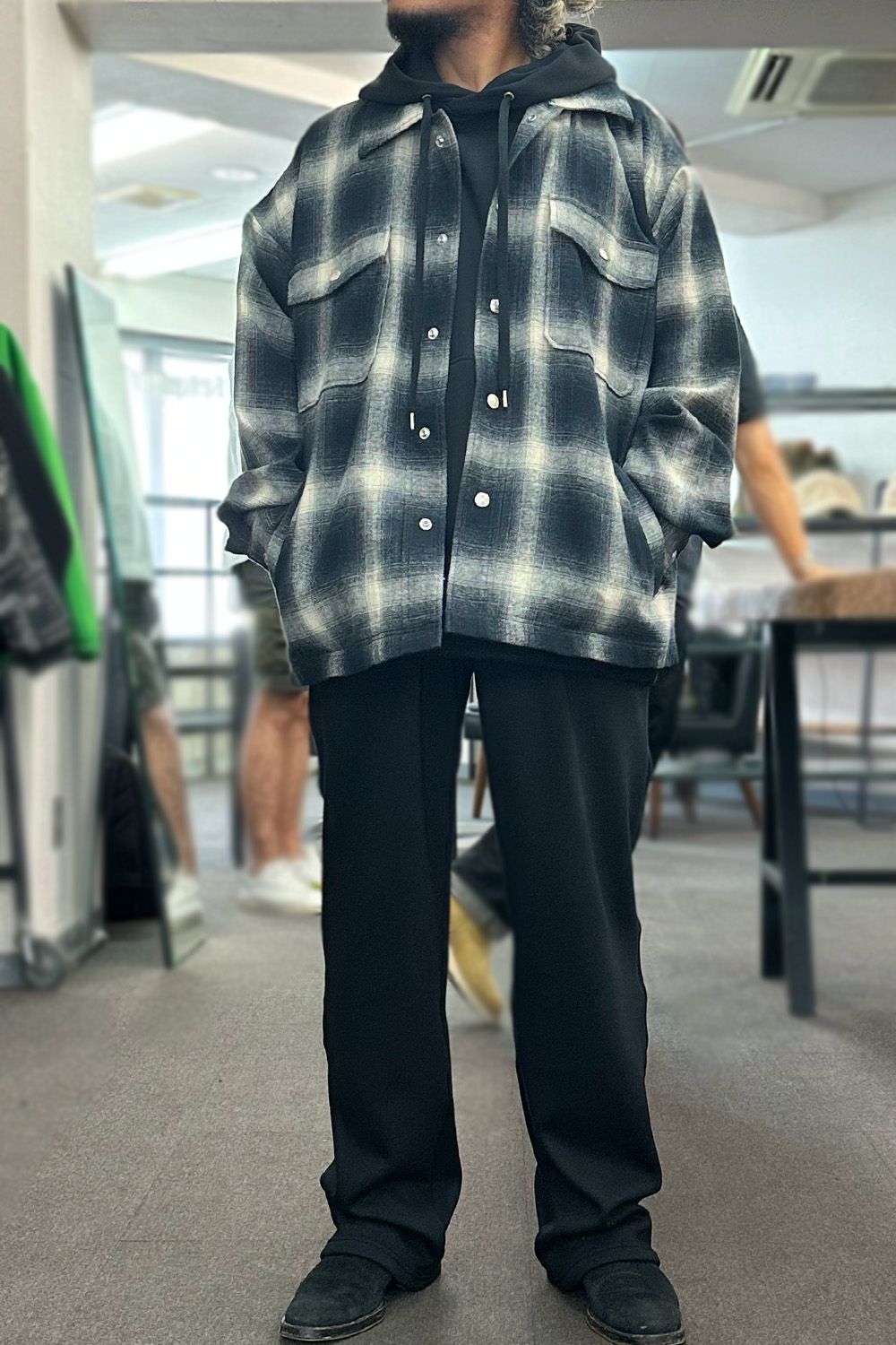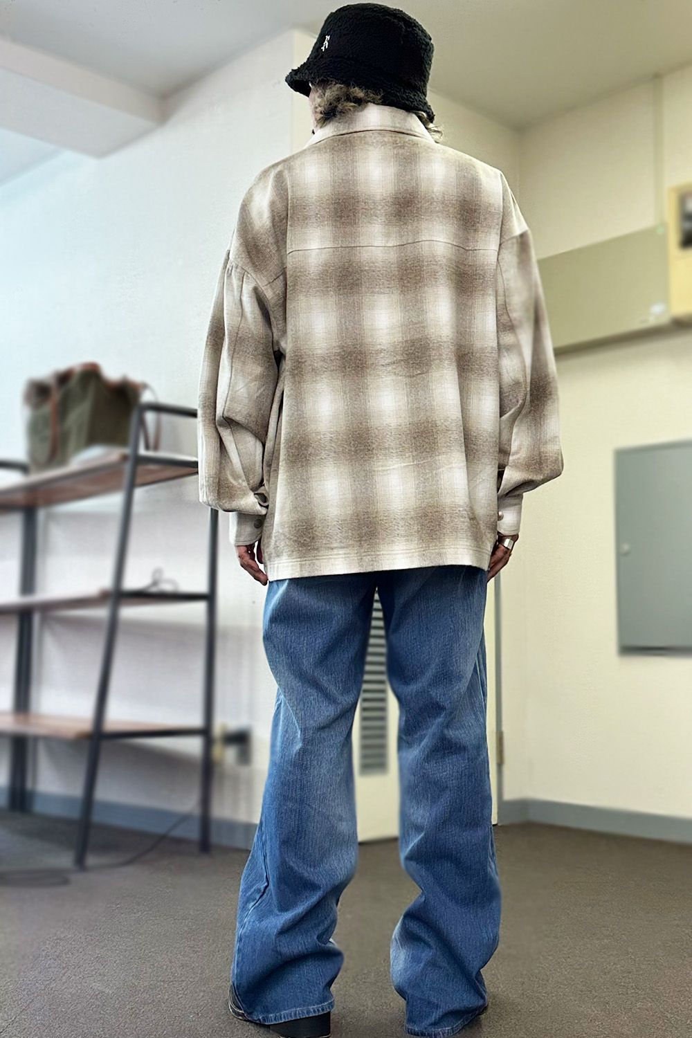 FLANNEL CHECK JK ・・・オーバーサイズでポケット付き、アウターとして使えるシャツはRESOUNDの定番人気アイテム、その時代の流行の生地や見た目、サイズバランスなどを変えながらリリースされ続け、今季はヴィンテージブームということもありクラシカルとナチュラルなデニムと合わせたい気分だと思います。ブラウンのチェックシャツはそんなイメージのチェックシャツとKINGシルエットのデニムジャージ、バケットハットでややストリート感をプラスしています。ブラックの方はインナーはパーカ、カジュアルになりすぎたくない大人のイメージでスラックスのように見えるスウェットタックパンツを合わせてリラックスした着心地ですが見た目はカッコよく!