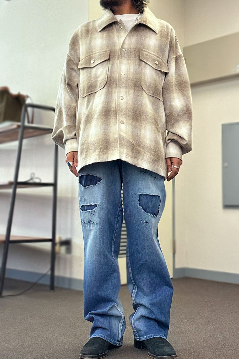 オンブレチェックシャツにジャケットの要素をプラス、オーバーサイズシルエットでシャツとしての着用からパーカなどと組み合わせたアウター感覚の着用も可能とした便利なアイテムです。