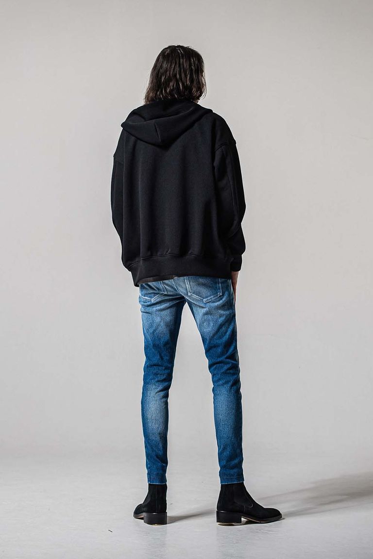 ヘビーウェイト(12オンス)綿糸引き揃えで高密度通常の4から5倍の太いストレッチ素材"LYCRA"を高混率で使用したハイパーストレッチ。