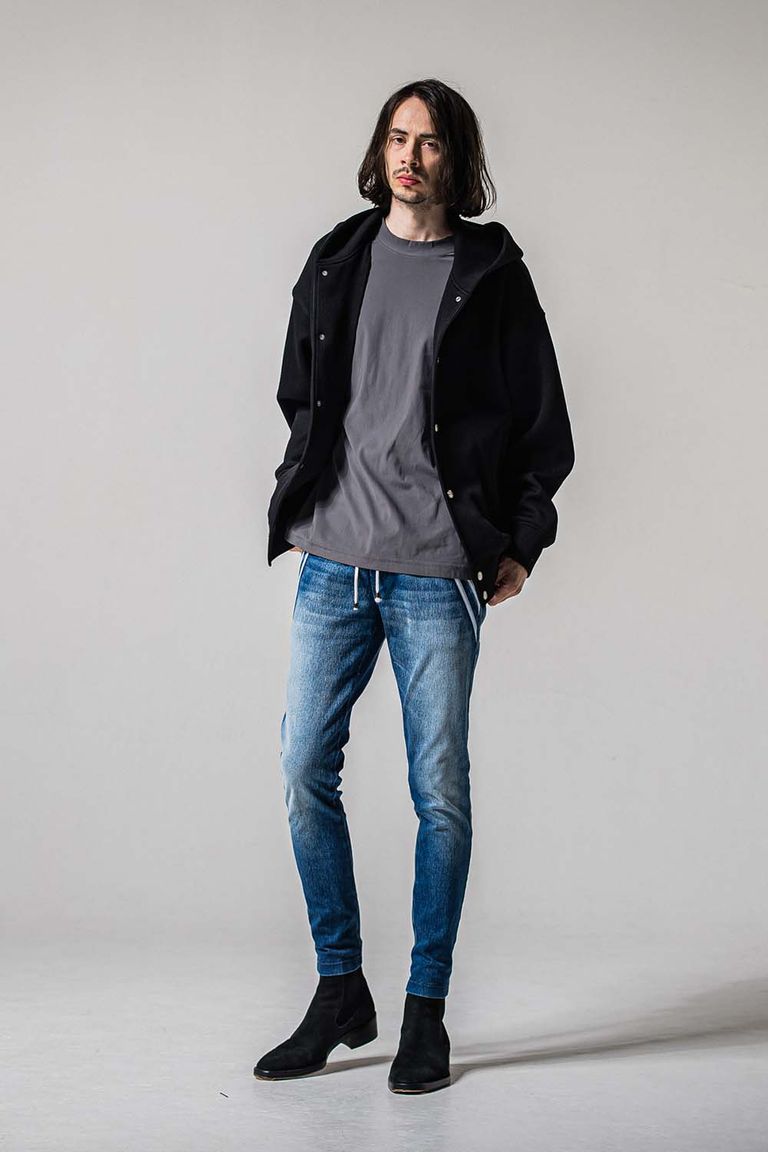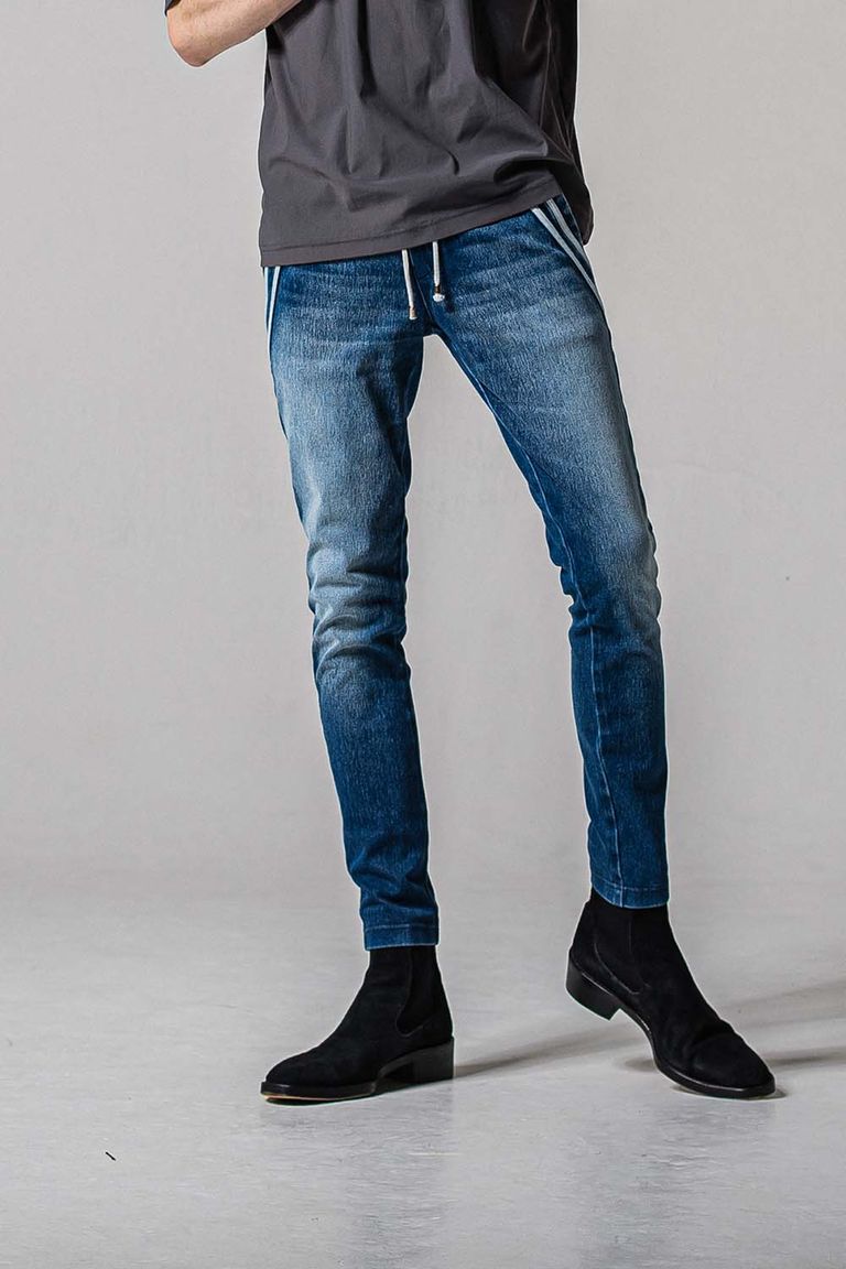エッジの効いたスラッシュポケットに合わせダブルラインを入れたエッジラインパンツのデニムジャージバージョン。
