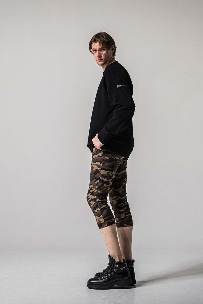 スタイリッシュなもたつきのない腿周り、切り返しで裾も絞り込まれています。
