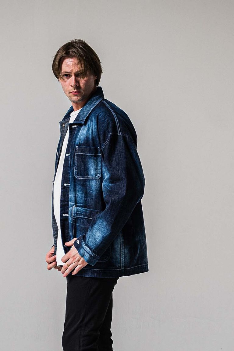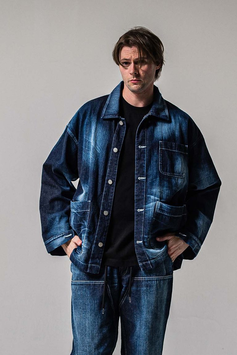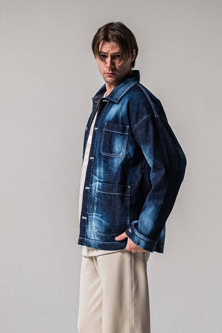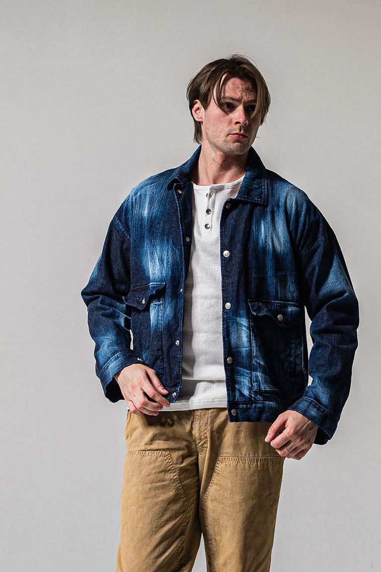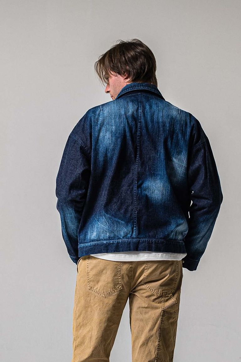 徳島県で本藍ロープ染色を施し、リアルなヴィンテージ感とアタリを楽しめるように横糸をルーズに織り、柔らかく着心地の良い生地に仕上げられています。