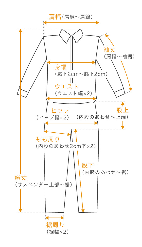 | サイズ | 肩幅 | 身幅 | 背丈 | 袖丈 | 渡り | 股下 | 裾巾 |