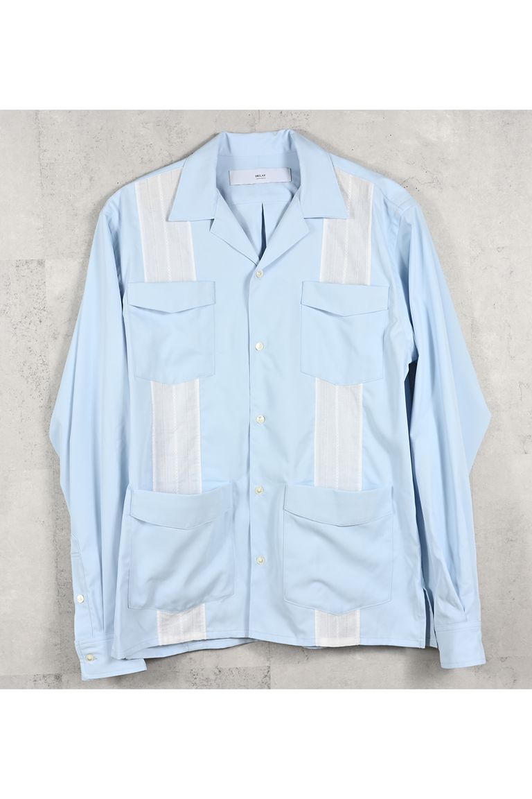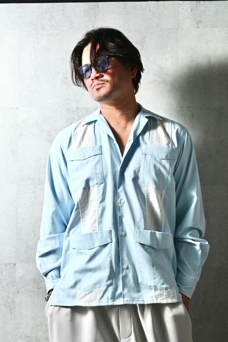 キューバシャツによく見られるプリーツや刺繍ではなく、切り返しのカラミ織りでロープ状のストライプ柄を表現。