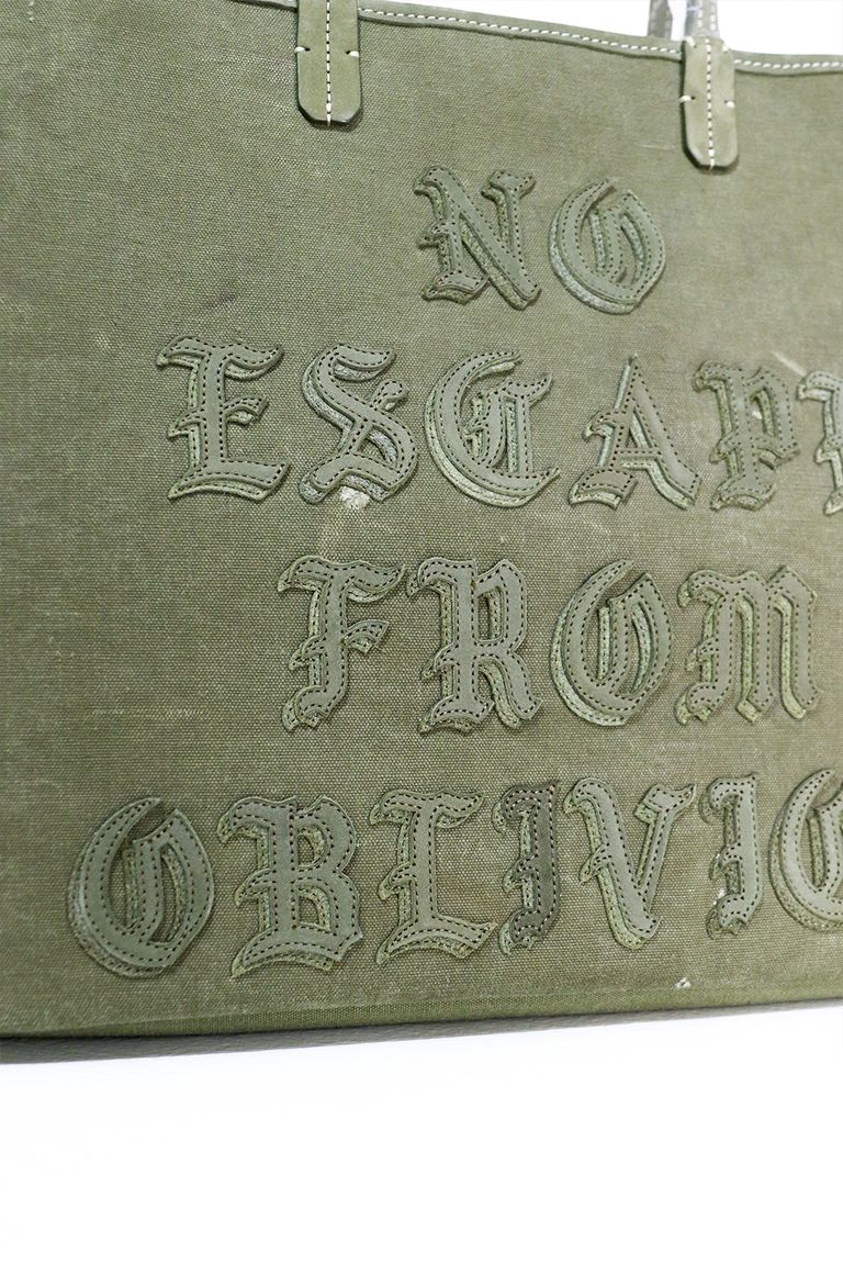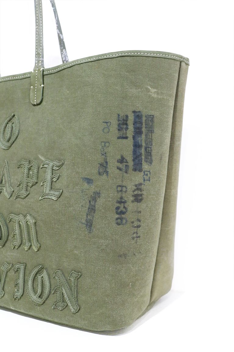 VINTAGE COTTON MADE FROM VINTAGE US ARMY DUFFLEBAG生地使用、Cari氏の個性的なフォントが特徴的なレザーのロゴと立体感のある二重のフォントを使用したメッセージを配した特別なモデル