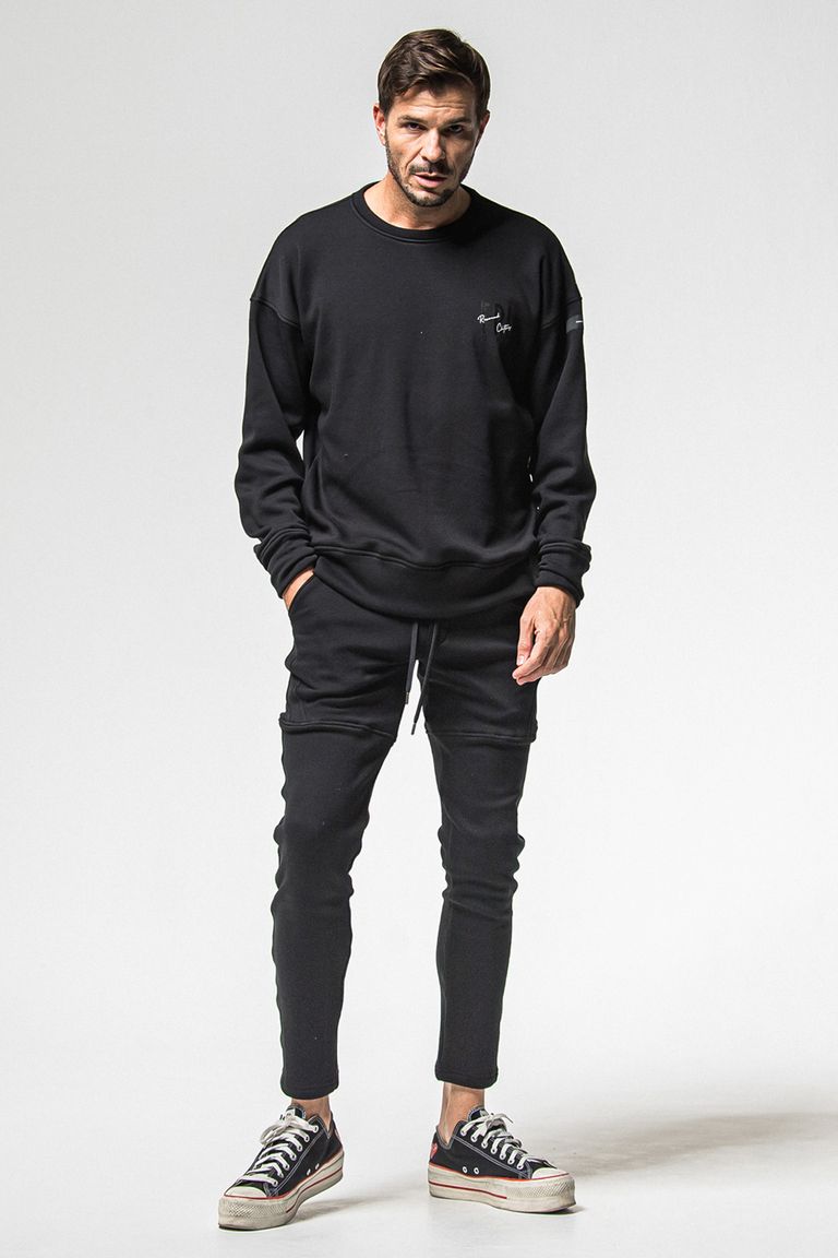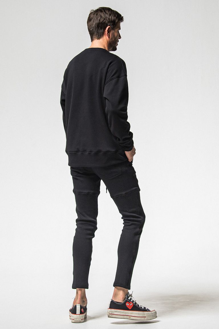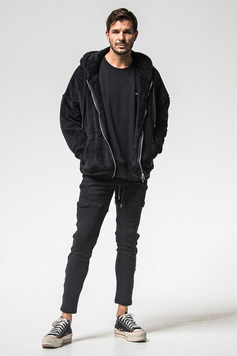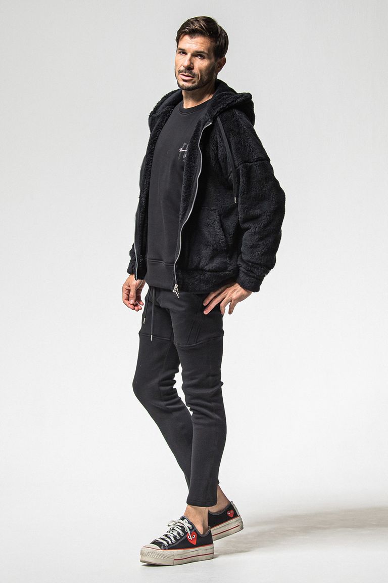 素材はイタリアの織り機を基に最新型織り機を用い、スウェットとポンチローマを掛け合わせたダブル編みで、表面は度詰めで織り上げ糸はエジプトからコットンを紡績し、裏は特殊起毛シルキータッチなベロアフリースボアに仕上がっています。