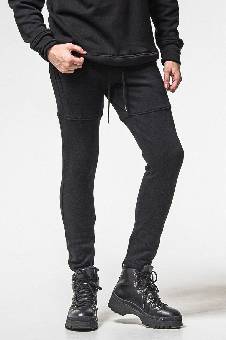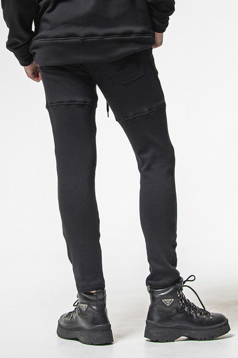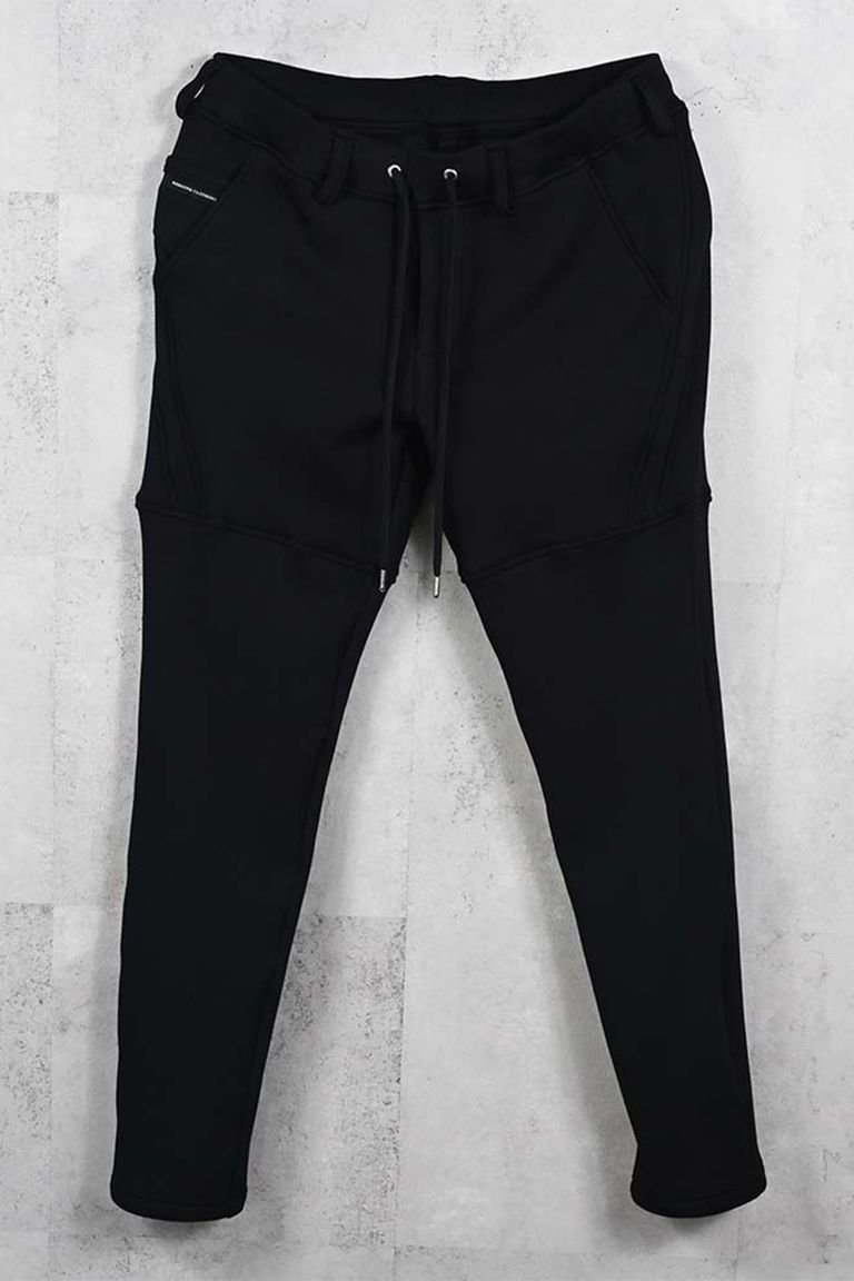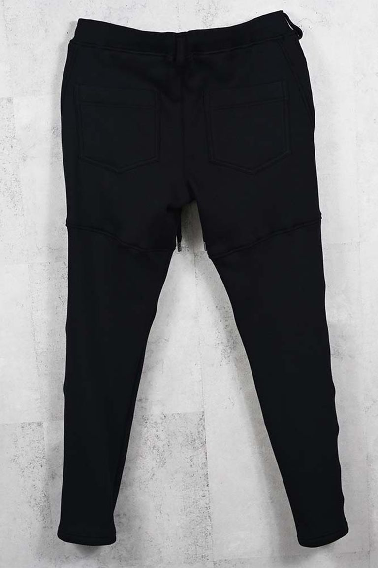 定番のスラックス型のシルエットをベースに、膝までのサイドラインは、バックからフロントに立体裁断とサイドラインをエコレザーを切り返し表現。