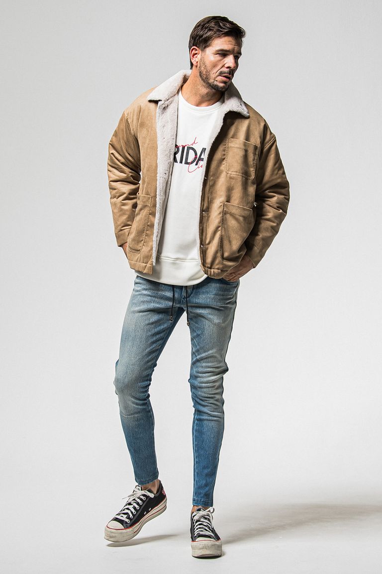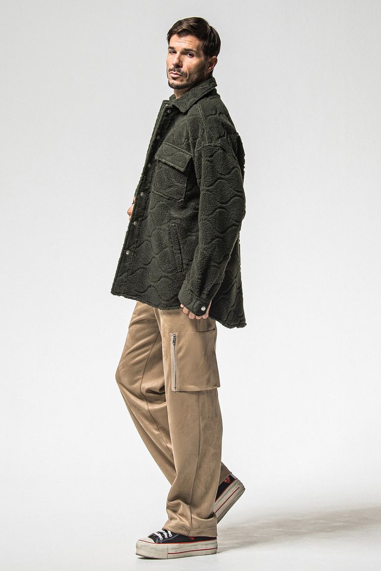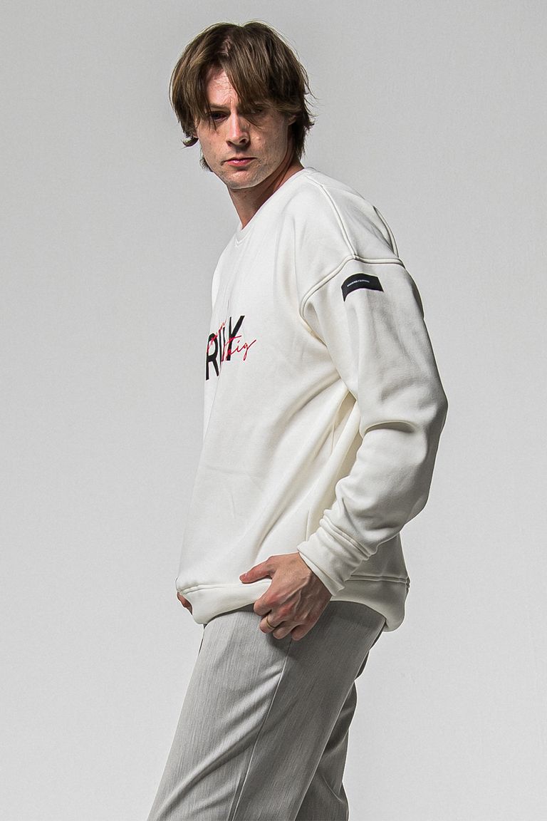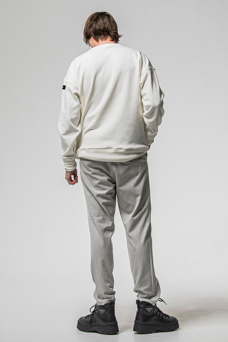 素材はイタリアの織り機を基に最新型織り機を用い、スウェットとポンチローマを掛け合わせたダブル編みで、表面は度詰めで織り上げ糸はエジプトからコットンを紡績し、裏は特殊起毛シルキータッチなベロアフリースボアに仕上がっています。