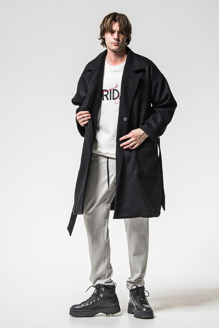 着丈がやや長めで、絶妙に絞ったウエスト、立体感のあるアーム、肩にダーツを入れるなど、オーバーシルエットながら綺麗なパターンメイク。