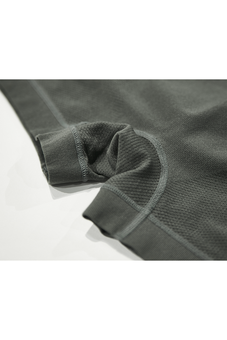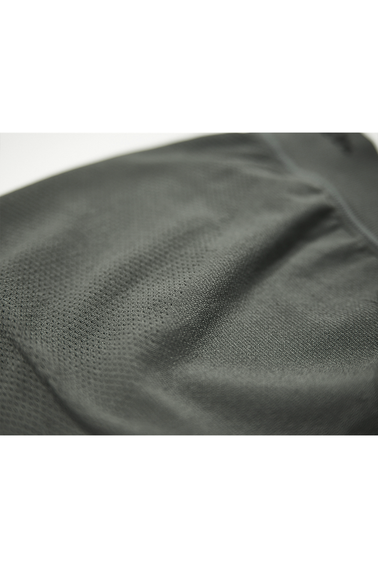 センター部分は透けにくい高密度のメッシュ、その他の部分には通気性や速乾性を高めるやや大きな編み地のメッシュを使い分けた仕様。