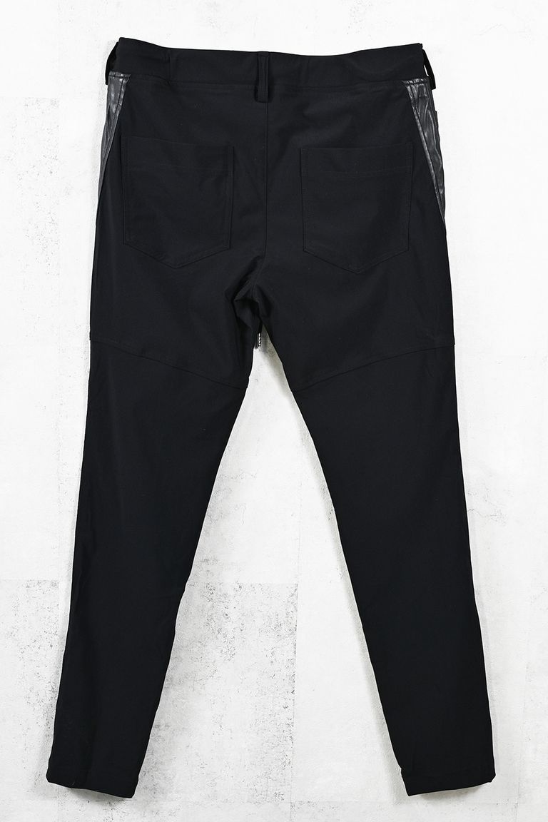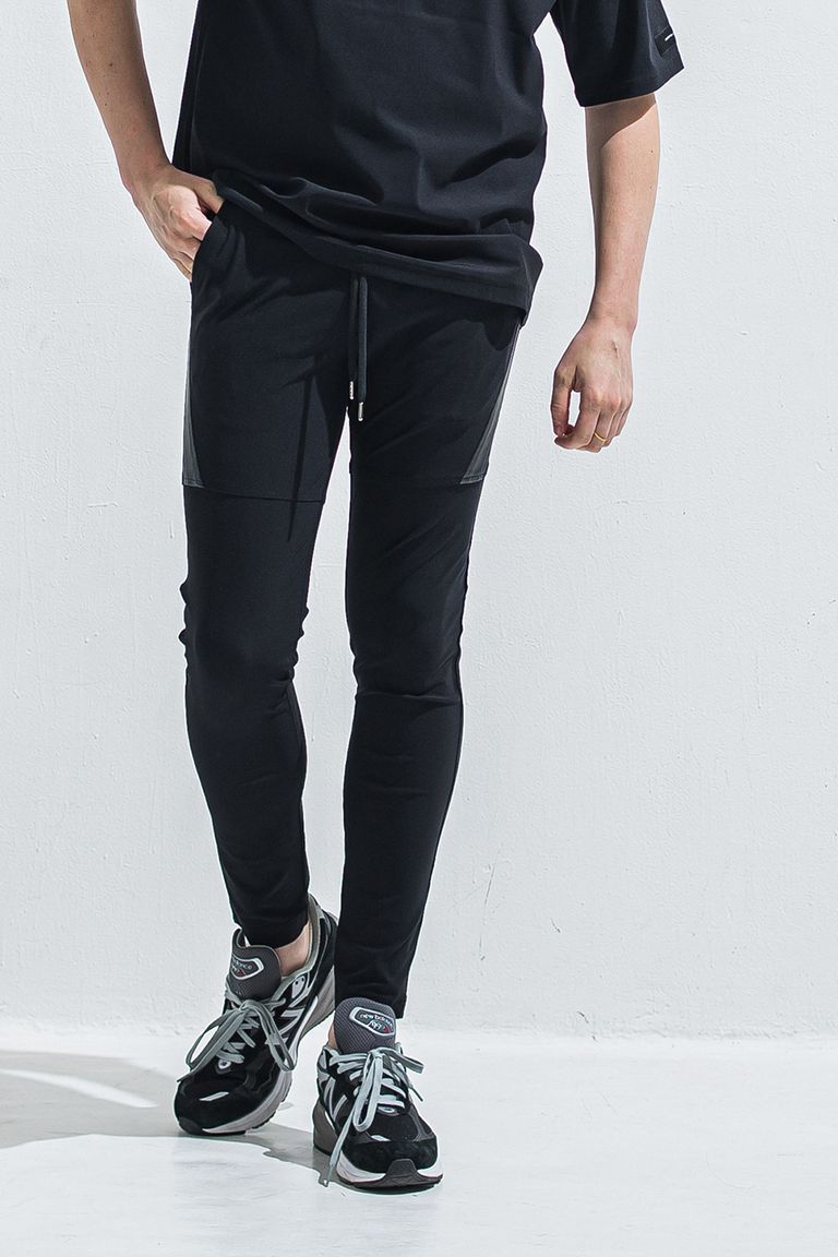 定番のスラックス型のシルエットをベースに、バックからフロントへの立体裁断とサイドラインをエコレザーの切り返しで表現。